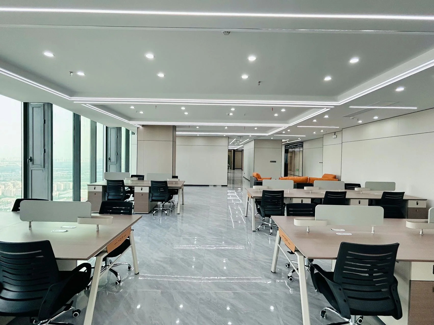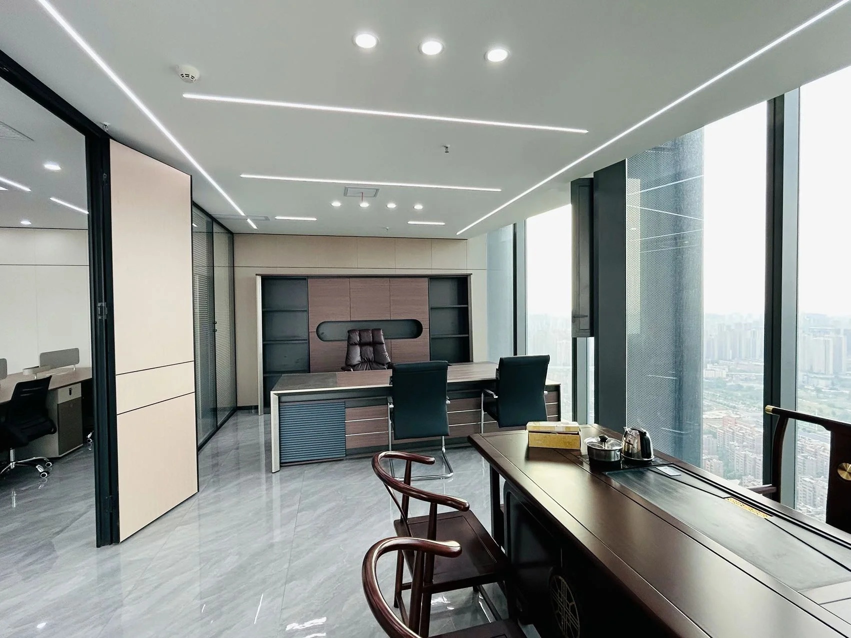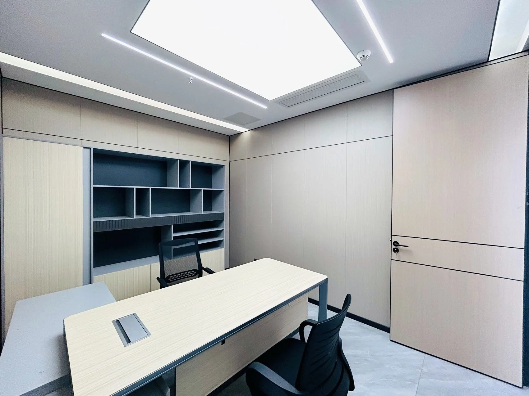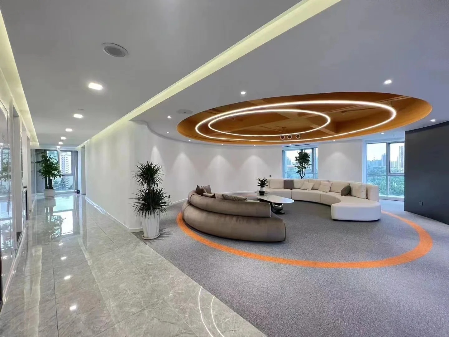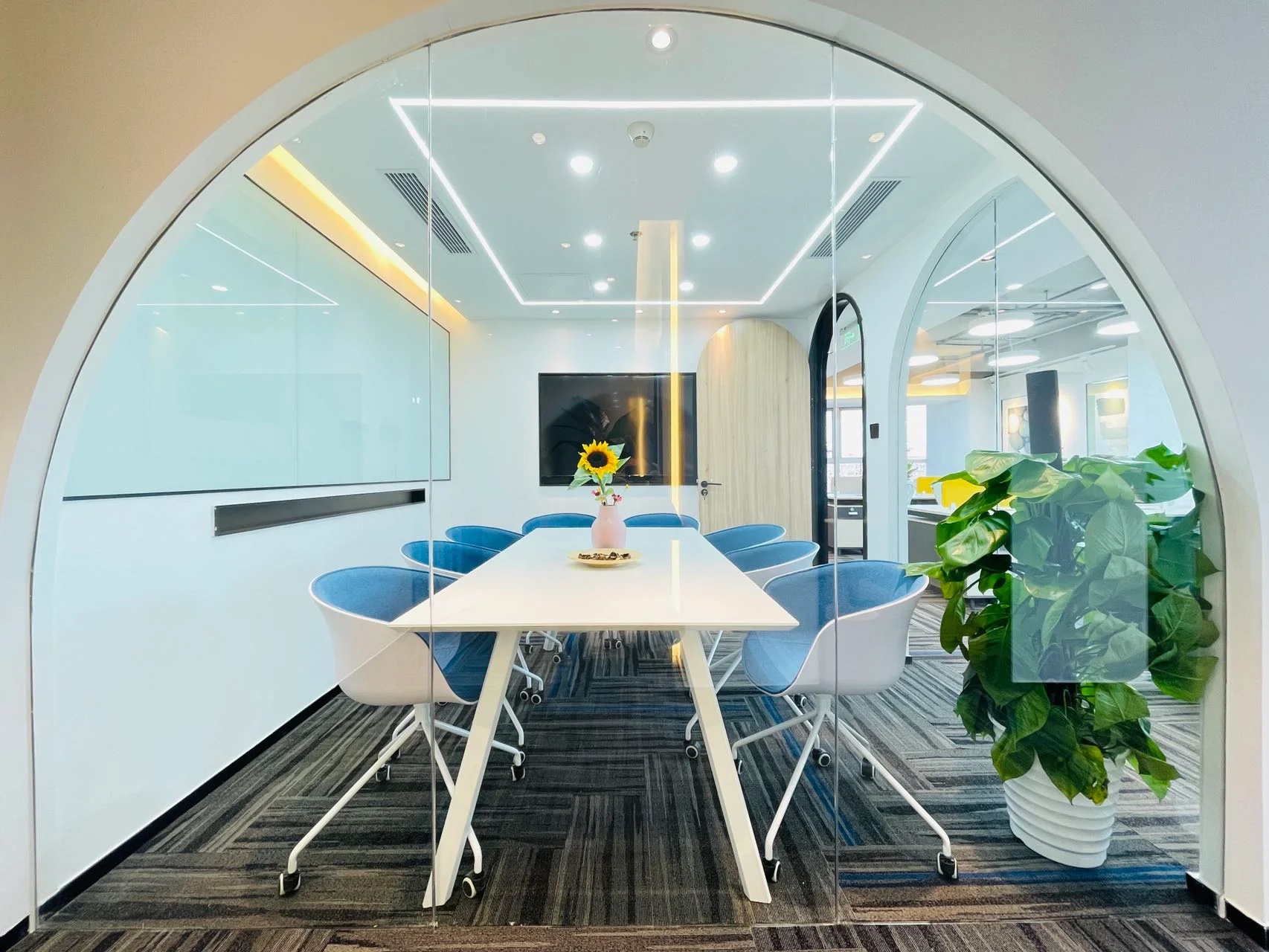 天圆地方的设计理念,全新装修简约时尚!精心设计、定制家具配备全齐,房间内均采用单层钢化玻璃到顶隔断。给您一种氛围式的办公体验。