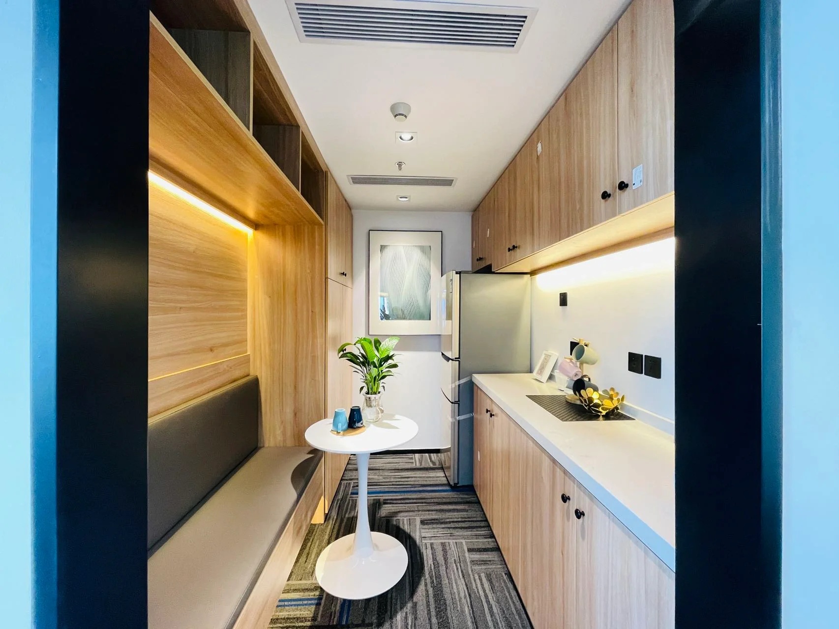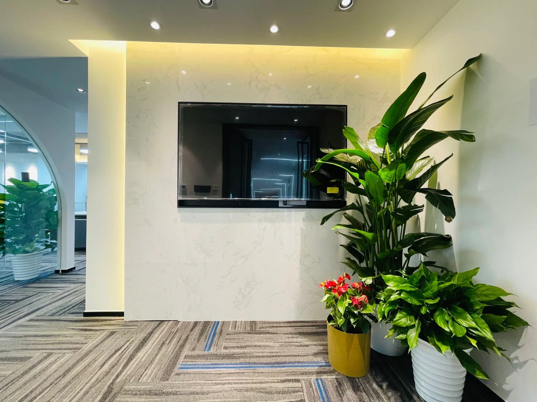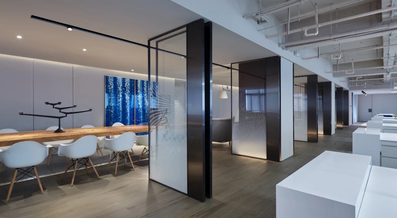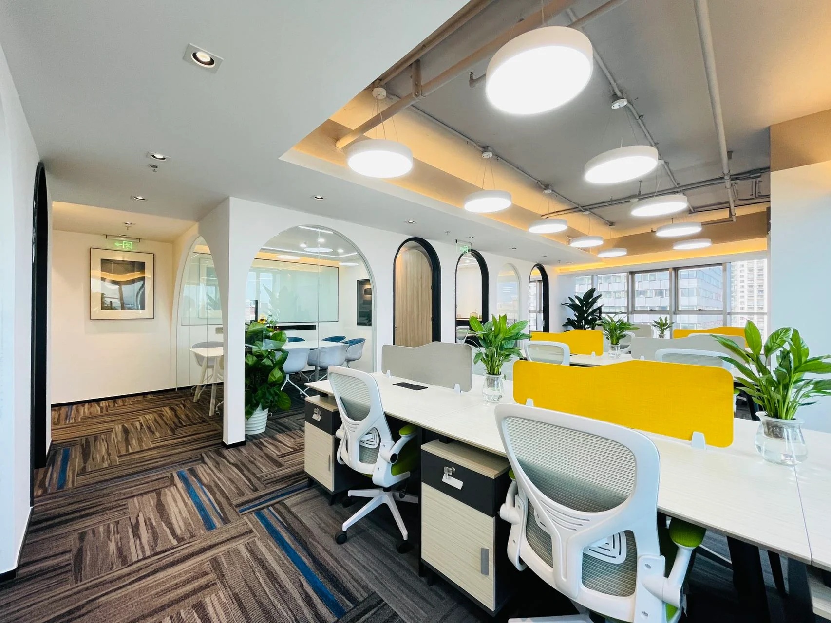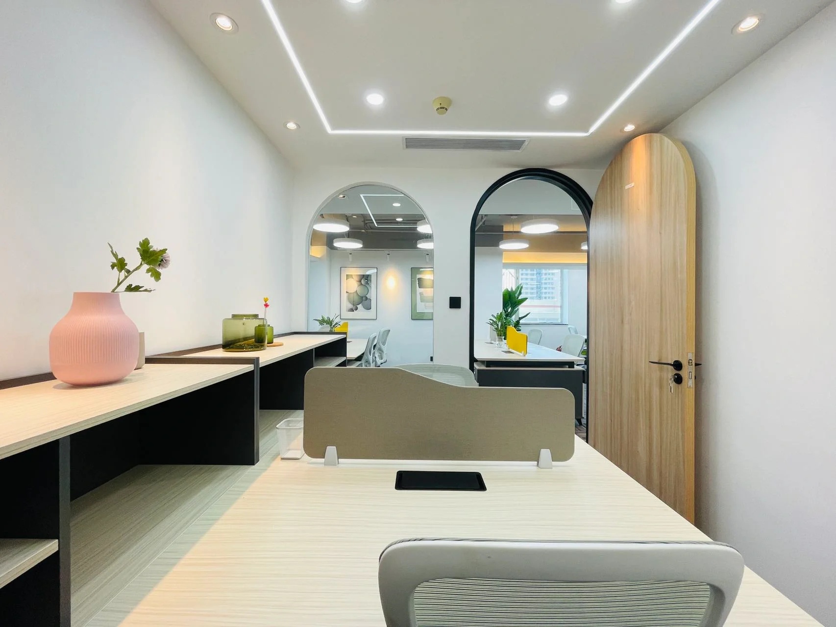 天圆地方的设计理念,全新装修简约时尚!精心设计、定制家具配备全齐,房间内均采用单层钢化玻璃到顶隔断。给您一种氛围式的办公体验。