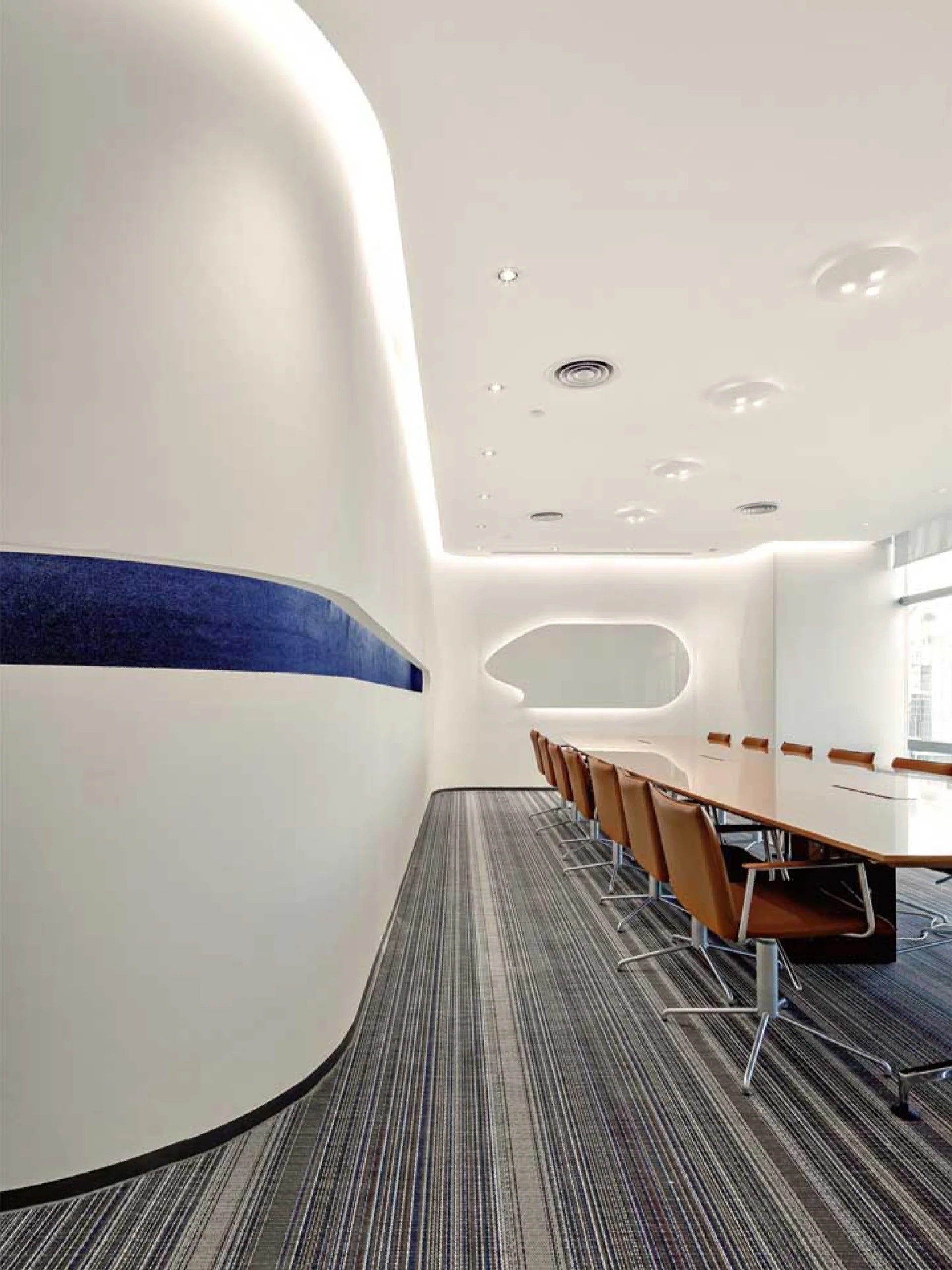 “回形空间”办公设计空间以白色为基调,同时呈现平整,树皮纹,方格纹,斜拼砖纹四种不同的质感。白色与木色的划分丰富了空间的层次感,黄色与蓝色的点缀则增加了空间的生机和活力。设计师打破了原本沉闷的工作环境,结合超高层高、裸露的天花留白和工业感的吊灯,重新创造一个明亮开阔的空间,为员工营造一个愉悦的工作环境。