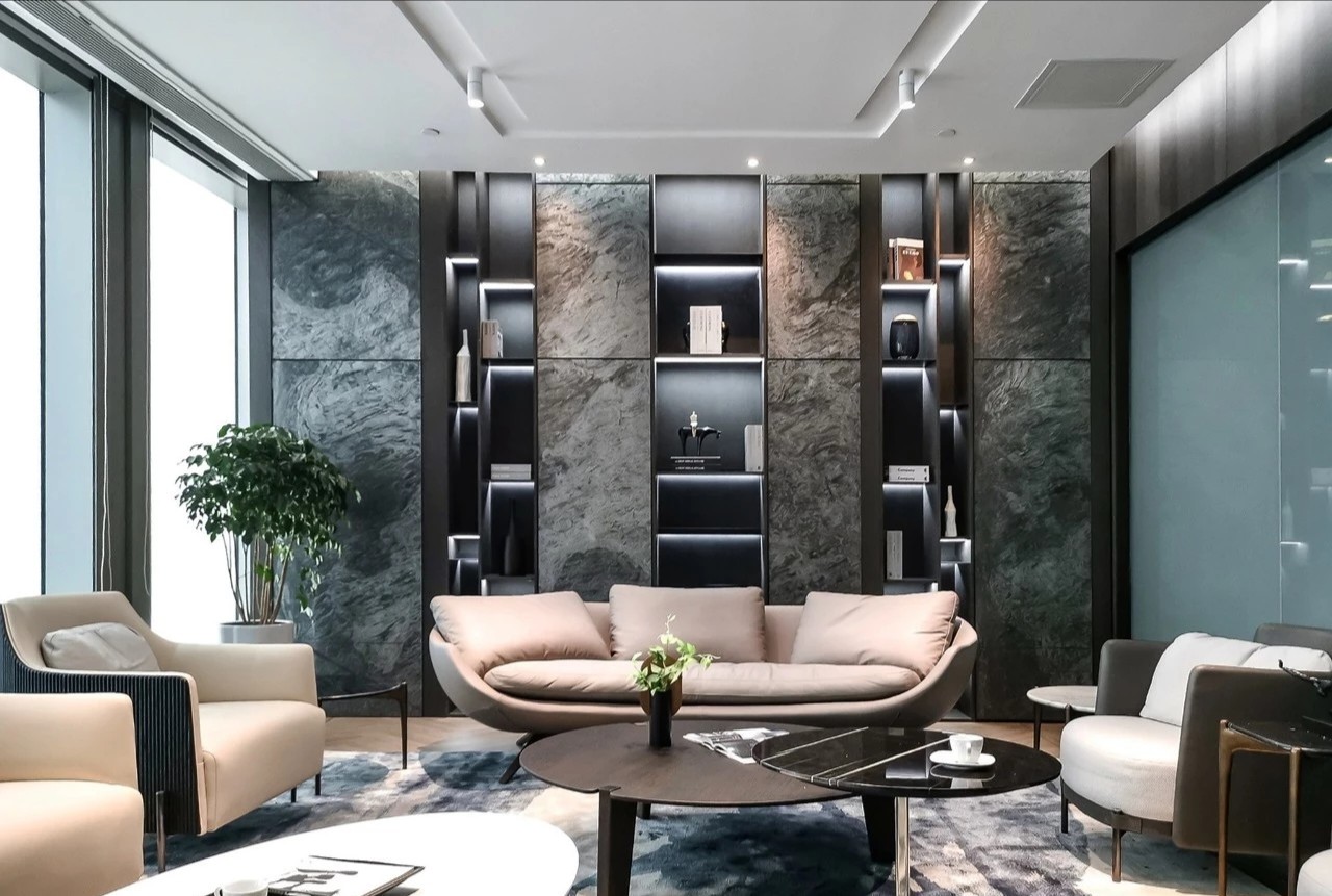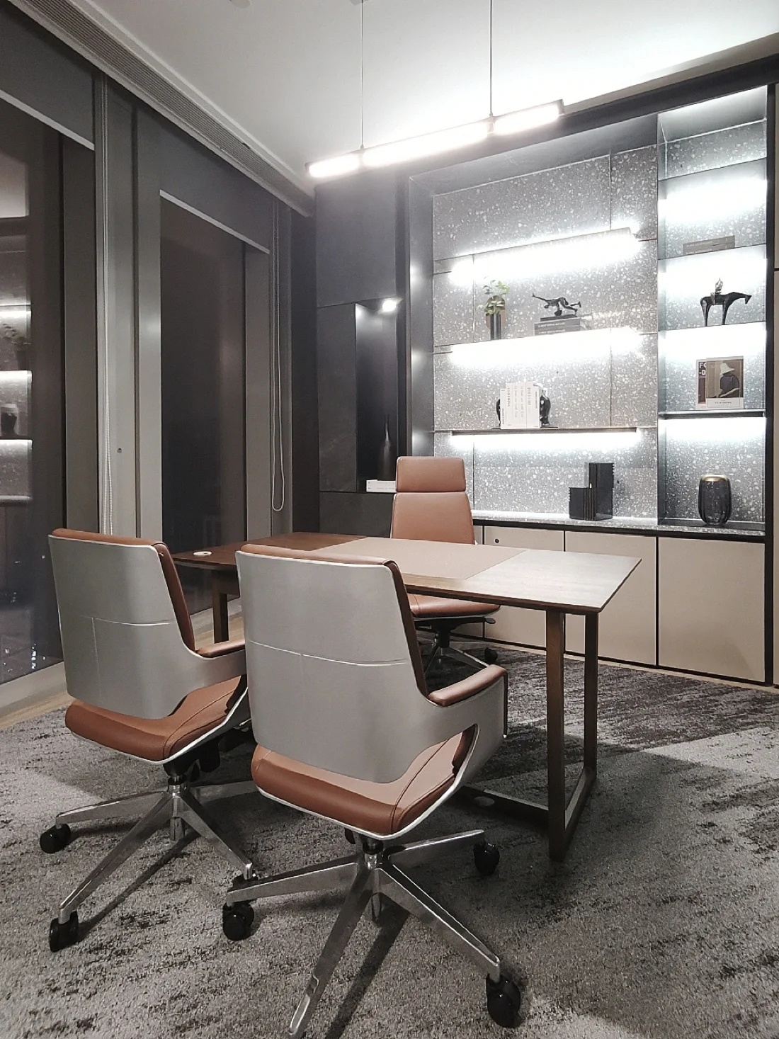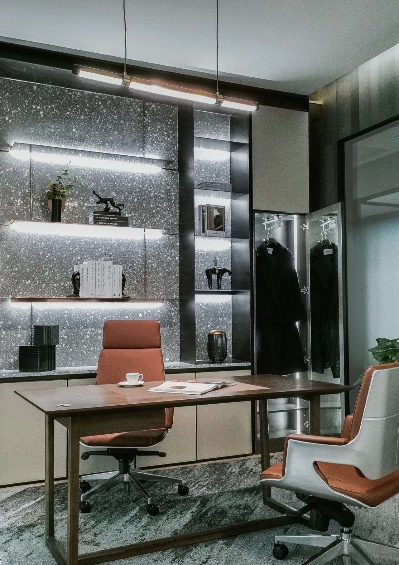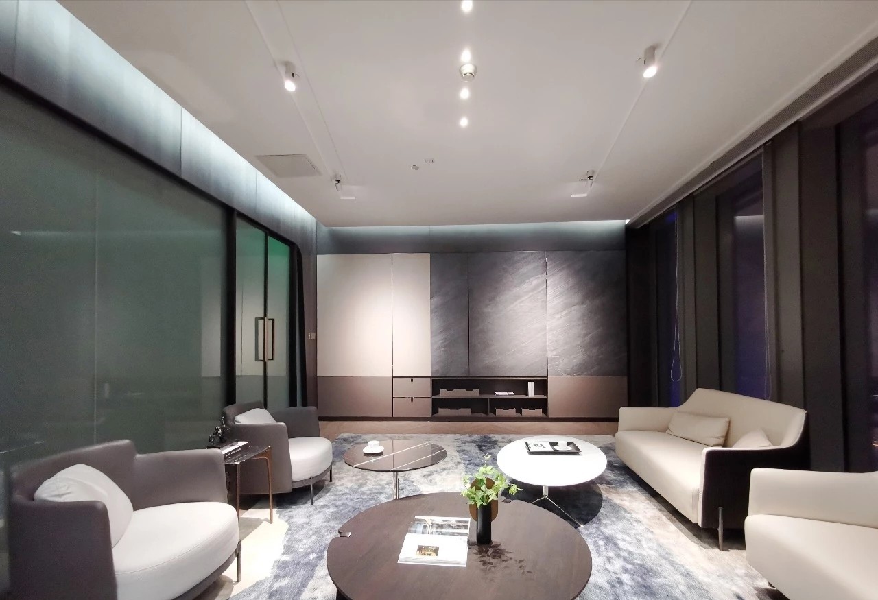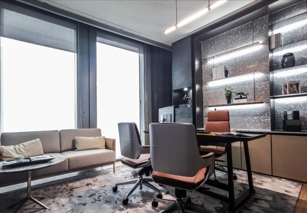 办公室设计| 设计理念:精致的设计和精心的编排并非奢华的代名词,物质世界中真正的奢华,应该更安静而经得起时间的打磨。-简洁的纵向线,岩板的大面积运用,即保证了空间简洁美学,细节之处也不失精细考究的设计处理,朴素材料的细微差别和它们的质感使构成空间简洁的元素,在这里空间本身得到了表现。-用柔和的方式展示对比本身,抛开一切外在诠释,追寻最纯粹的“艺术原点”。平静的色彩,简单的布局,展现简约、高级感的同时,也使体验更为栩栩如生,直击内心。