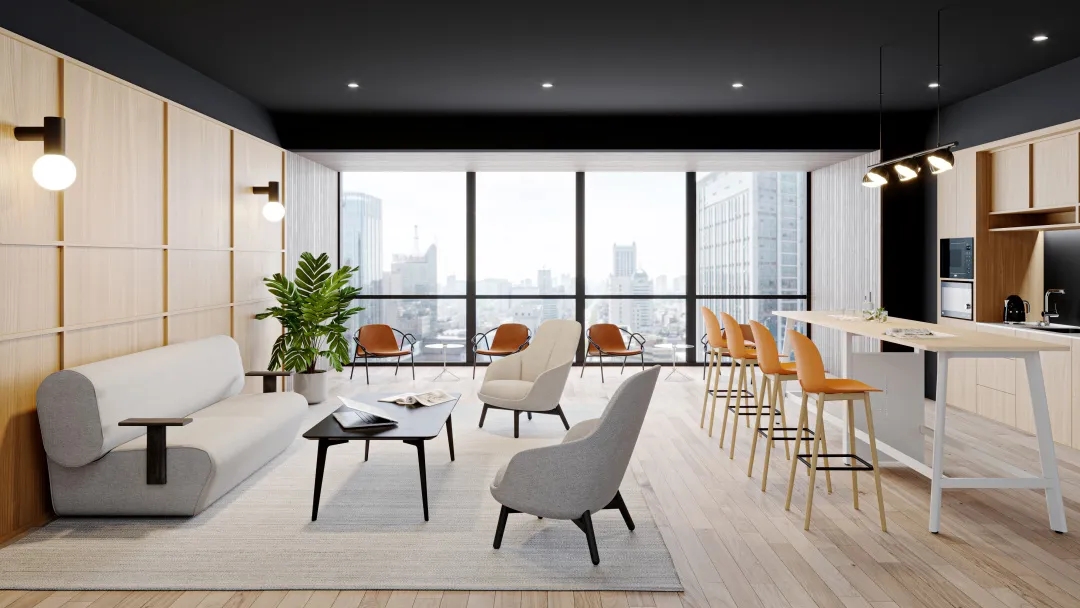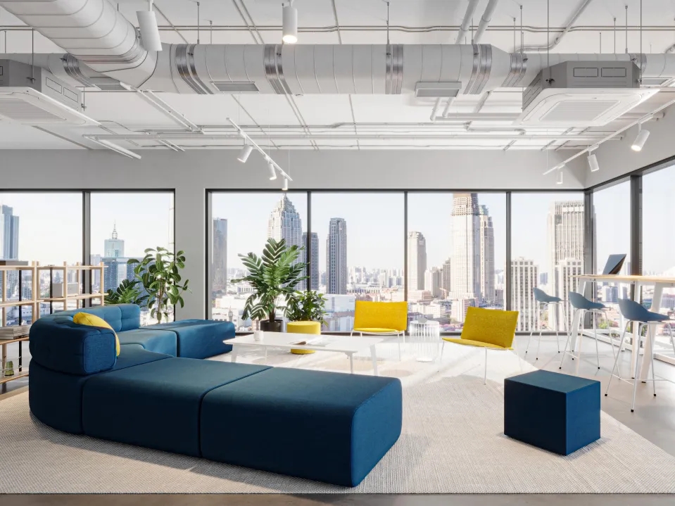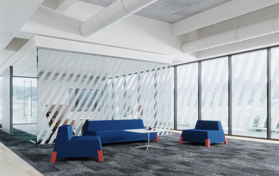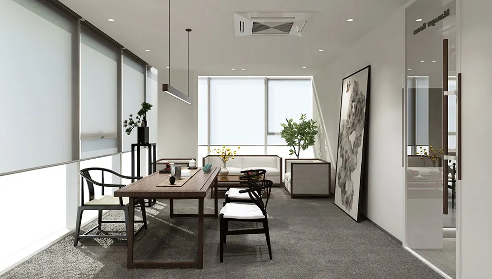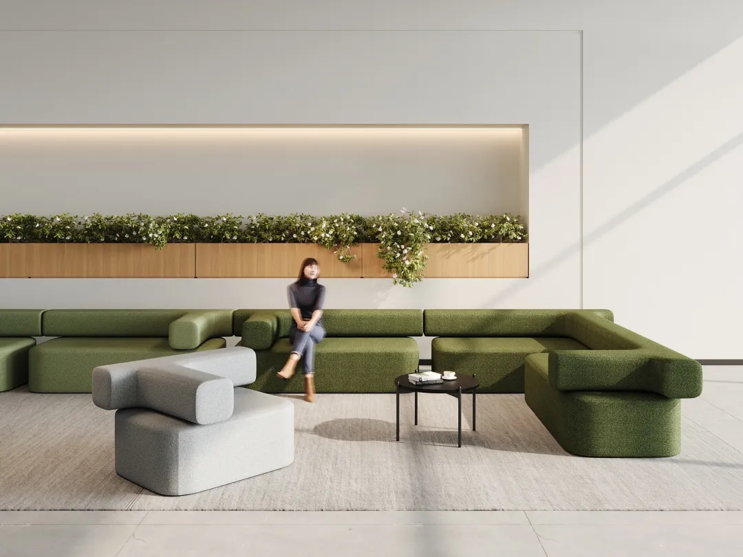 以迎客松生长的造型寓意罗曼斯和奋达科技强强联合的背景下欣欣向荣,茁壮成长的愿景结合左青右白的风水格局,通过北欧现代简约的科技感设计风格营造入口氛围,并且适合取景拍照.