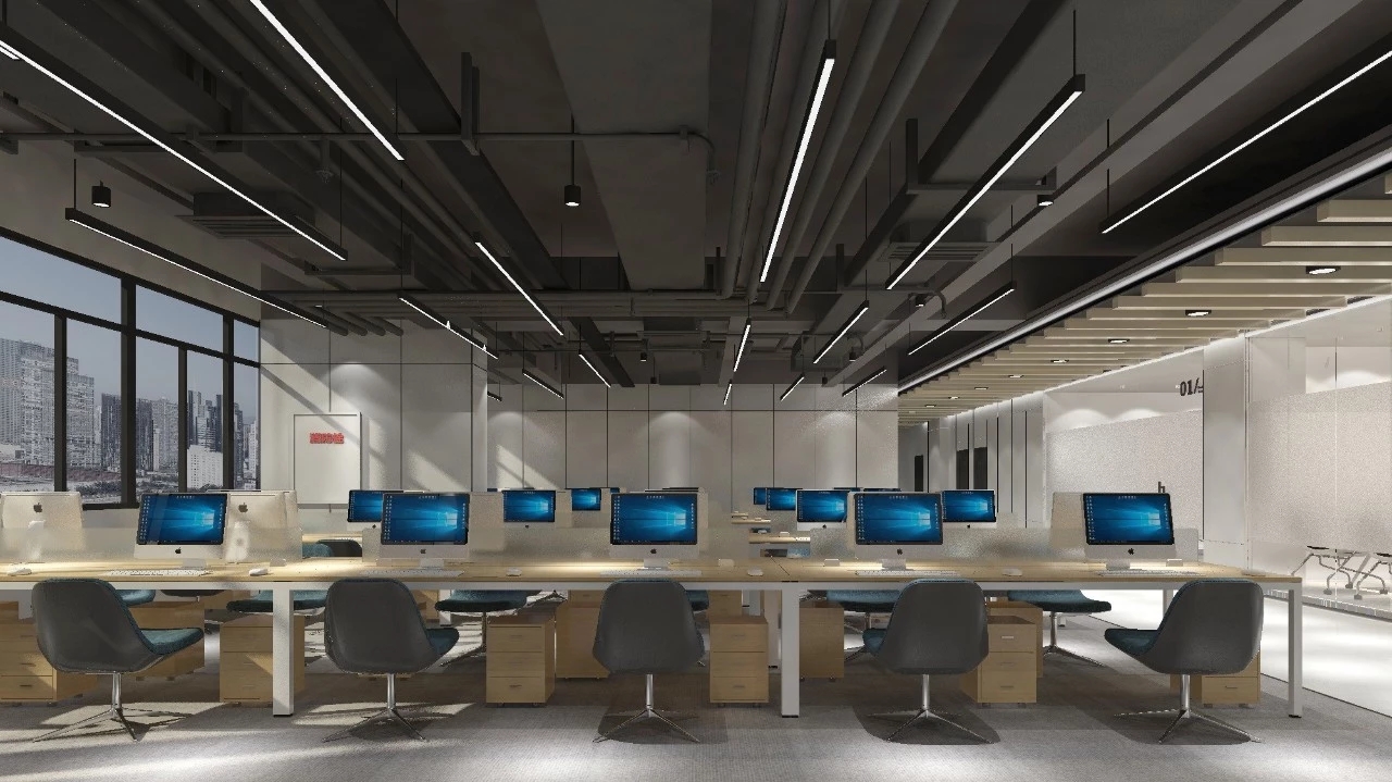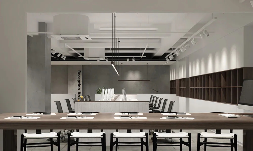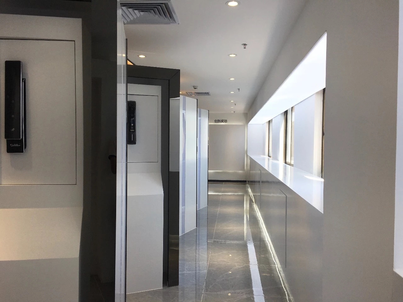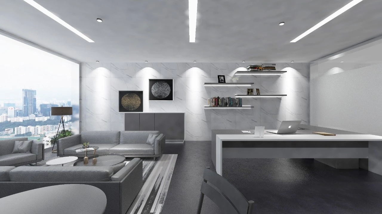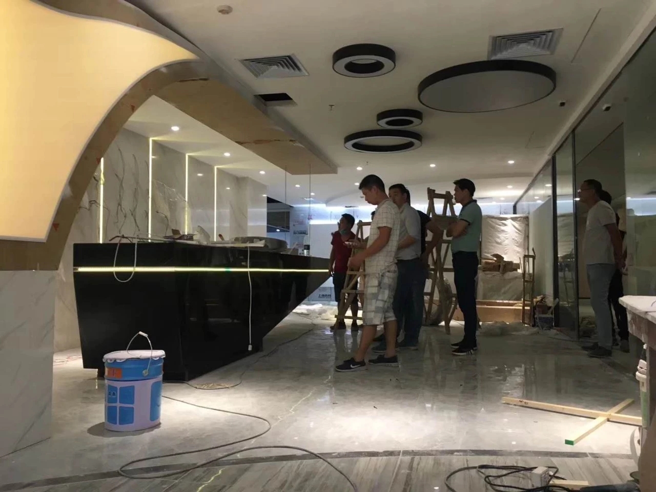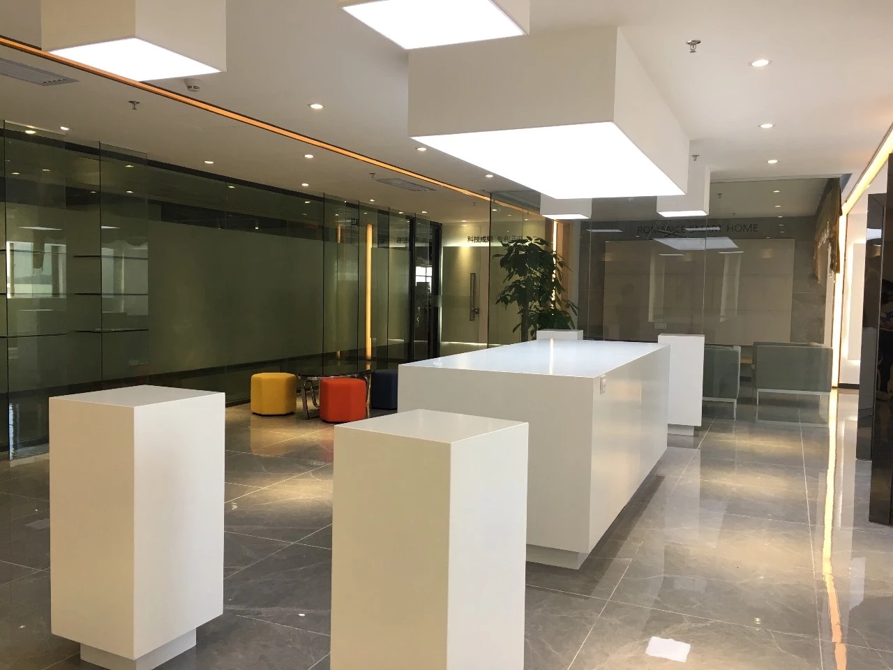 简约不失视觉冲击力的前台斜面立体造型跃然眼前,黑金石结合LED灯和爵士白大理石背景墙相互呼应,给人以格调不失力量,将公司的科技创新,奋发向上的文化深刻表达了出来