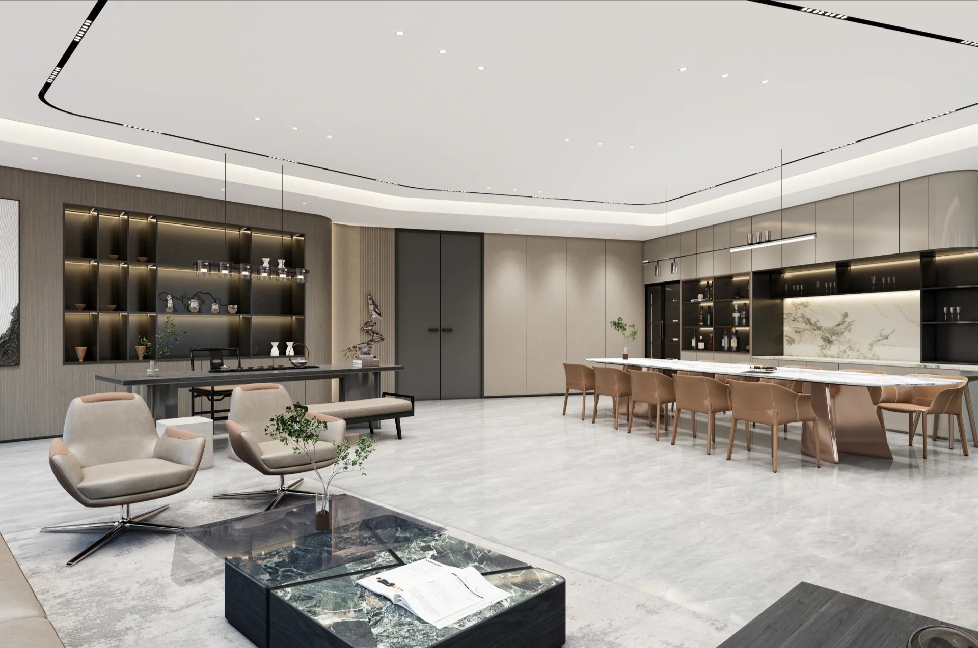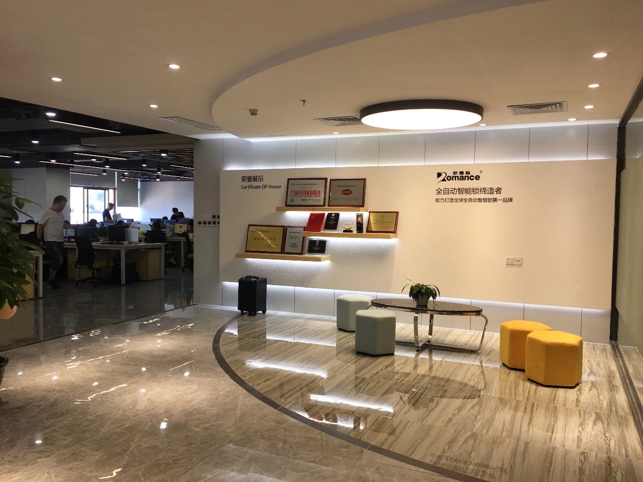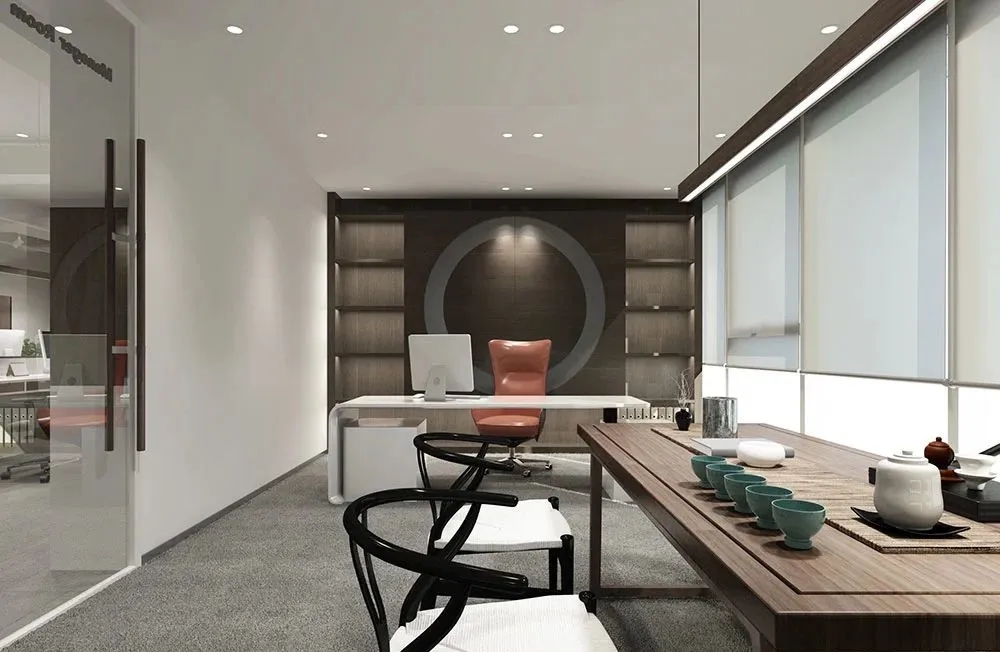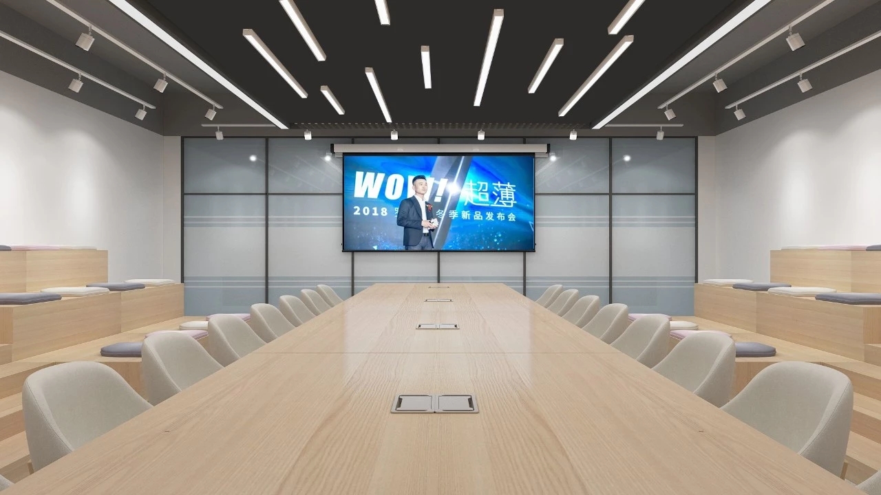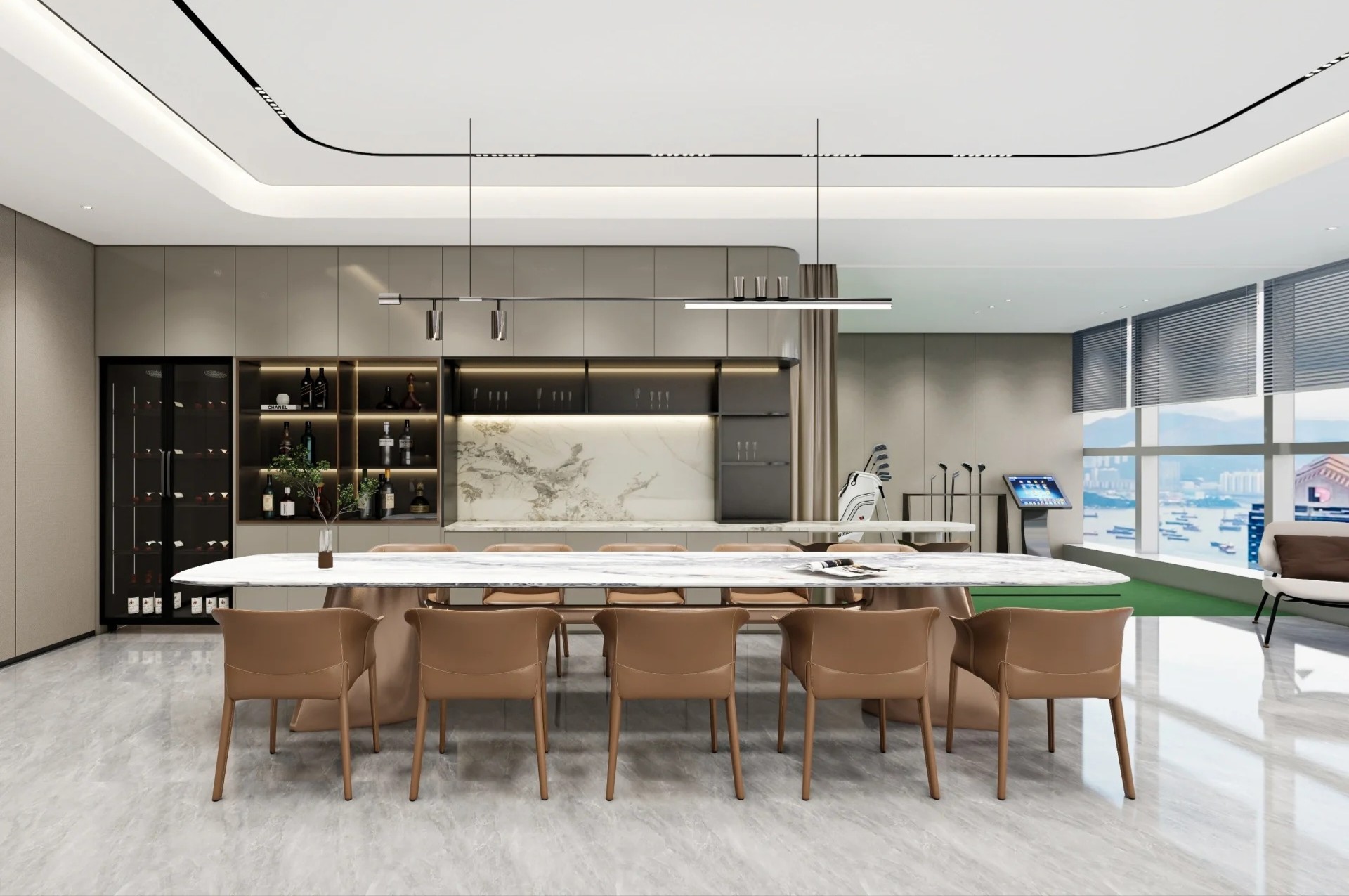 简约不失视觉冲击力的前台斜面立体造型跃然眼前,黑金石结合LED灯和爵士白大理石背景墙相互呼应,给人以格调不失力量,将公司的科技创新,奋发向上的文化深刻表达了出来