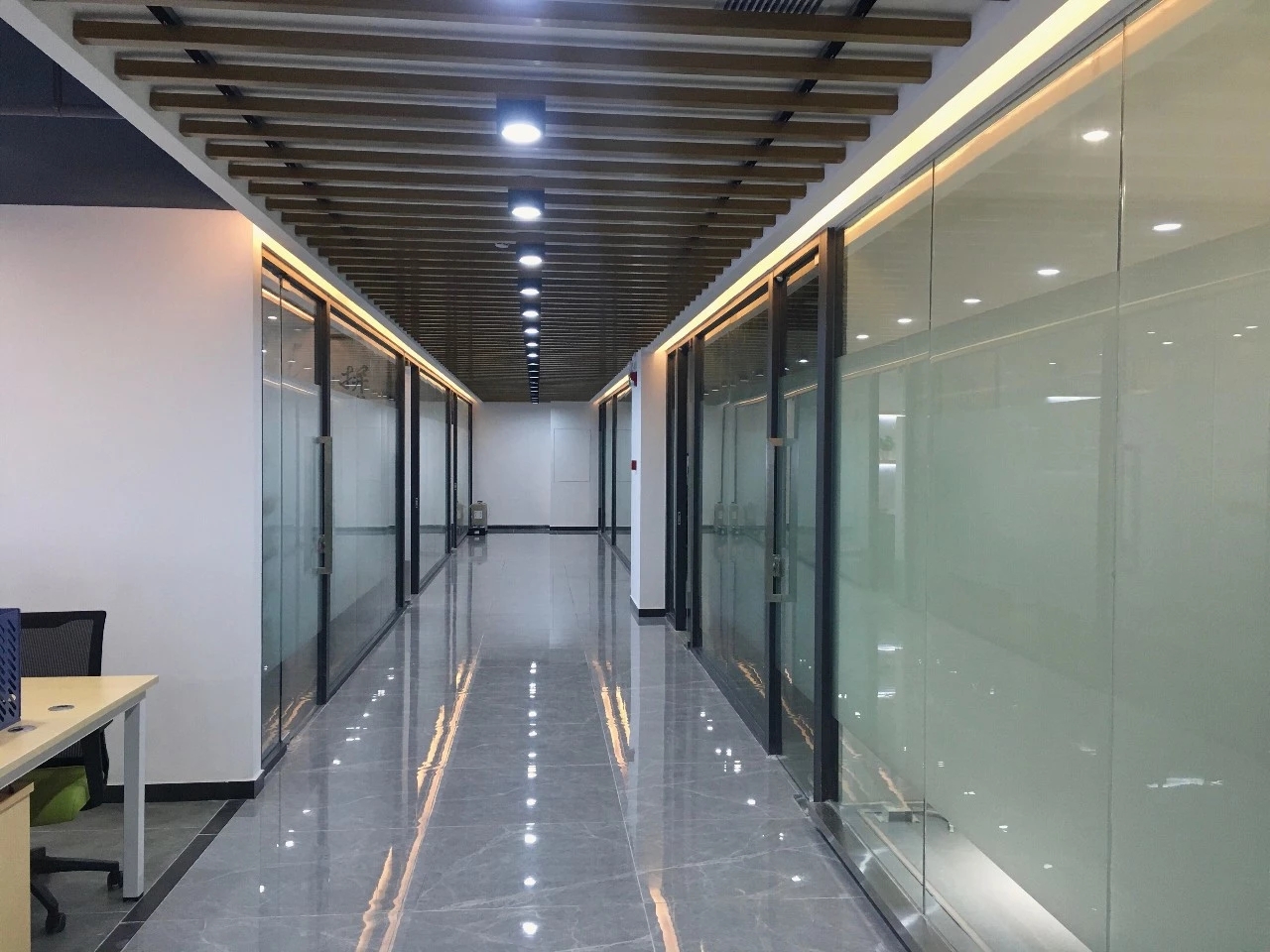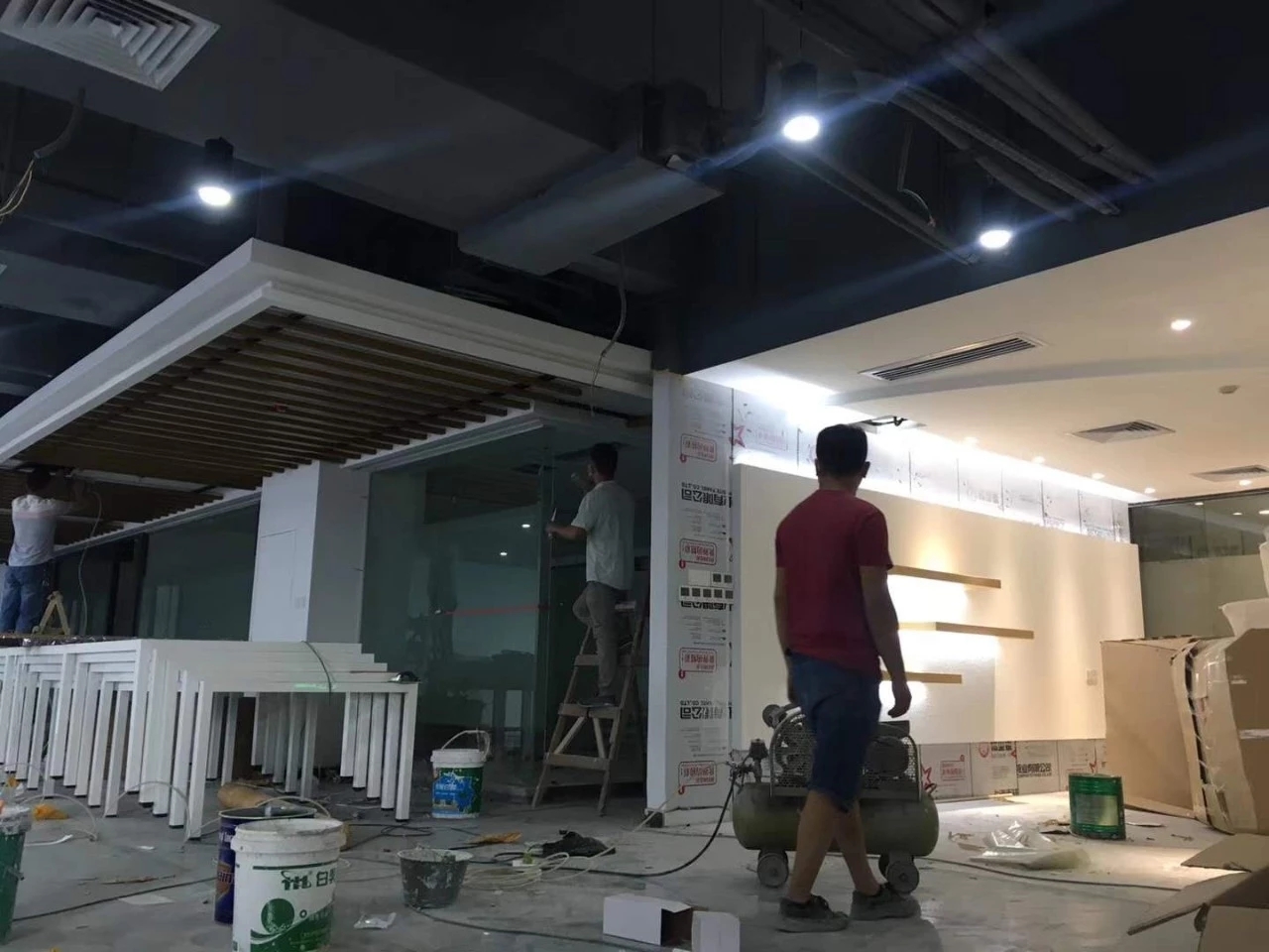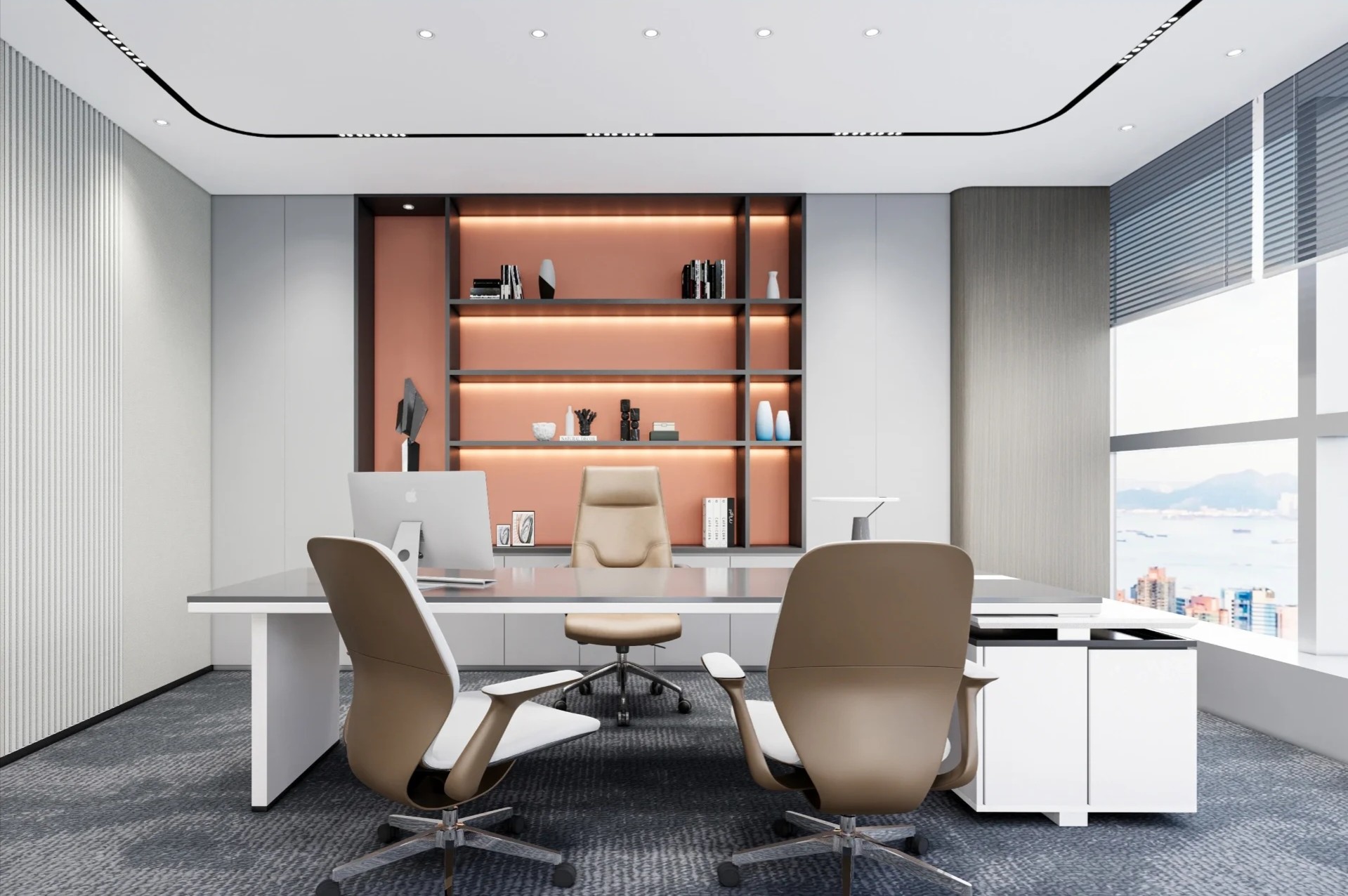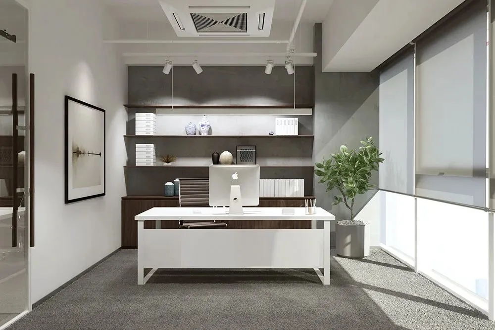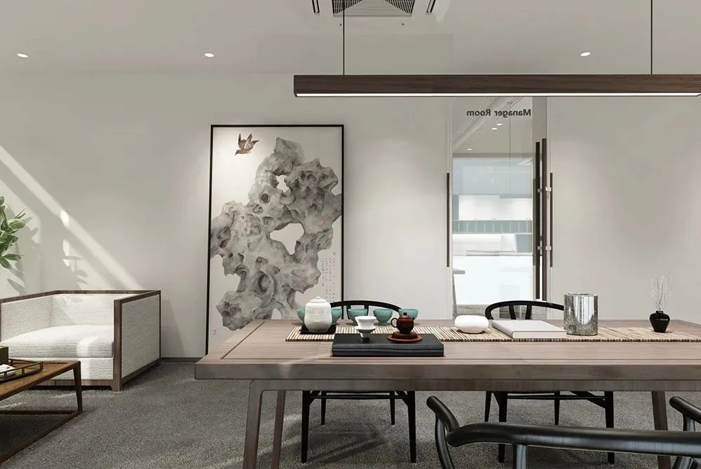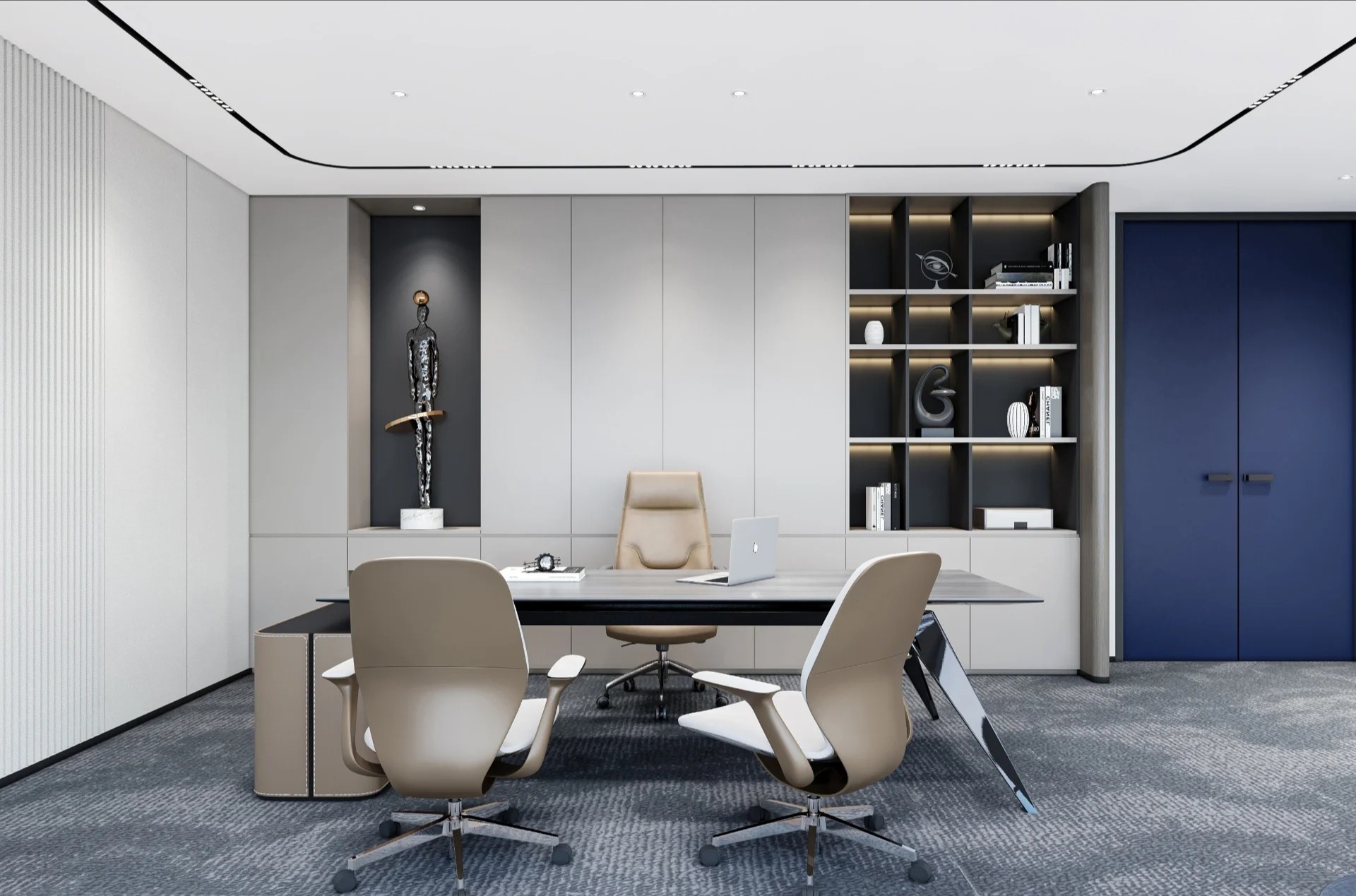 简约不失视觉冲击力的前台斜面立体造型跃然眼前,黑金石结合LED灯和爵士白大理石背景墙相互呼应,给人以格调不失力量,将公司的科技创新,奋发向上的文化深刻表达了出来