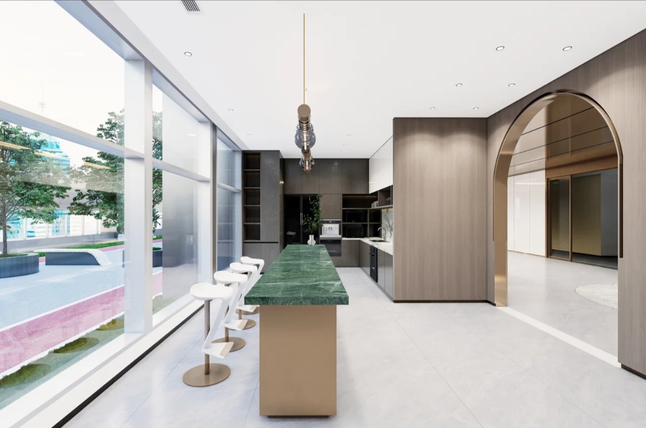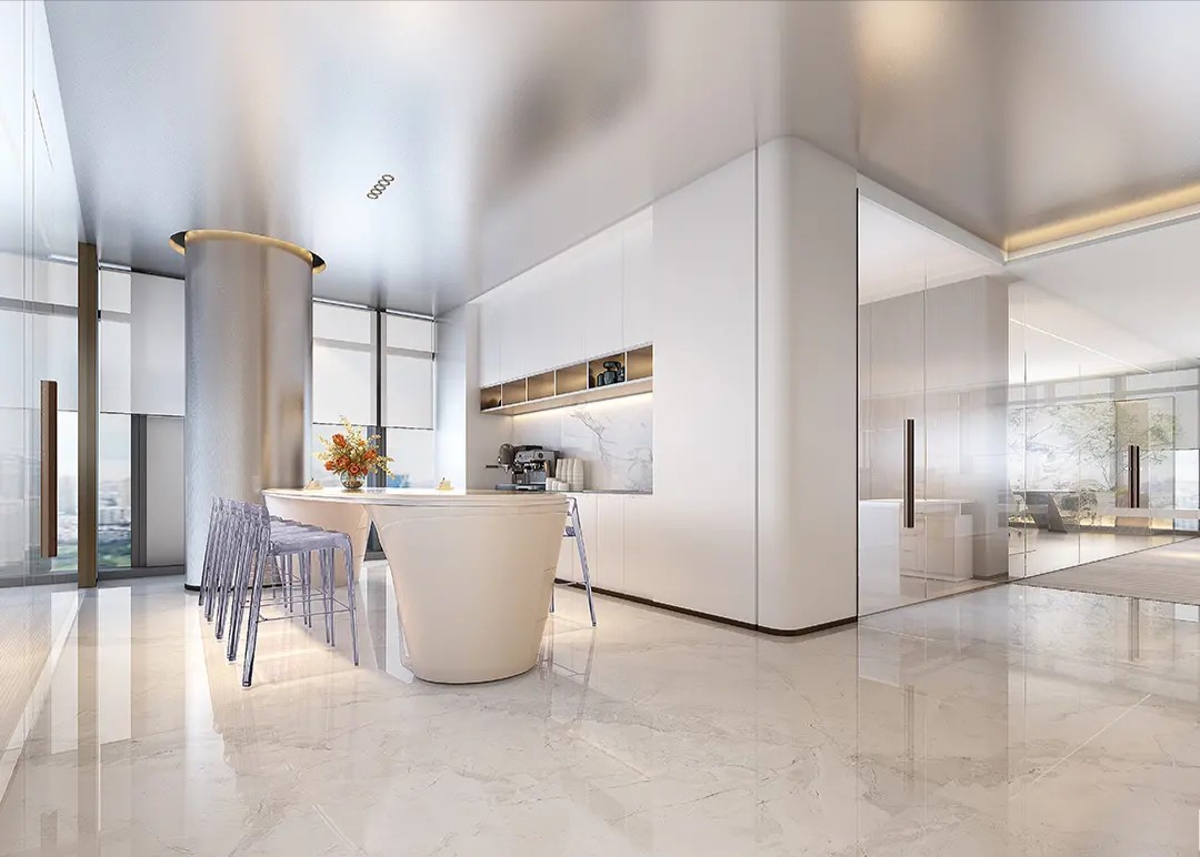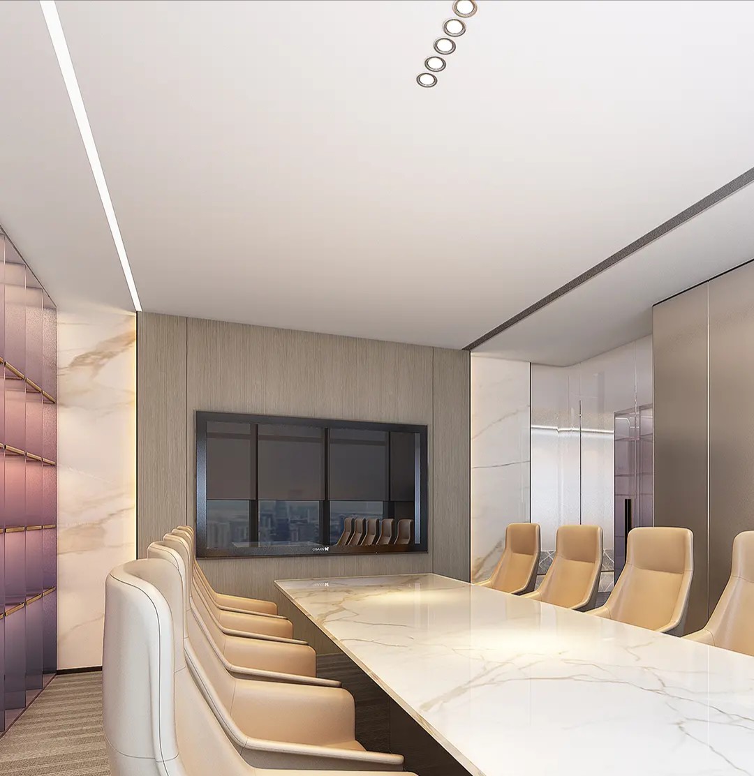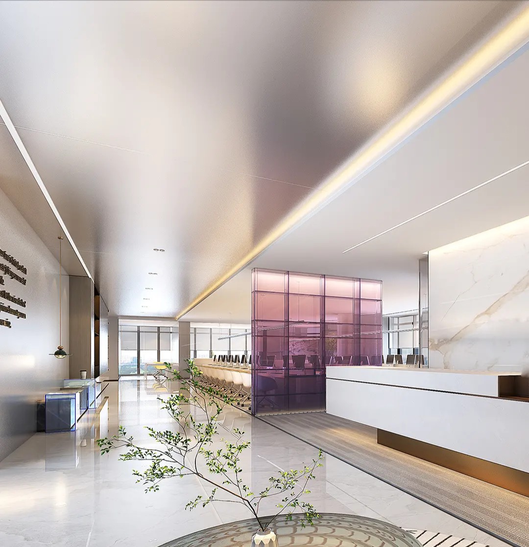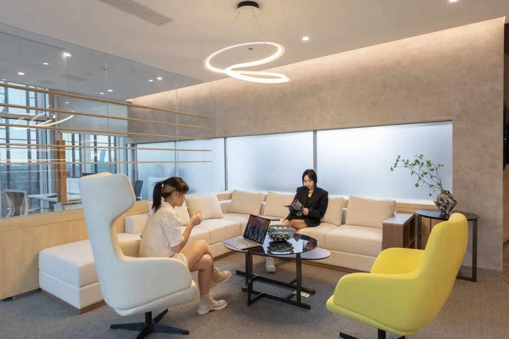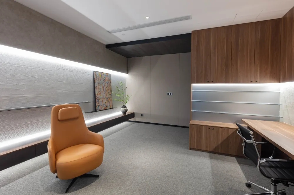 用建筑的思维进行办公室设计,用工作方式的角度去思考空间的连接形式,实现动线区分和视线连通。在不将一家公司割裂的前提下,BES找到需求的共通点,通过硅藻泥和铝板两种材质贯穿整个空间设计。注重人与空间的情绪交流,模糊概念界限,提高利用率和空间活性,强调流通的重要性,整体流线中环环相扣,增加空间延伸性和功能性。