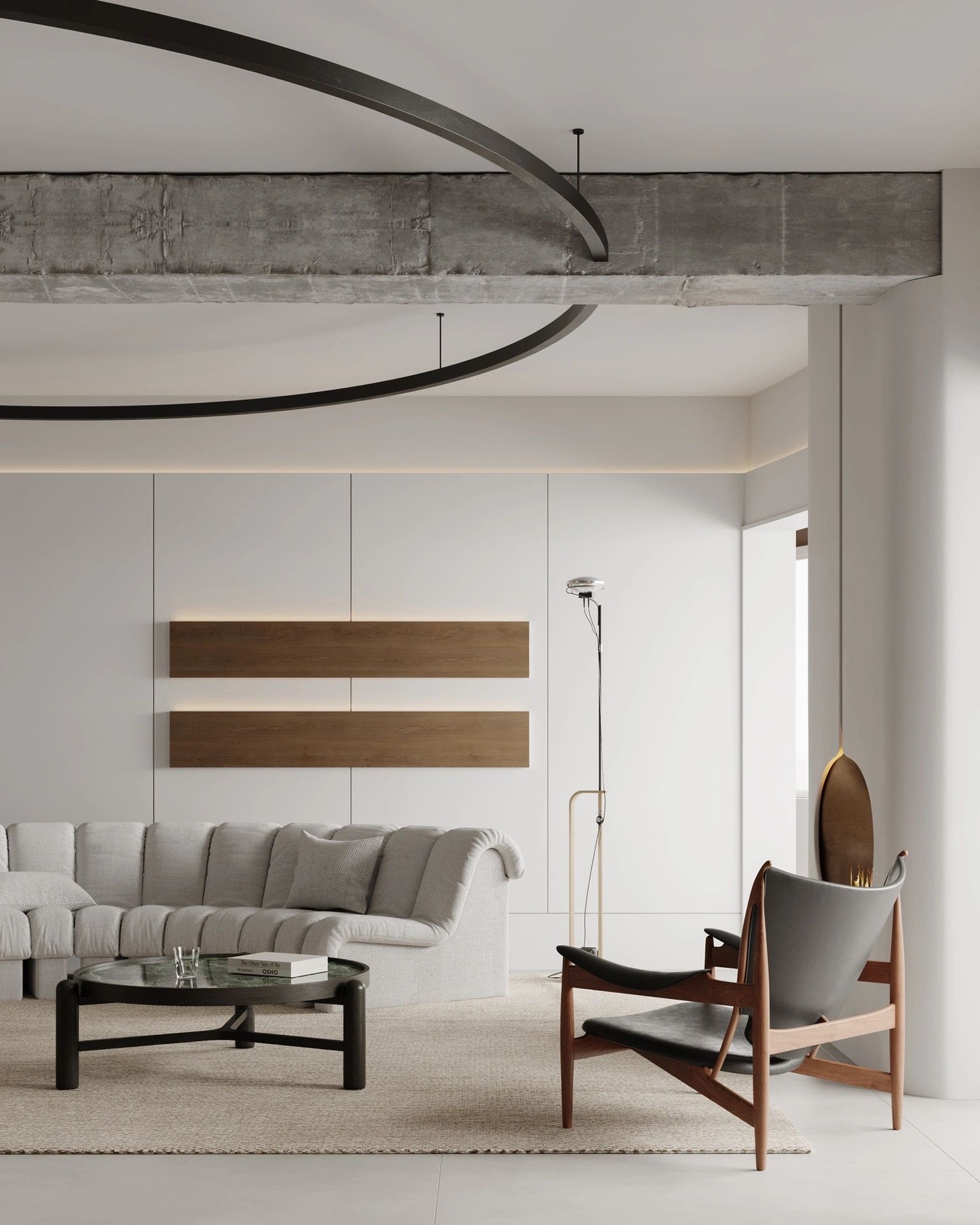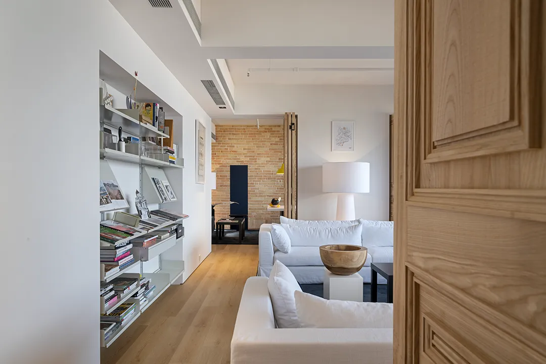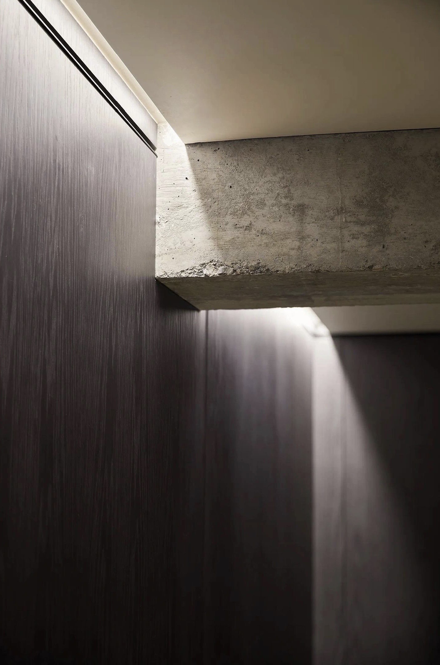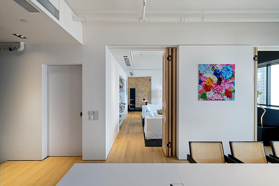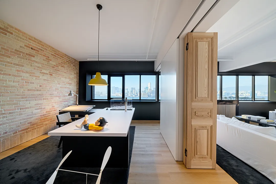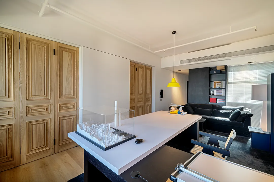 空间的整体平面规划依旧是遵循一贯倡导的自由开放、灵活贯通的基本原则。其中间位置,设置为一个小型私人会客厅,动线以此为主体向两边扩散延展,利用四个对称的特别定制的折叠木门形成界定,根据场景需求可随意组合变换,可私密可开放,达成空间体验的多样性。