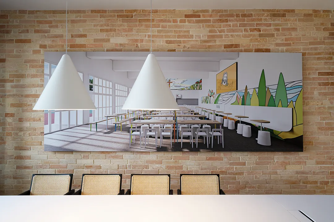 墙壁上这幅占据视觉焦点的超大尺度感的原创画作,与红砖墙自然融和,对设计师Danny来说有着特殊的意义,出自于许多年前为母校的公益项目亲自制作的3D效果图。回望求学之路的漫长,提醒自己常怀感恩之心,在设计之路上勿忘初心。
