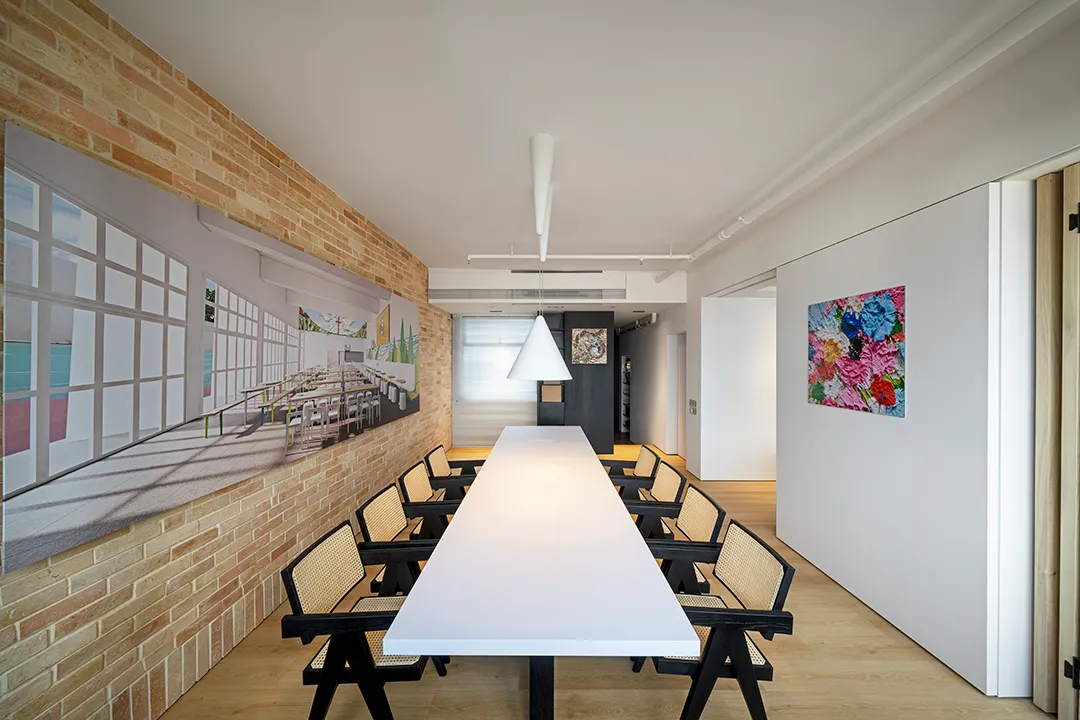 入口通往会议室的通道上方天花的消防水管也不再是破坏空间美感的形态,与其它墙壁上精心陈列的艺术收藏画相映成趣。这些色彩缤纷的图案是Danny的大女儿亲自绘画的,其创作主题是讲述自己为什么想成为一个建筑师。