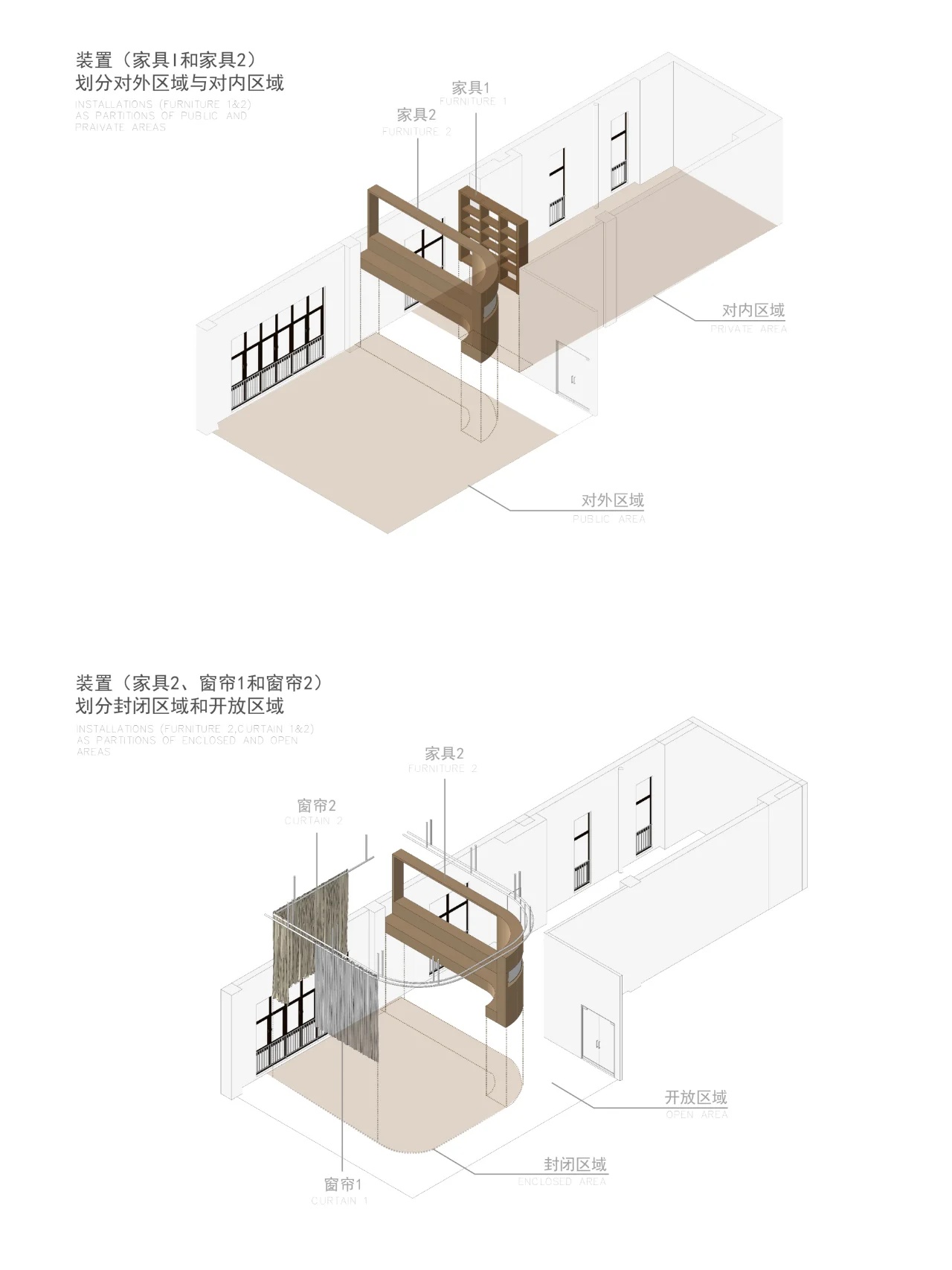 空间装置本身也并不仅体现分隔的作用,它们同样也是自身具备各种功能的家具。装置融合了坐、卧、展示、收纳储物等功能,在与其他活动家具组合使用的过程中,可以满足会议、洽谈、休息和冥想的需要。