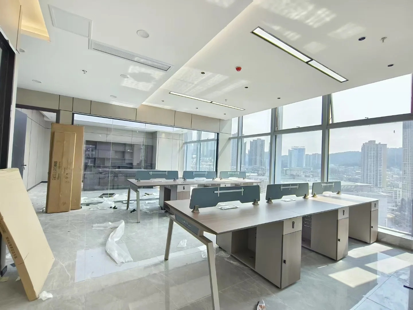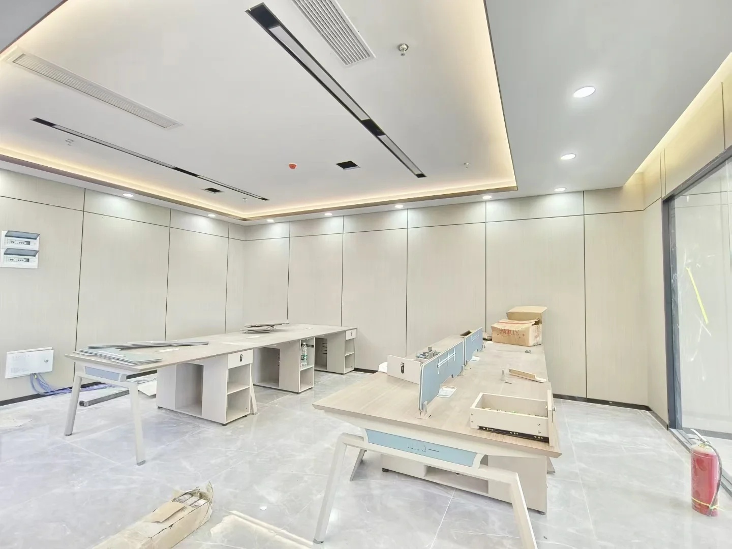 然而,场地呈狭长的“凸”字形,因此最要紧的任务是如何利用这个并不宽敞的地方,满足如此多的功能要求。我们构思了一组空间分隔的装置,以此代替封闭的隔墙,这样既可以对空间流线进行隔断、阻拦,又不为本身就狭小的空间再“添堵”,保持了原有的开放性。两个通高的柜体划分了16人办公位的对内区域和多功能共用的对外区域。同时,围绕对外区域的部分,我们又在另一侧布置了窗帘轨道,可以轻易地通过窗帘的拉动,改变空间的封闭或开敞。清晰的动静区域的划分,让办公位上的员工完全不受他人的影响。多功能区域宽敞舒适,成为大家常常互动和交流的场所。