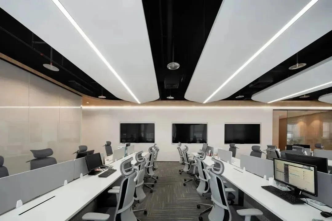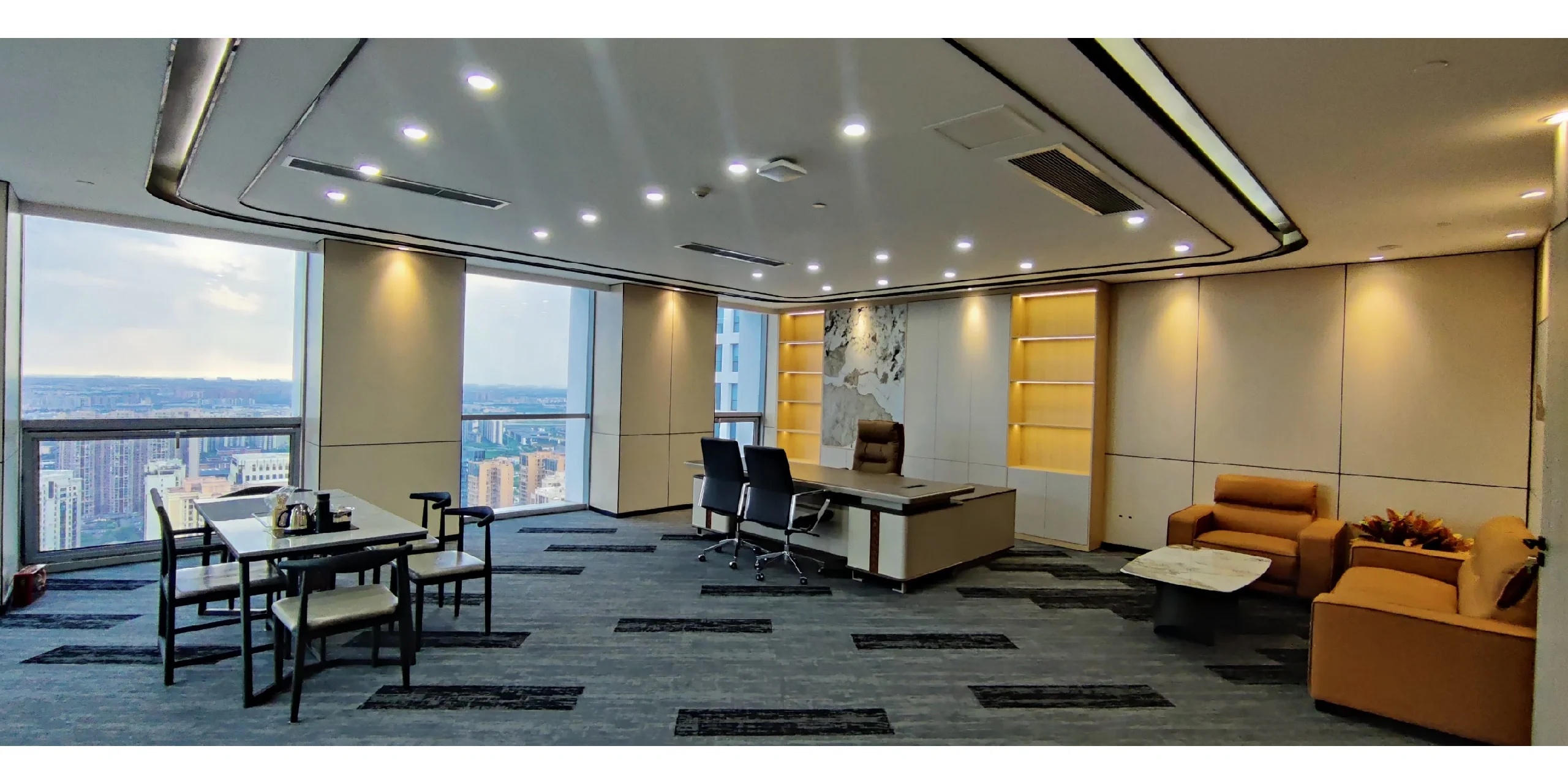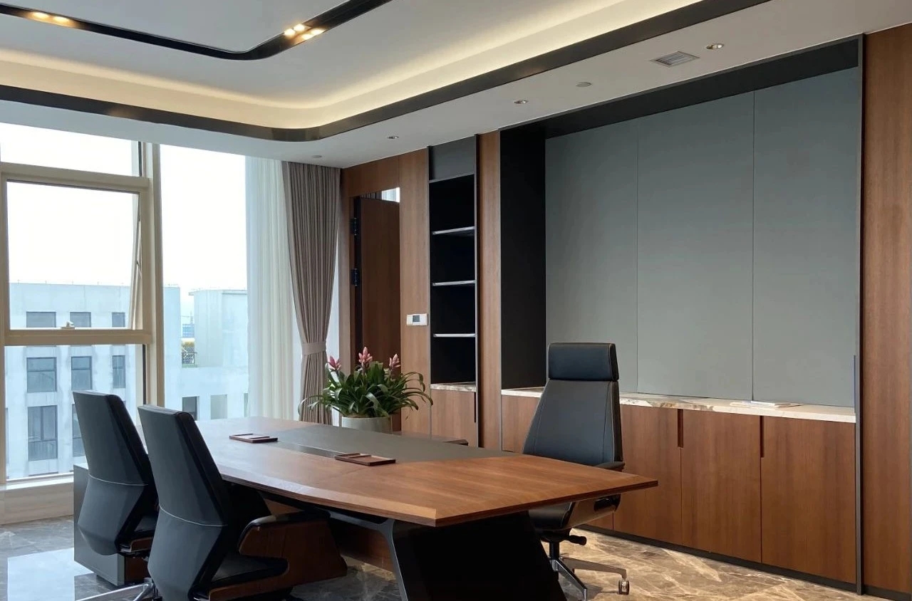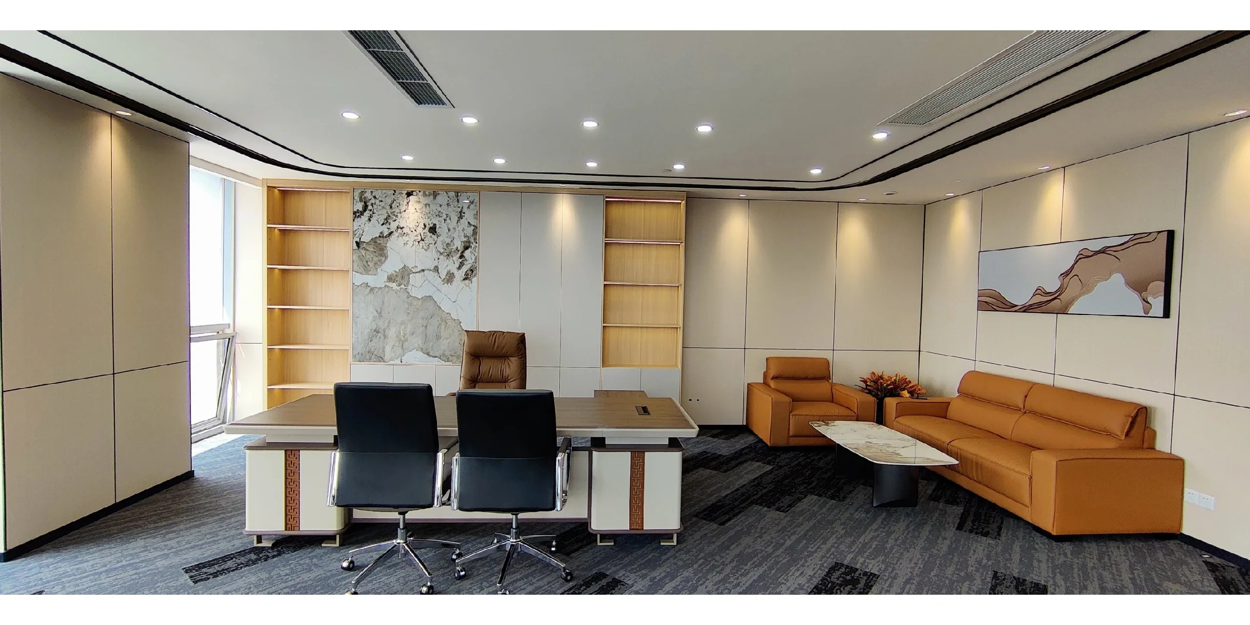 顶面采用浅色木饰面做装饰,搭配灰色系地毯以及黑色系办公家具,整个空间搭配出来的感觉非常稳重和大气.