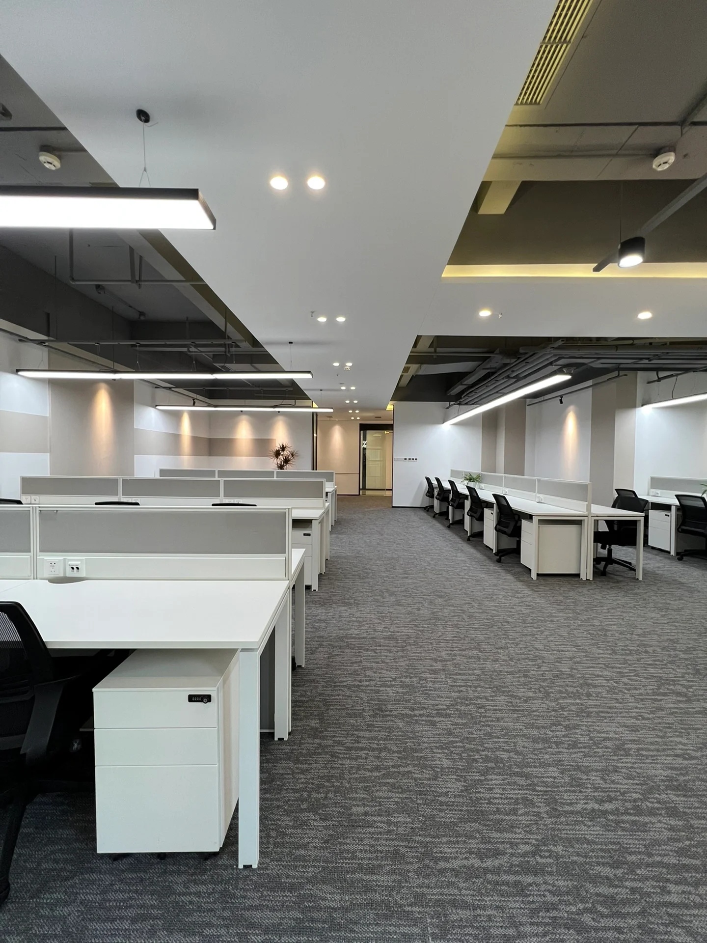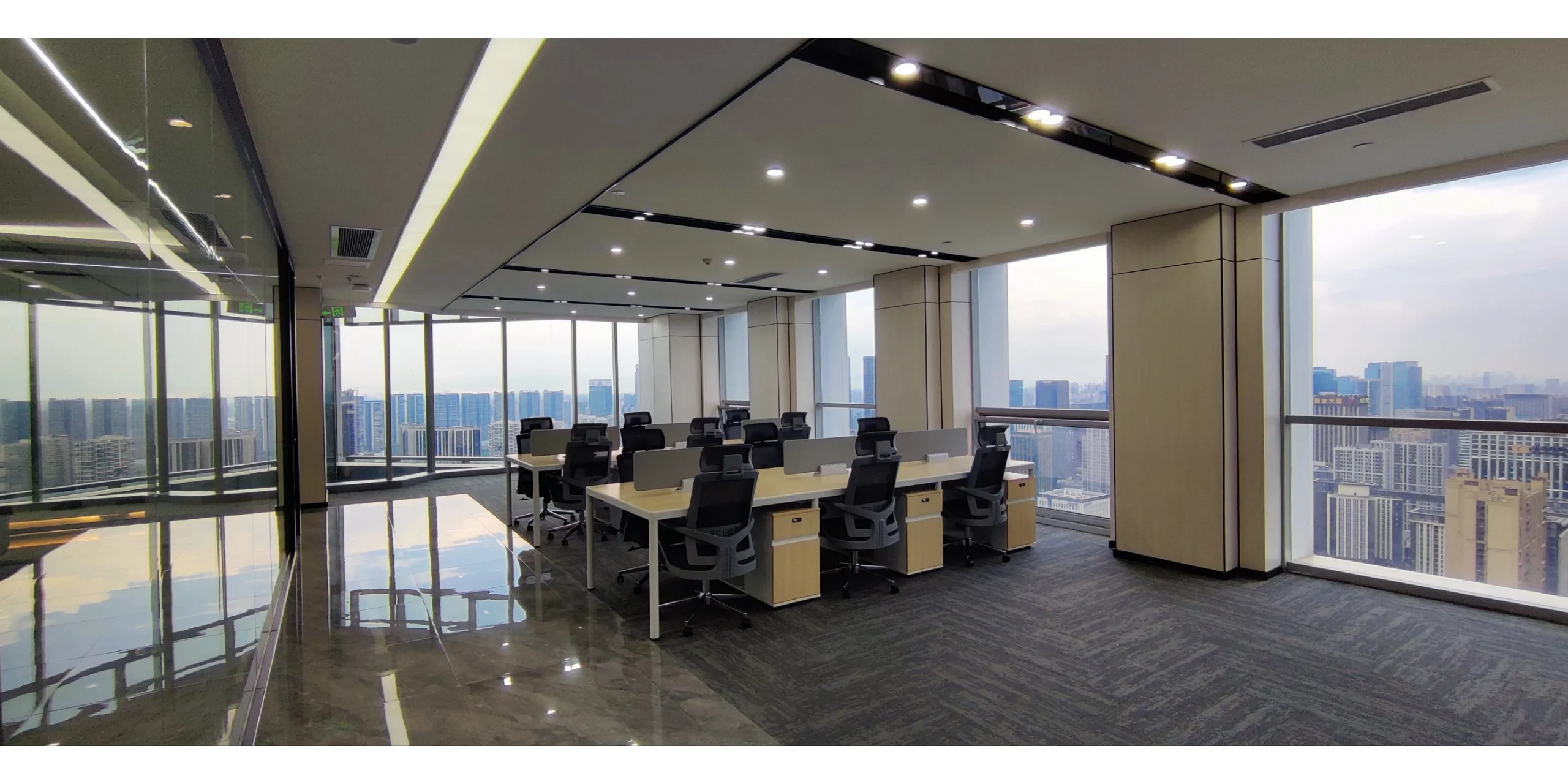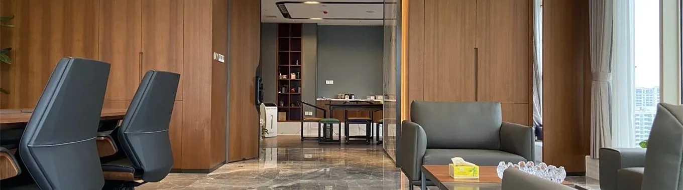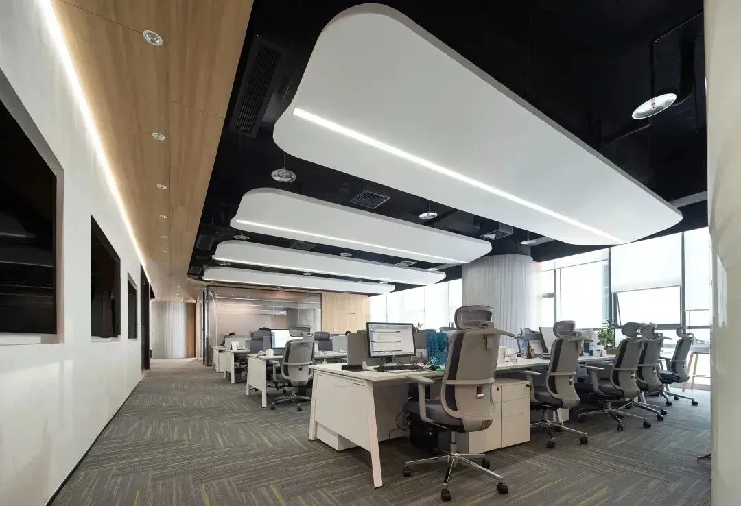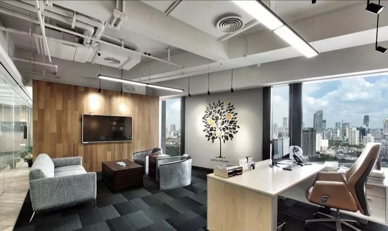 顶面采用浅色木饰面做装饰,搭配灰色系地毯以及黑色系办公家具,整个空间搭配出来的感觉非常稳重和大气.