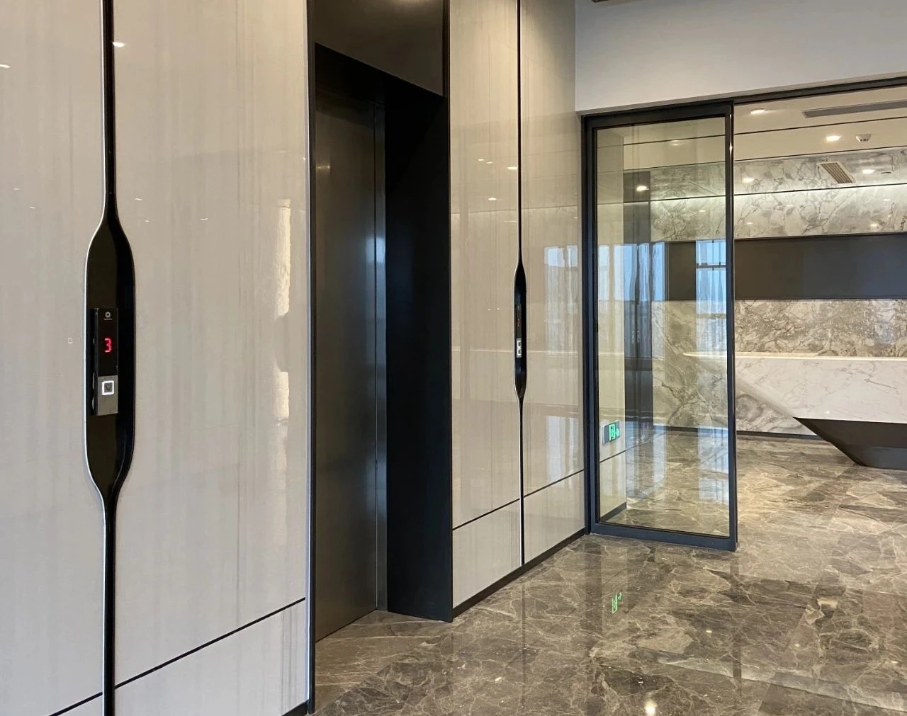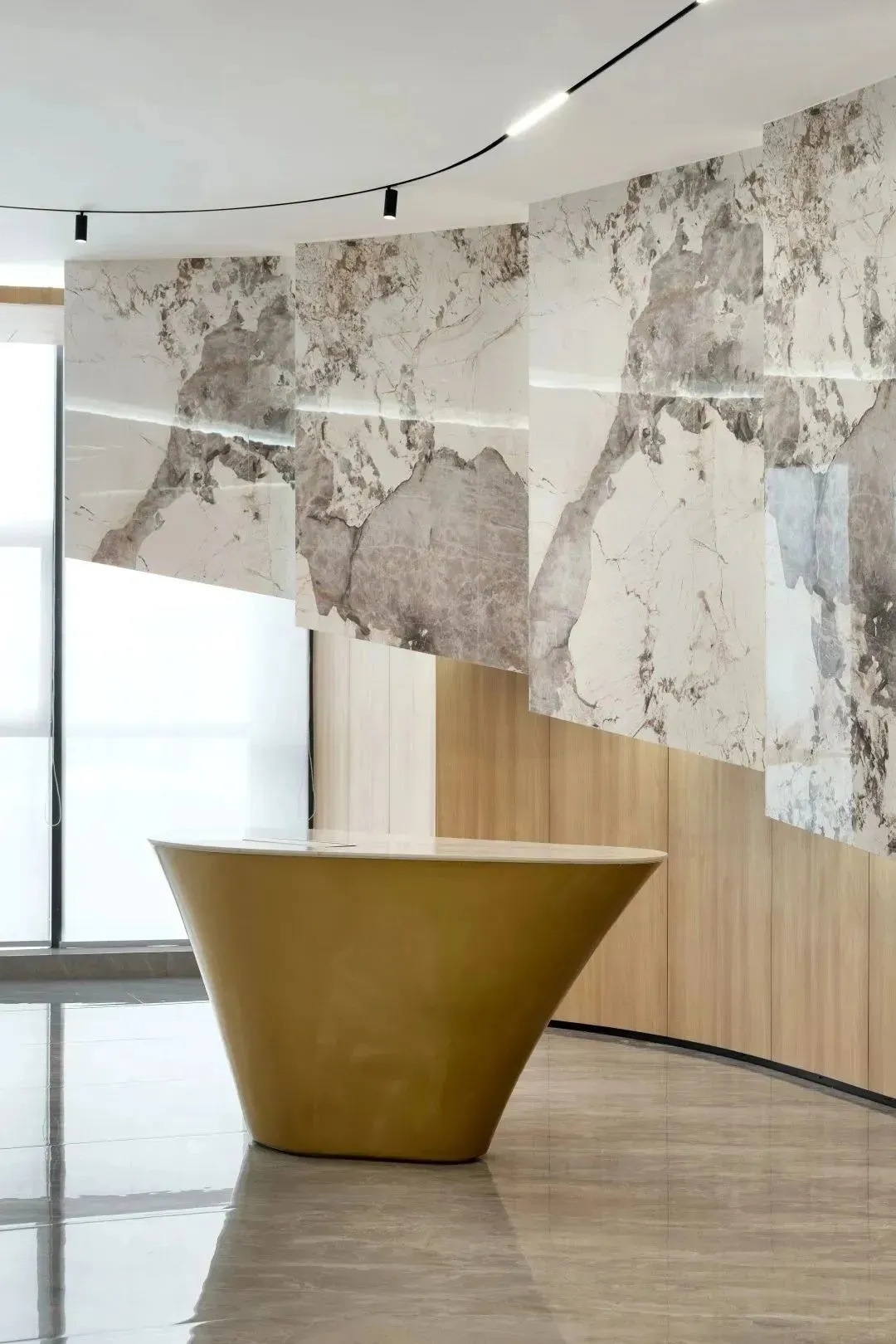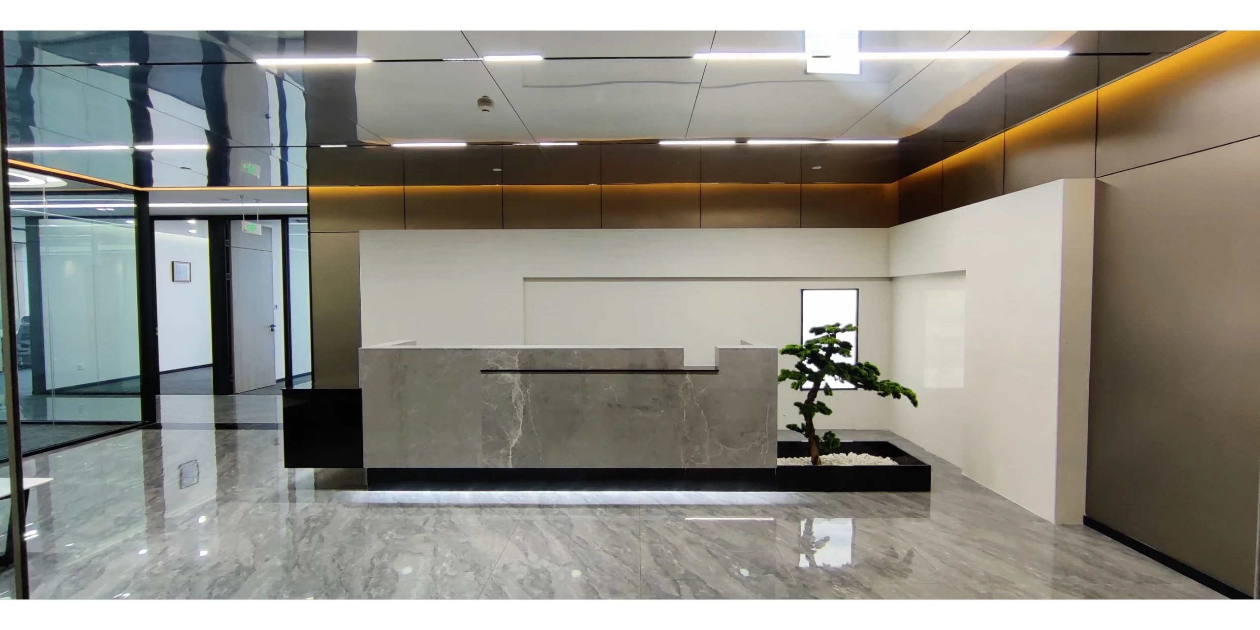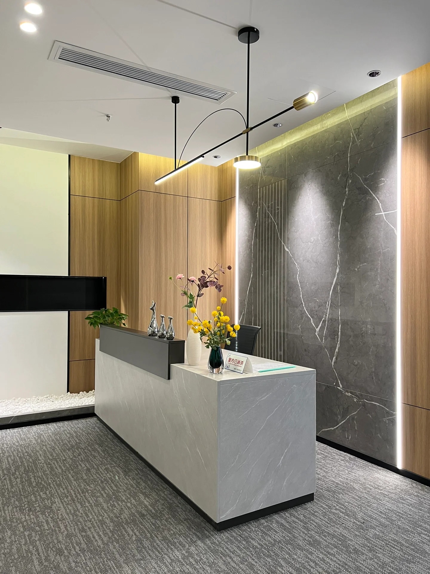 公司前台接待区,我们以飞机上升的机翼形态,设计了一个步步往上盘旋姿态的前台背景,既是模仿飞机起飞状态的机翼,也预示着公司步步高升的含义,此为“开门行大运”,即“开运”.