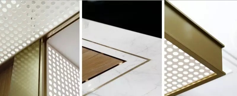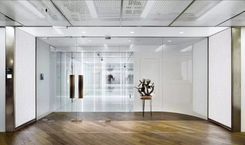 新办公空间的设计,首先在室内主材上延续了原办公室的柚木饰面和钢化玻璃(隔墙),同时亦增加两种主材:穿孔铝板和烤漆玻璃。这两项新的材料主要使用在围绕核心筒的走道上方和墙饰面,浅色系的核心主色同复兴路SOHO的电梯厅风格上更好地衔接,并对核心筒外侧的单跨柱网使用空间形成了一定的光反射辅助效果。