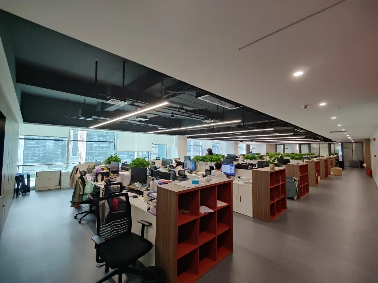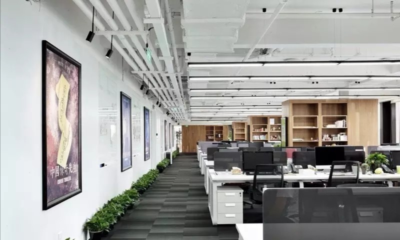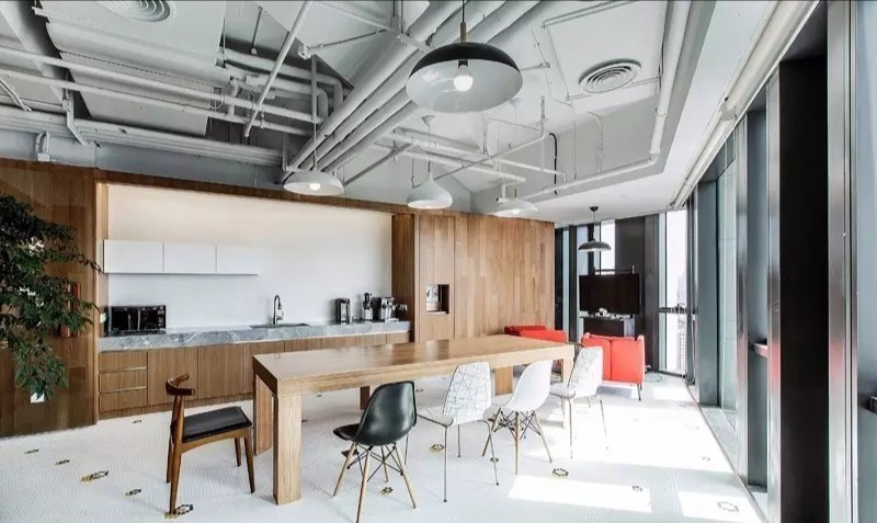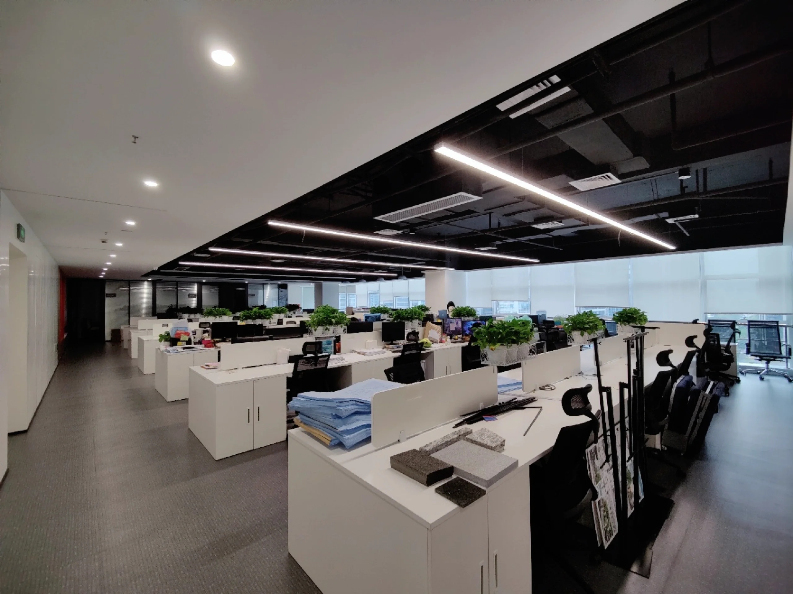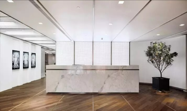 平面流线上基于核心筒居中的环形走廊展开,平面的一半为开放办公区,而另一半为高管办公及会议室,两个区块通过两个休息区衔接。大量木饰面的使用,提升了亲切感,墙地面材料均为实木复合地板错拼。环形走廊上部为穿孔铝板吊顶内藏灯带,导向性比较明确,同两侧的玻璃隔断形成戏剧化的反射效果。