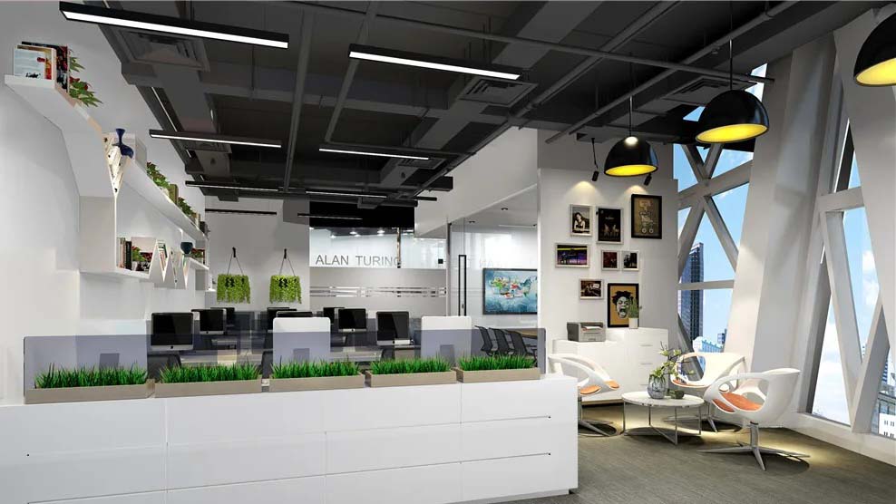 环状前台全部使用杜邦corian人造石定制:这种材料被大量应用于商业空间,他的可塑性和高稳定性是同级别产品无法比拟的。