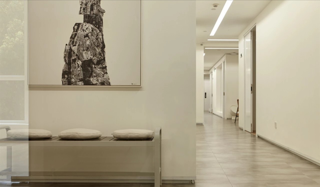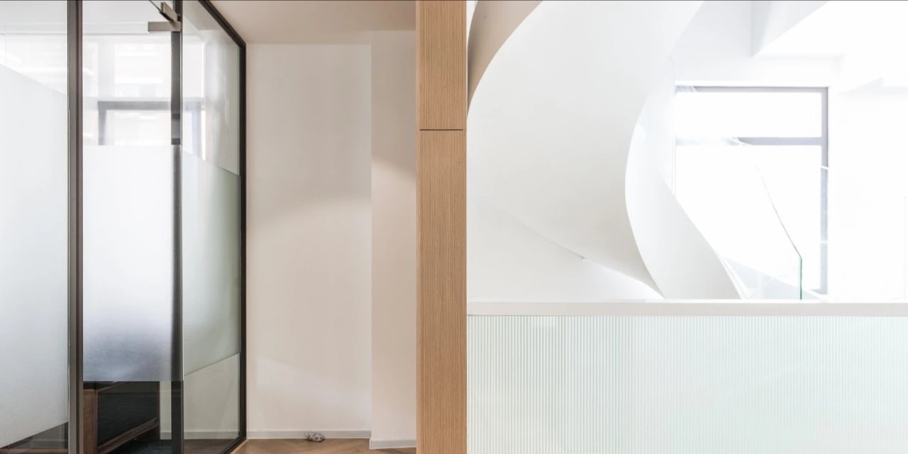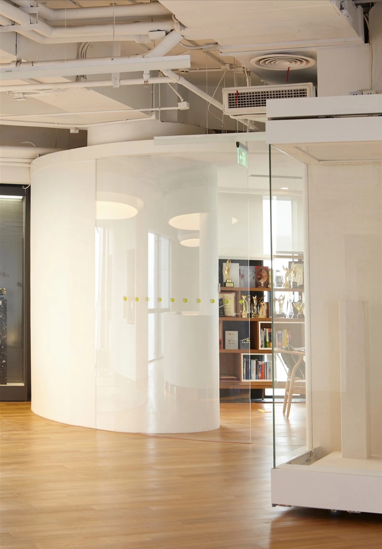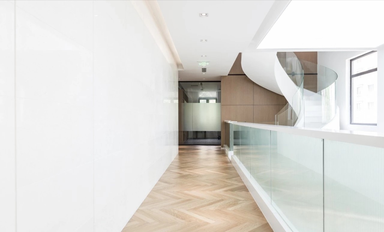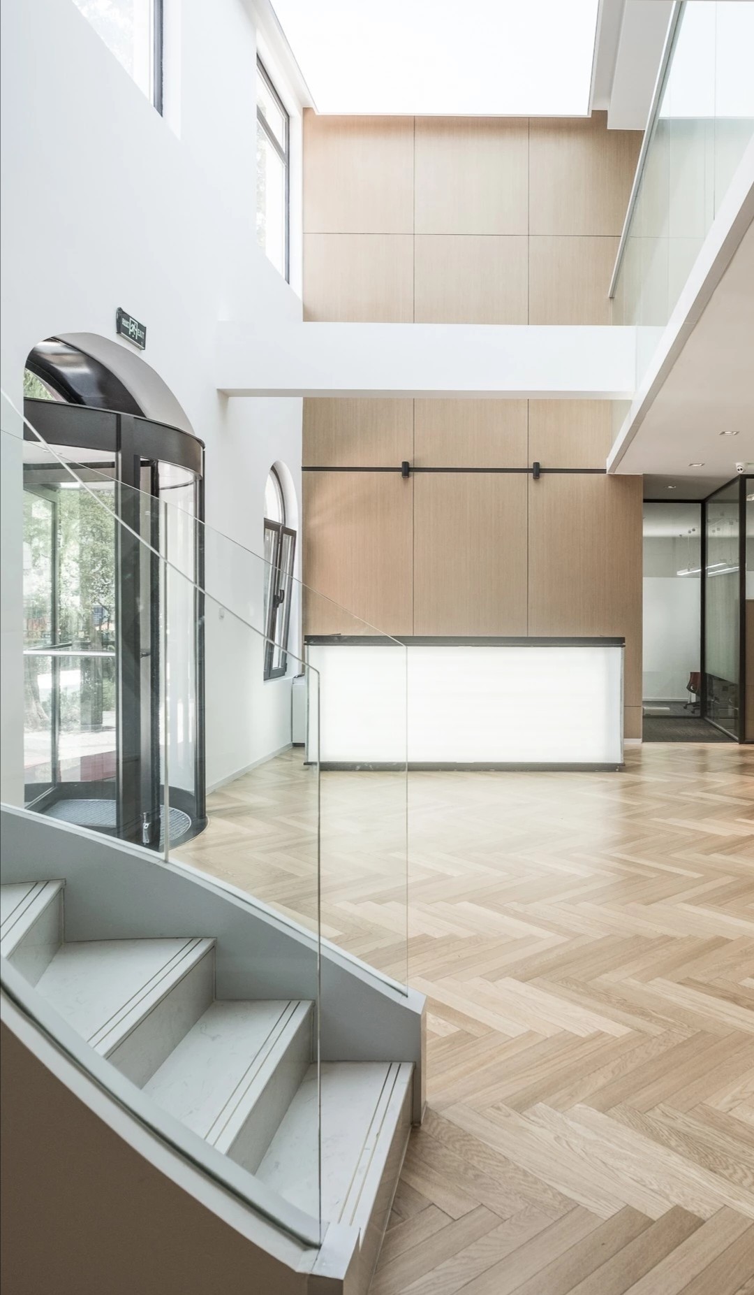 旋转楼梯的另一侧是前台及两层高的木饰面墙,整个中庭上部设计了一个巨大的软膜天花照明,给整个前台提供了柔和的照明。前台本身也是用内衬LED的玻璃体围合,目的是匹配整个空间的纯净白亮的效果。黄杨木饰面、橡木人字拼地板和米色的洞石,这些偏暖的材质平衡了白色涂料和玻璃营造的冷色调。