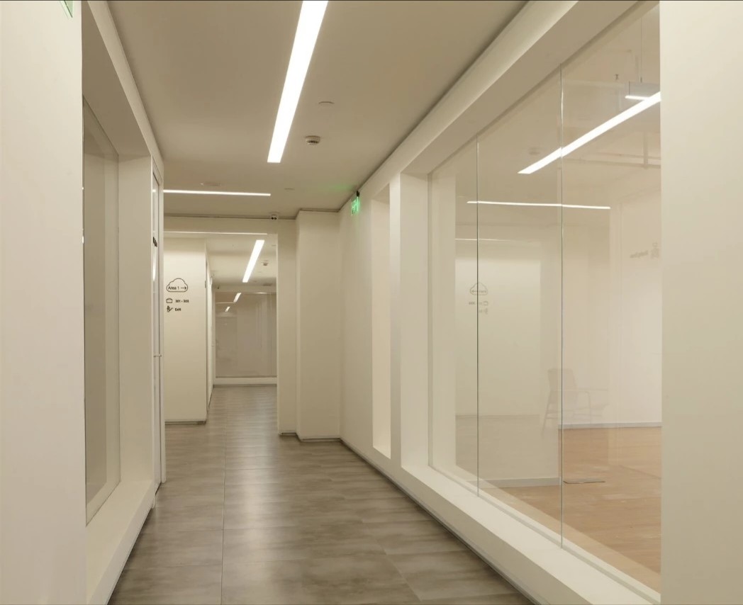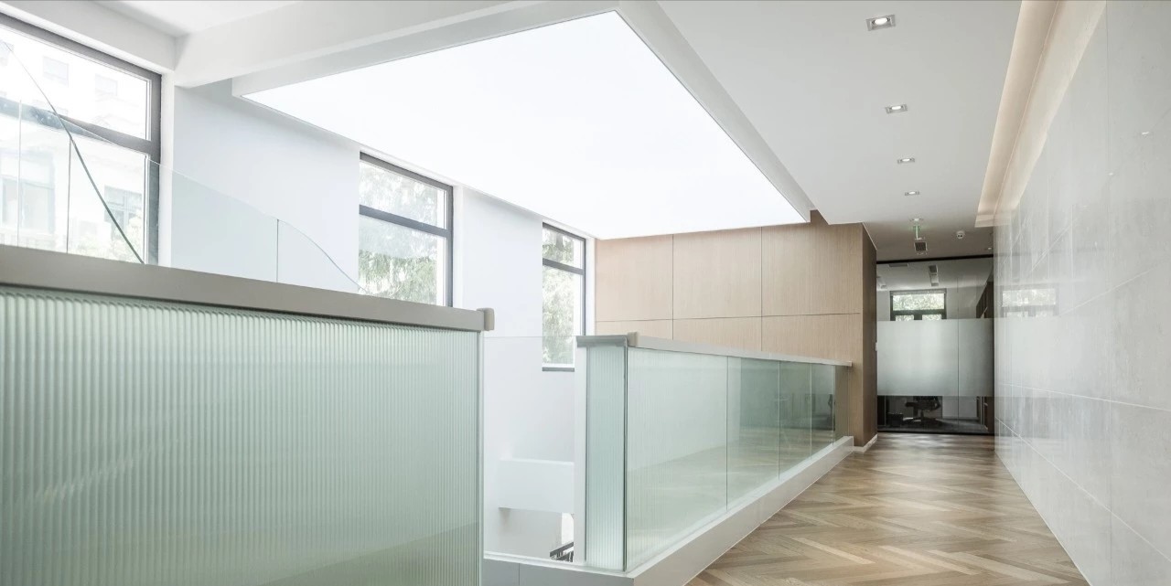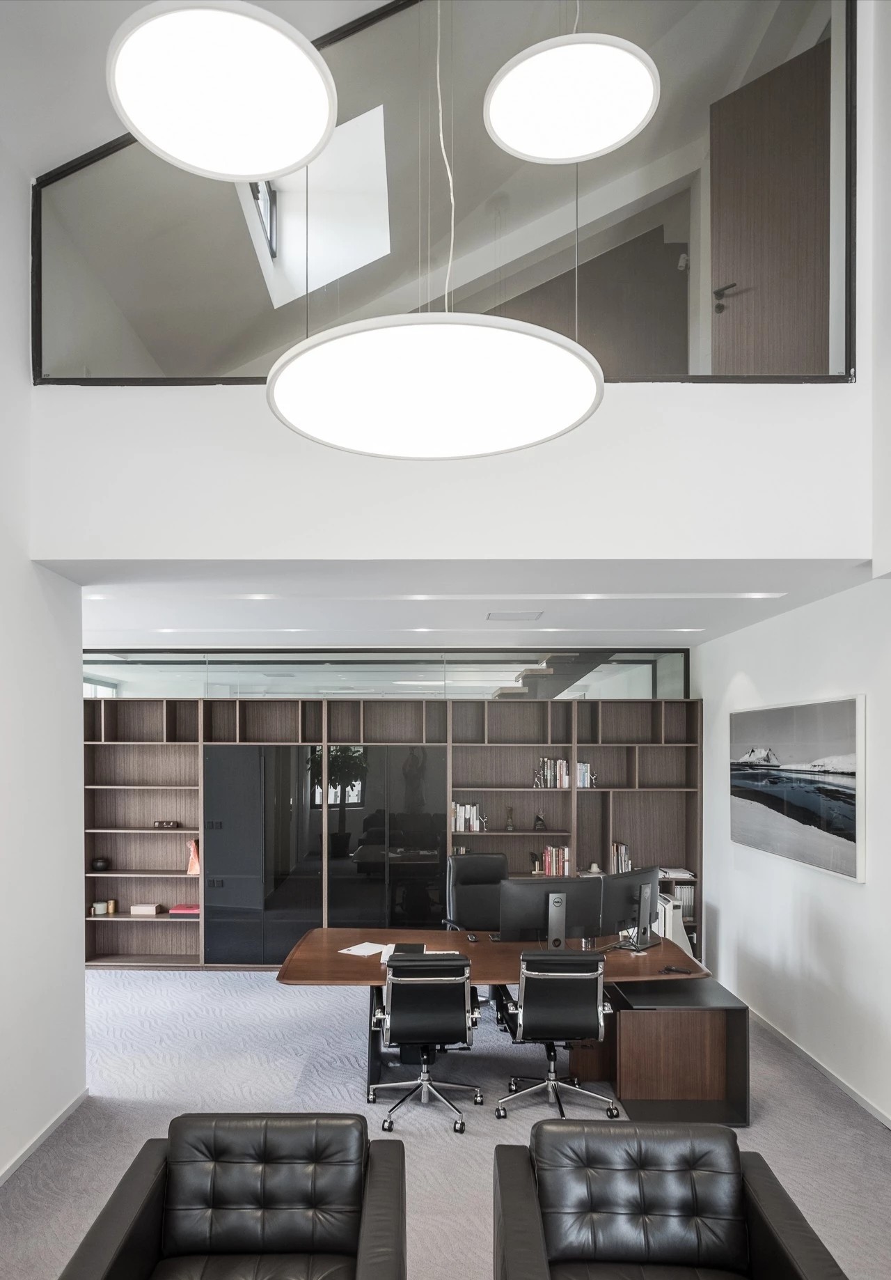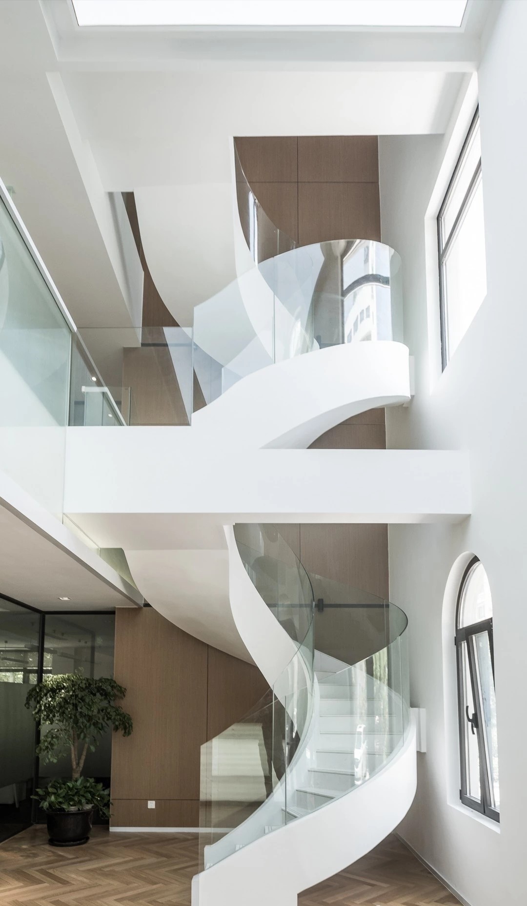 旋转楼梯的另一侧是前台及两层高的木饰面墙,整个中庭上部设计了一个巨大的软膜天花照明,给整个前台提供了柔和的照明。前台本身也是用内衬LED的玻璃体围合,目的是匹配整个空间的纯净白亮的效果。黄杨木饰面、橡木人字拼地板和米色的洞石,这些偏暖的材质平衡了白色涂料和玻璃营造的冷色调。