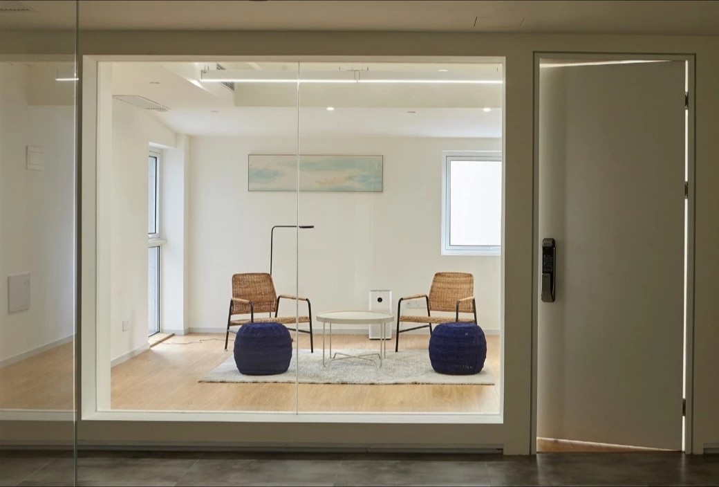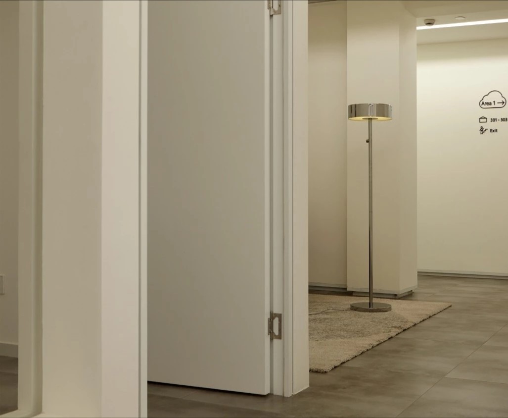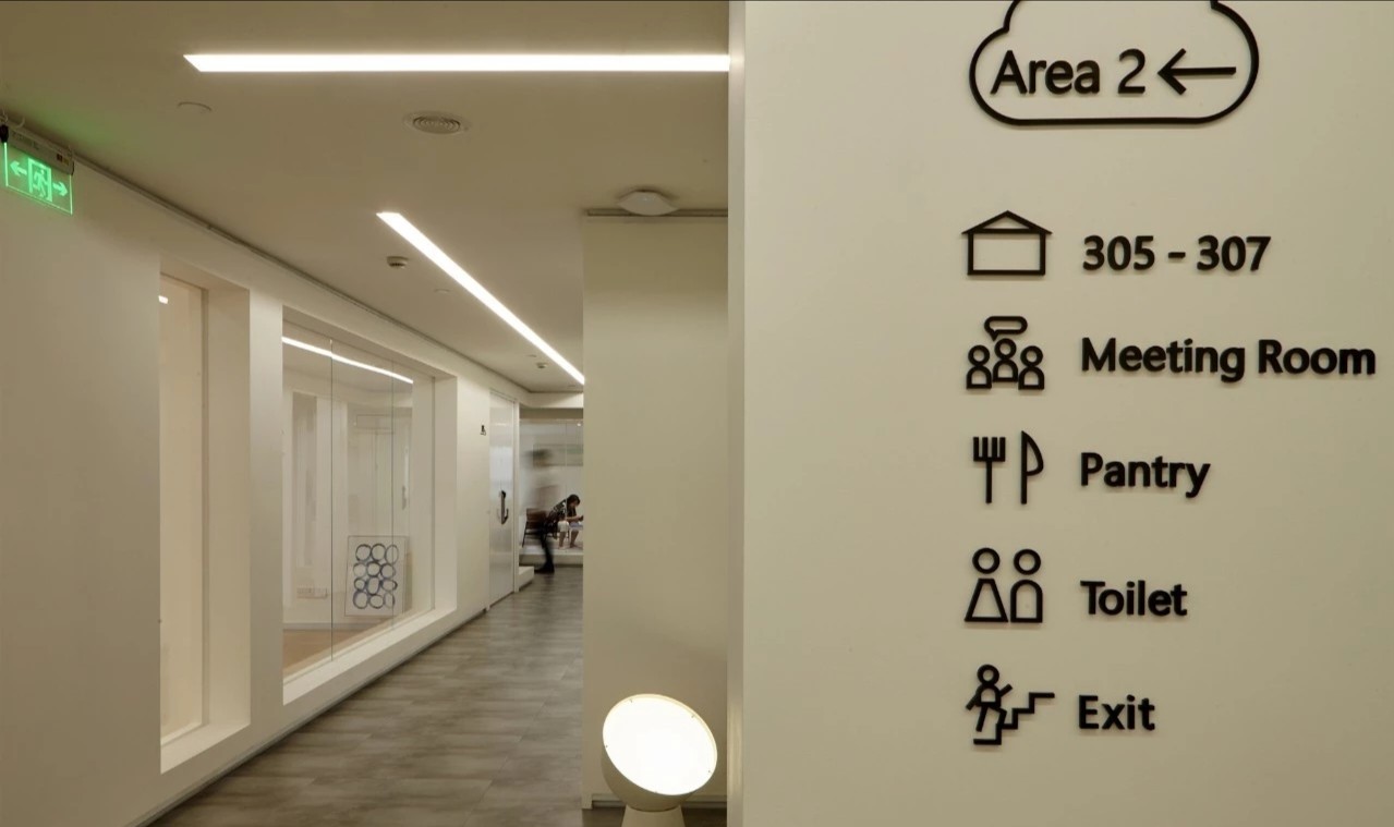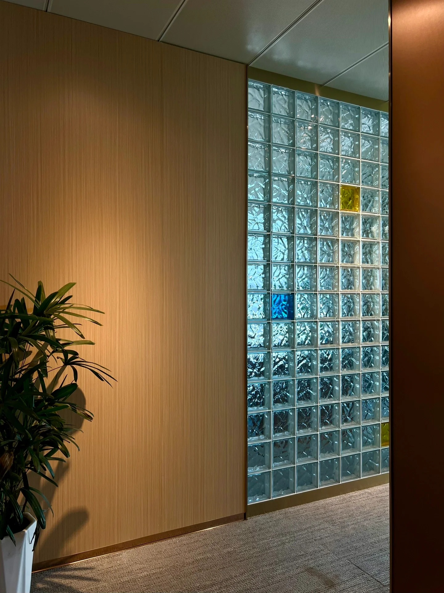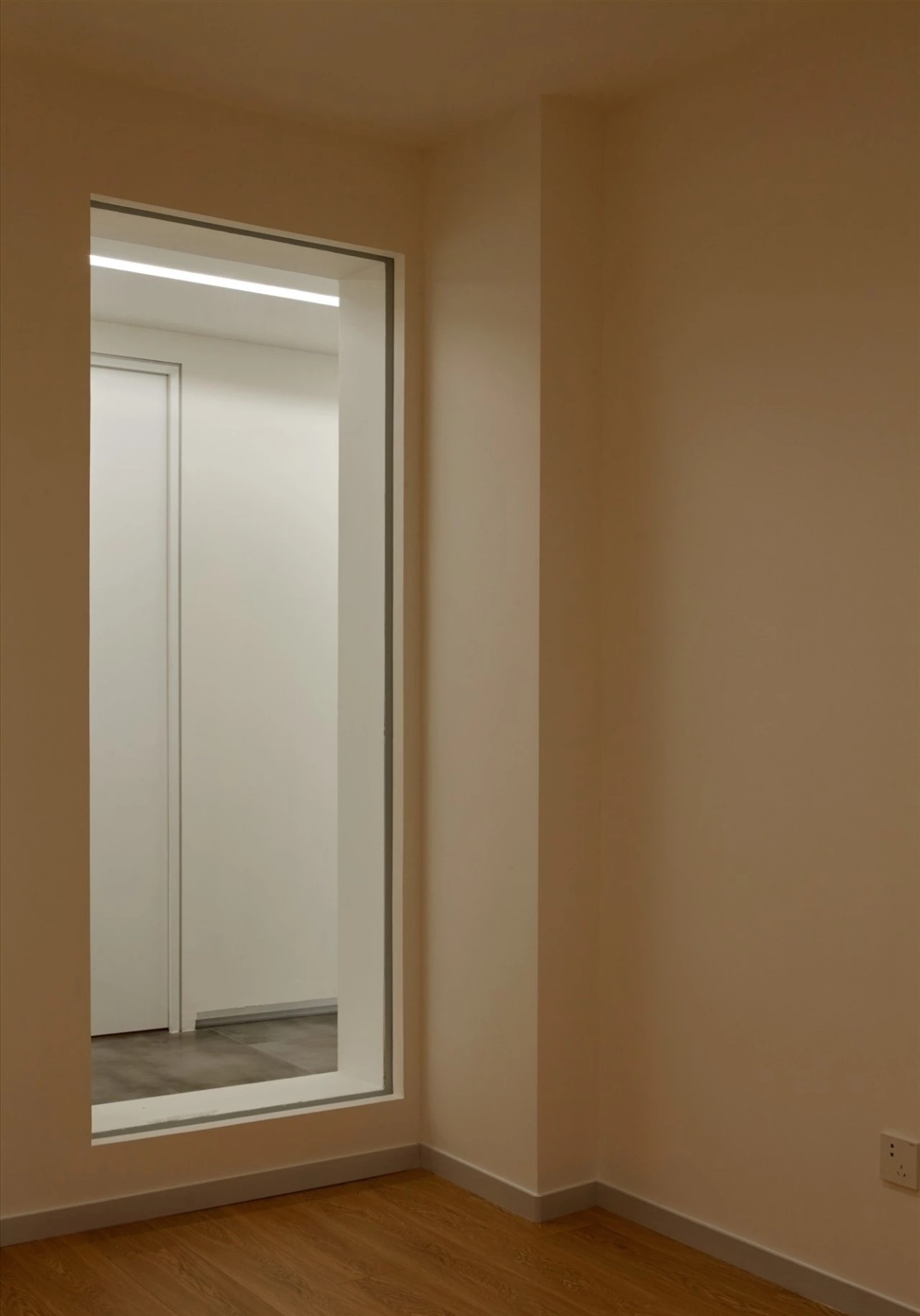 旋转楼梯的另一侧是前台及两层高的木饰面墙,整个中庭上部设计了一个巨大的软膜天花照明,给整个前台提供了柔和的照明。前台本身也是用内衬LED的玻璃体围合,目的是匹配整个空间的纯净白亮的效果。黄杨木饰面、橡木人字拼地板和米色的洞石,这些偏暖的材质平衡了白色涂料和玻璃营造的冷色调。