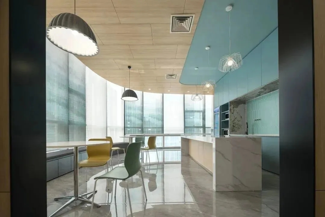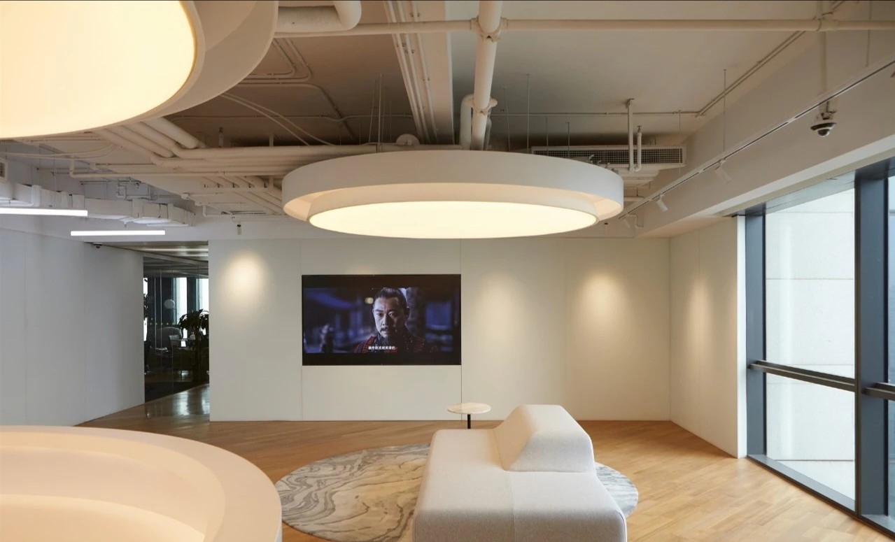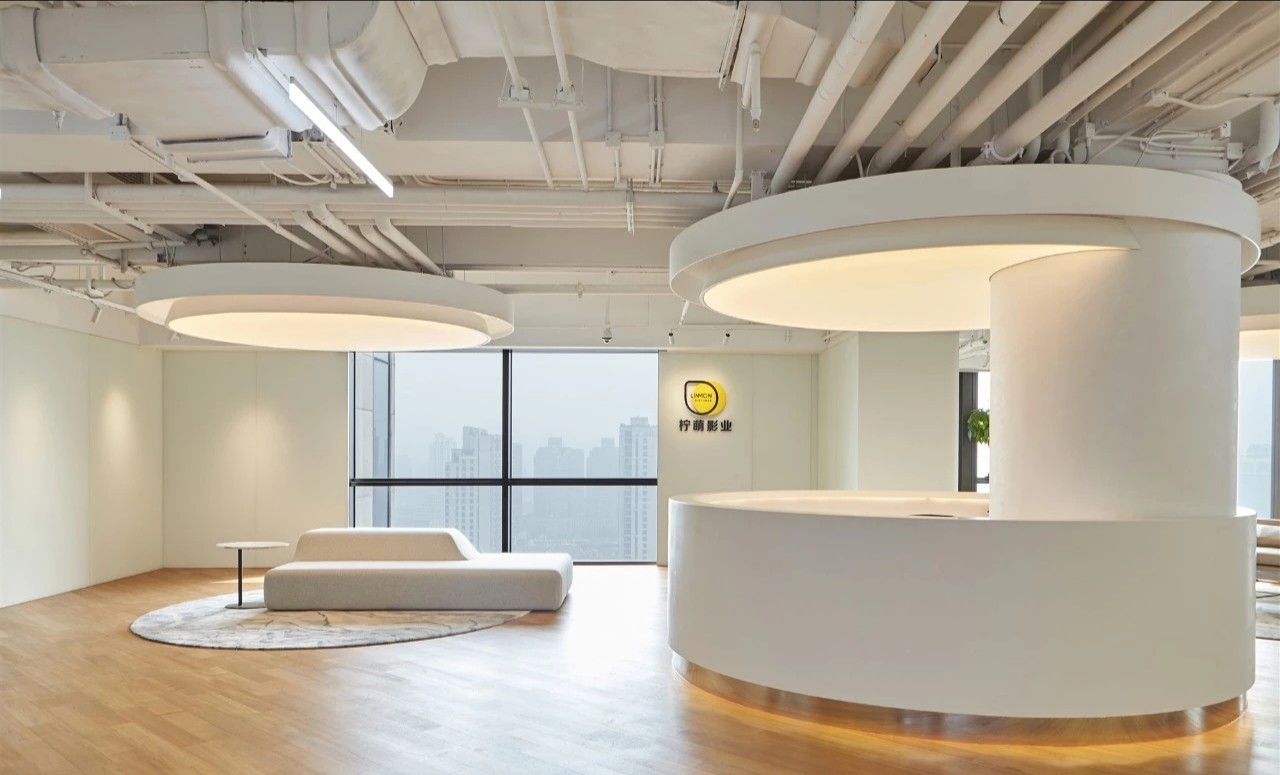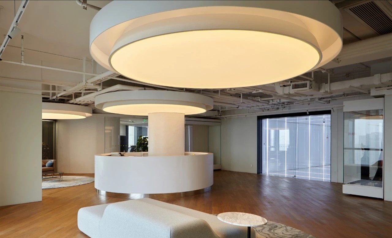 相比改造前的前台,本次设计引入了曲线的元素,两处圆形定制地毯和大面积软膜天花定制灯具的组合,再辅以环型前台和顶部的灯盘,让整个接待区照明更为柔和。