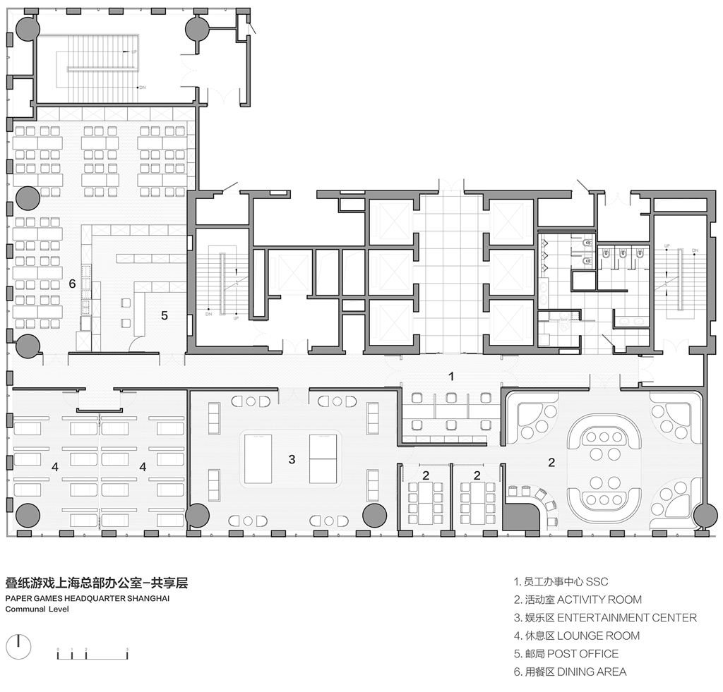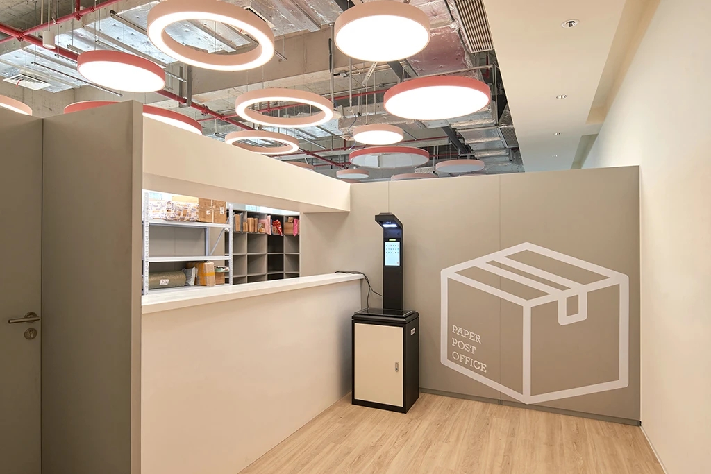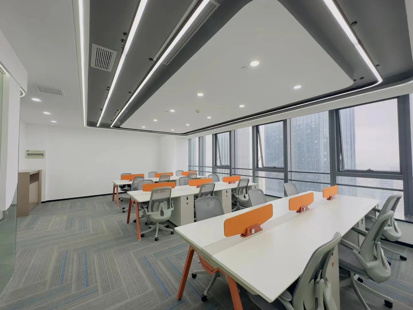 在灯光设计上,南面挑空大堂增加了局部灯带设计营造暖度,呼应了叠纸LOGO的同时,保持了南面挑空大堂的简约氛围。