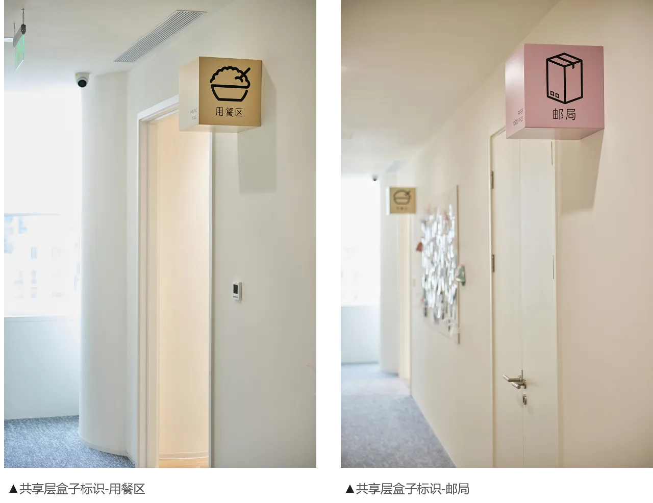 南北入口分别对应了南北两大堂,由于原始大堂铝板无法进行拆除,但在设计上不符合叠纸的企业形象,为了保证后期能还原交付,在设计策略上采用米白色贴膜形式进行改造,各层的电梯间也同样采用此策略。