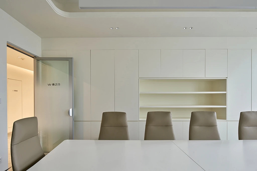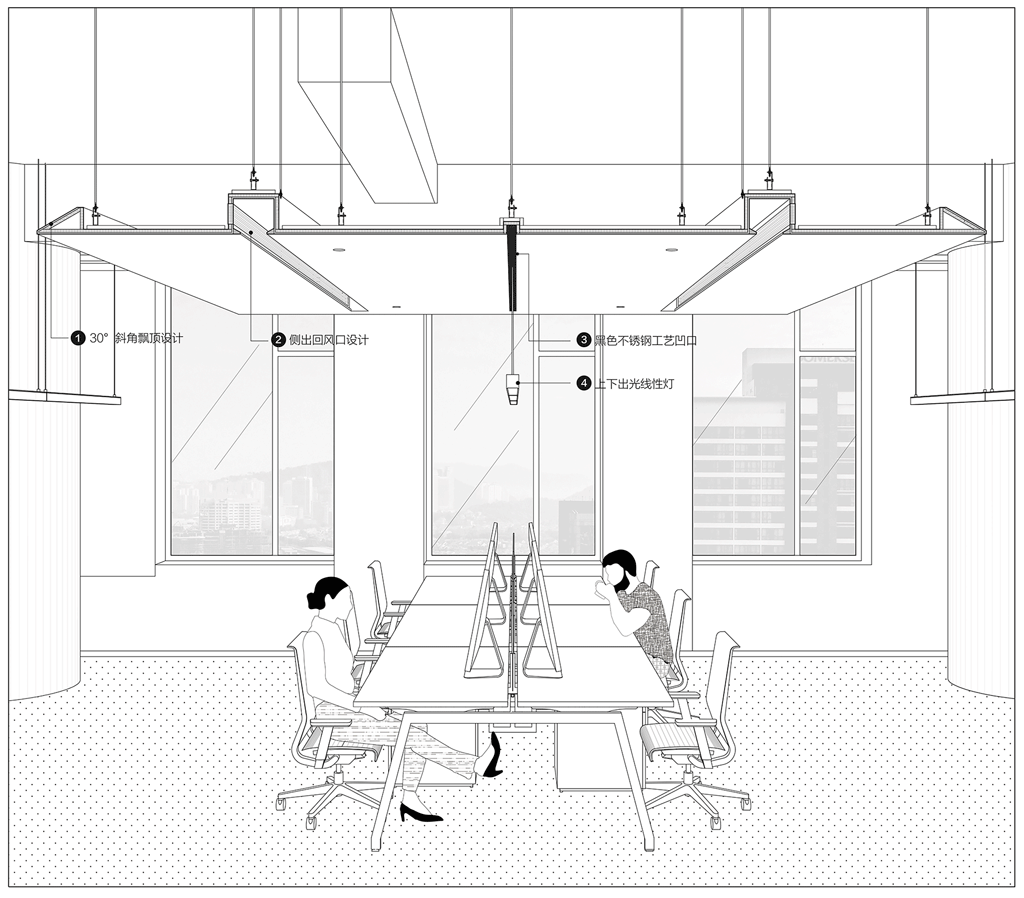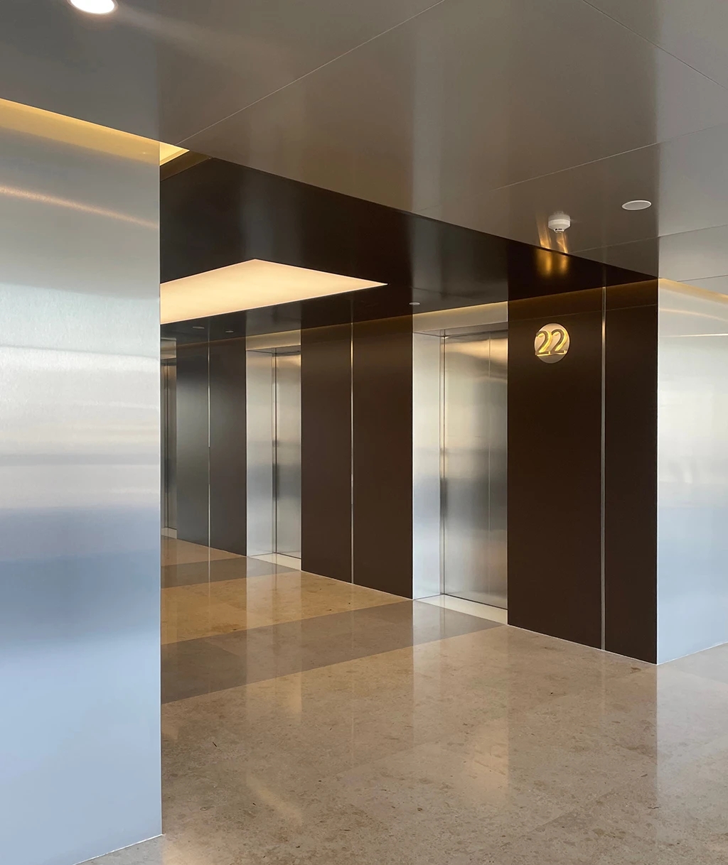22楼的空中大堂为进入高层职能办公区主要入口,并新增了楼梯连接23楼顶层,在大堂入口处迎接访客的是取代常规LOGO的水景,由水景将人引向窗外景色。