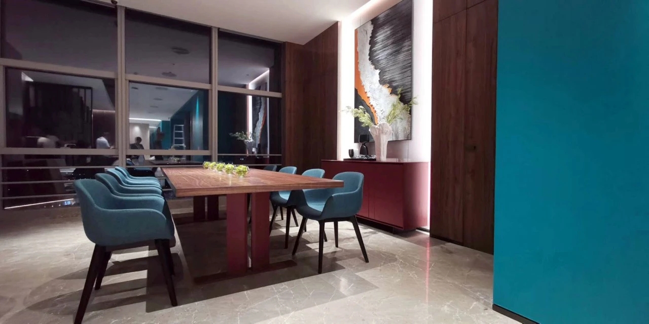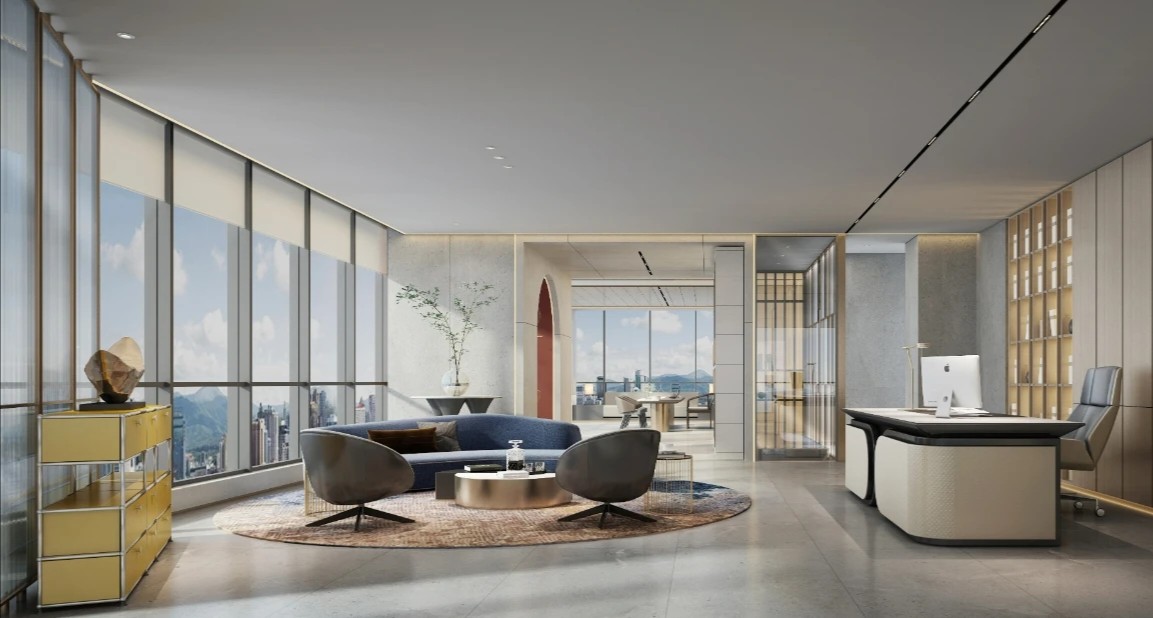 接待区追溯中式哲学精髓的家具,与意大利皇室品牌Poltrona Frau蕴含的尊贵气质,在工艺、材料及配色的交感和应之中迭代韵律,绽放美学新生。秉承「少即是多」的设计哲学,东方传统的审美意境与面向未来的时尚语汇在此得以有机结合,于空中描摹一处超卓社区,触发专注与平衡的归属感。