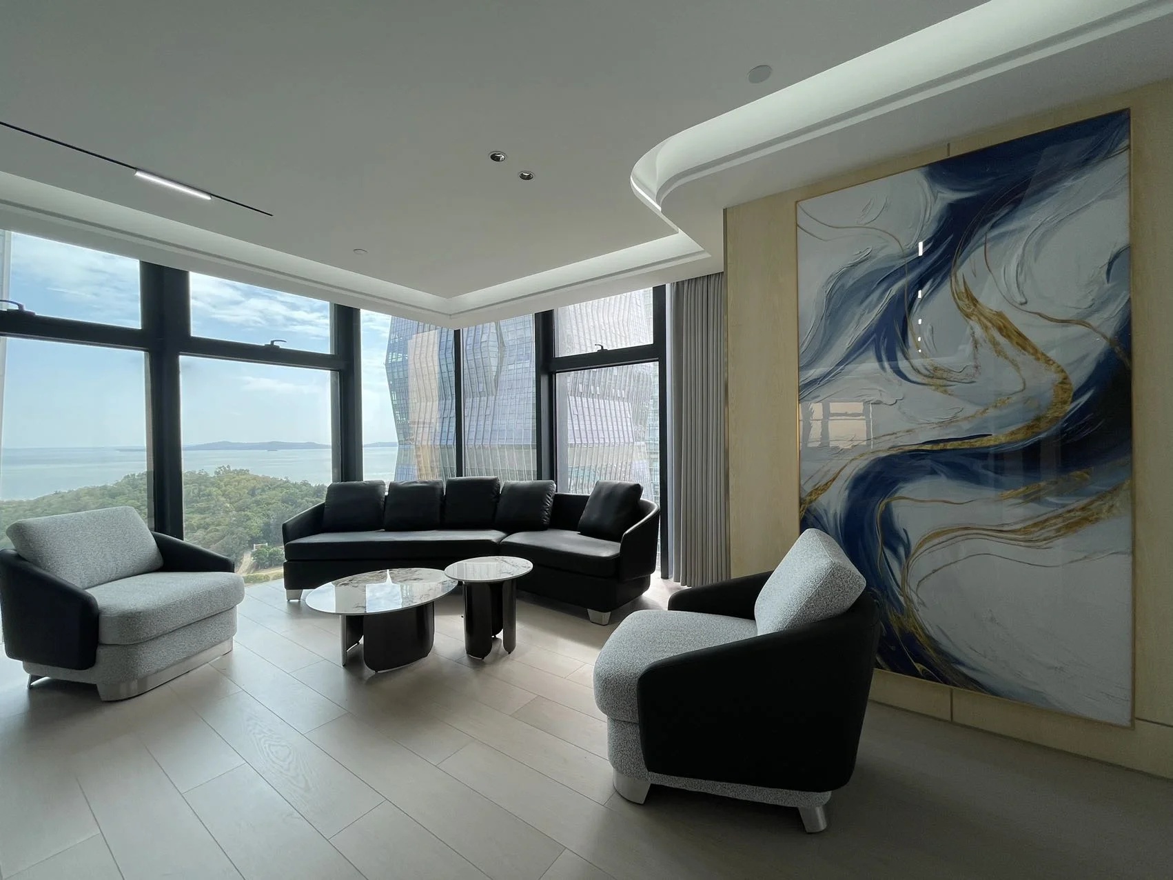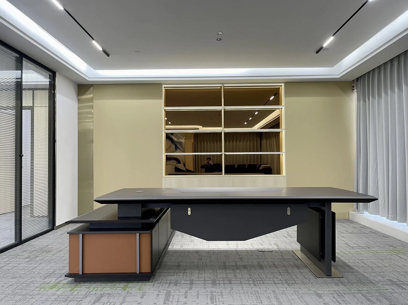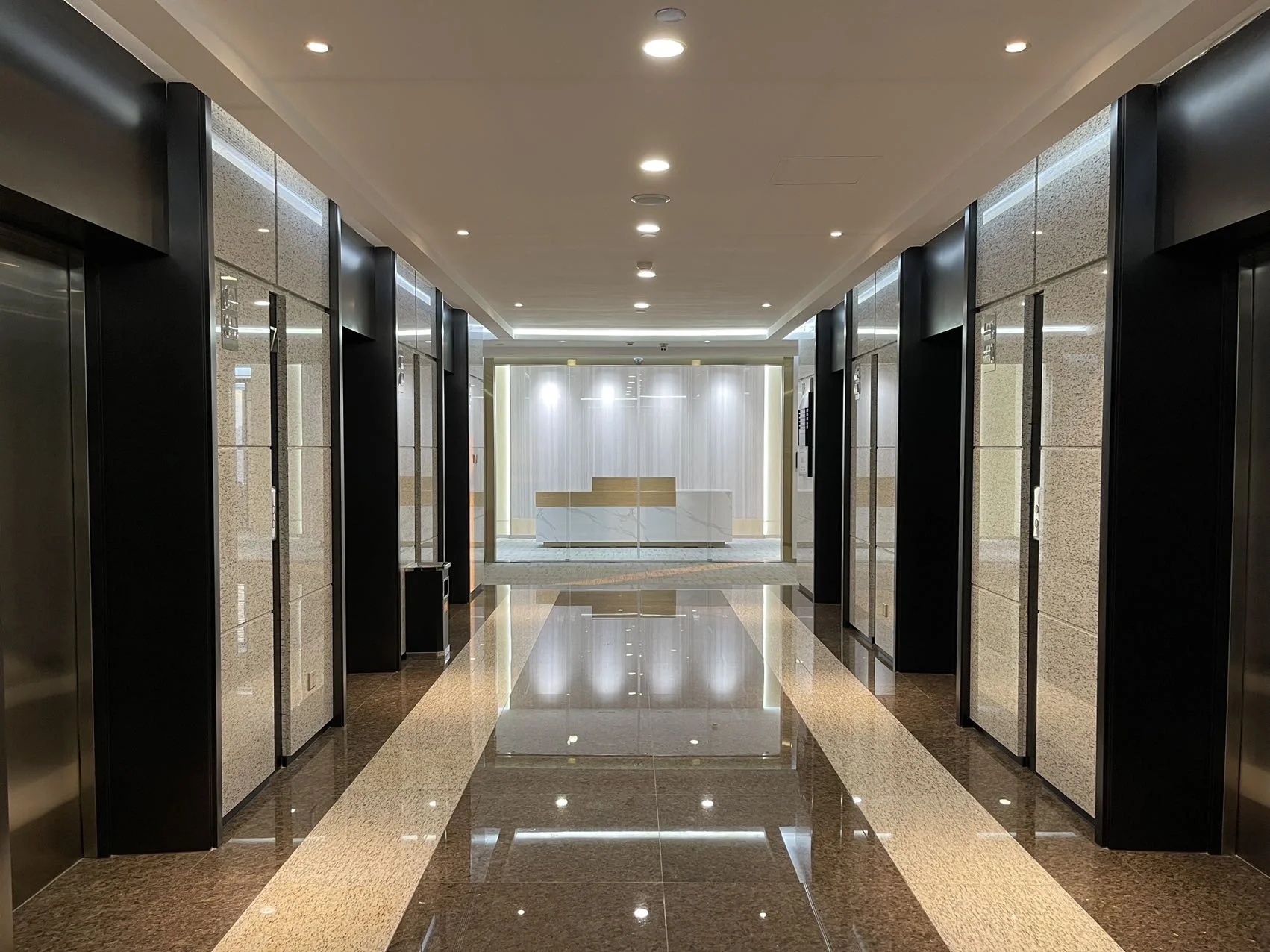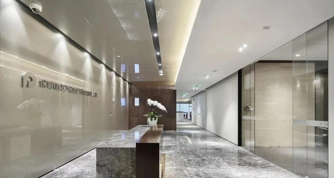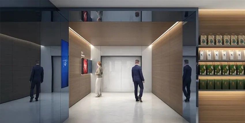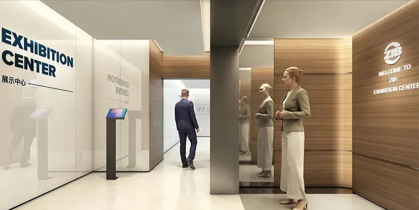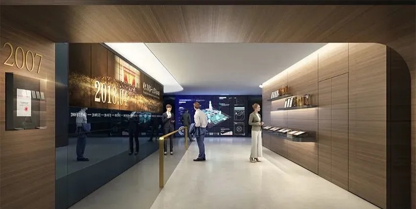 凝练着国贸发展历程的长廊中,沉稳的木材质与深色镜面互相辉映,回应了展厅整体经典、现代的商务基调。