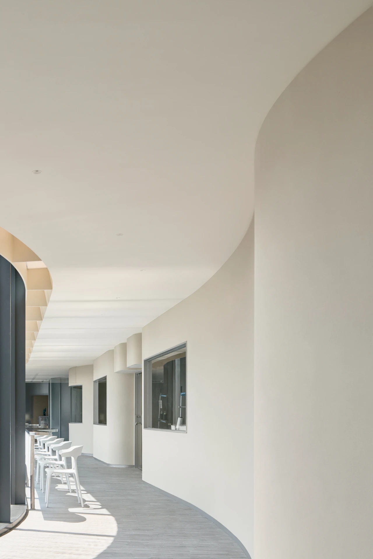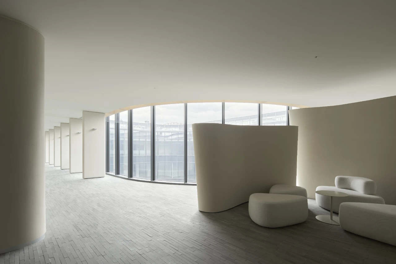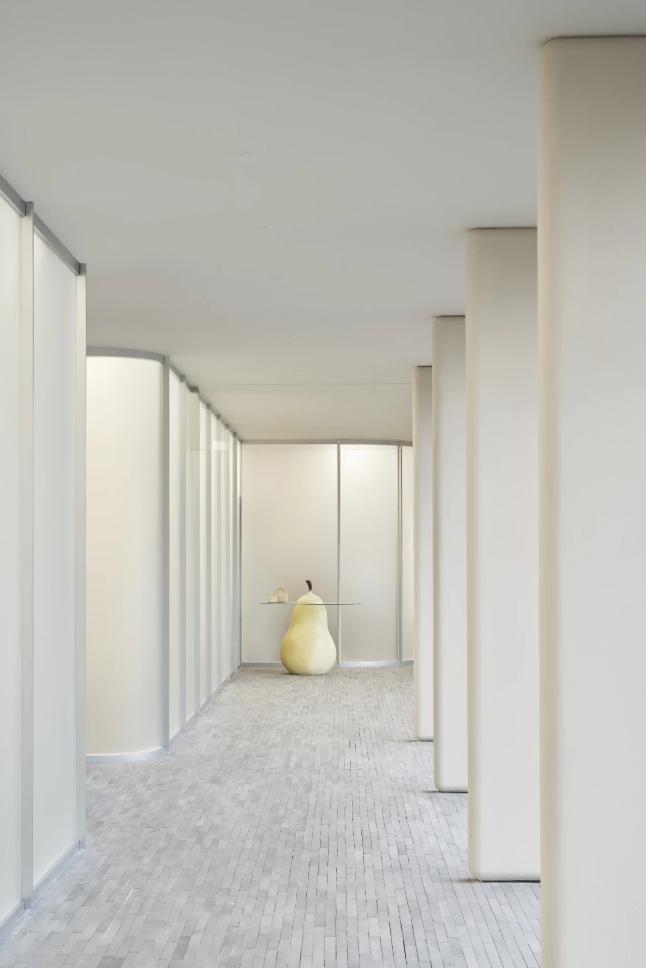 走出电梯厅,即可视作进入了城市的中央广场,对称的路灯引领着人跟着轴线进入到城市中心。墙面灵感来源于旗下的陶陶包,对称且圆润的外形,内折的缝线,暗藏五金件,最大程度消解了人为痕迹,而say将这些包包元素做成了广场中的城市肌理,裁片般的墙体在阴角处平等内收,阳角处圆润打磨,场地生成的逻辑无一不透露着品牌制包的理念。