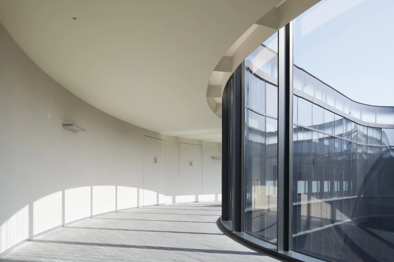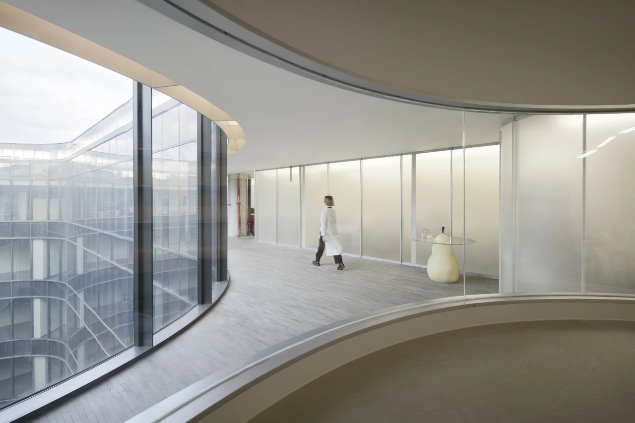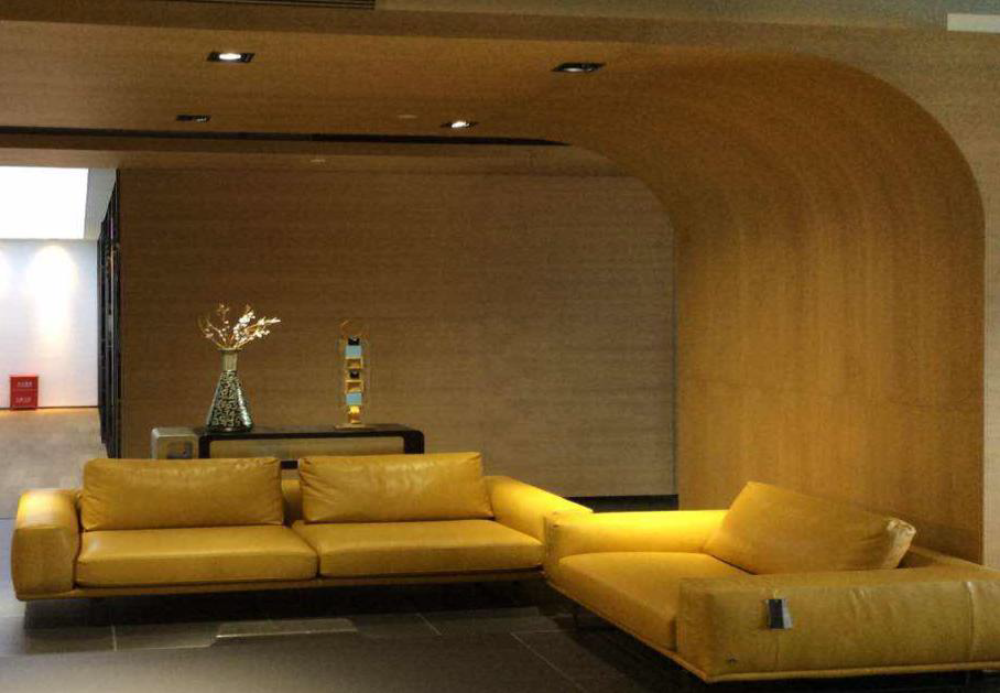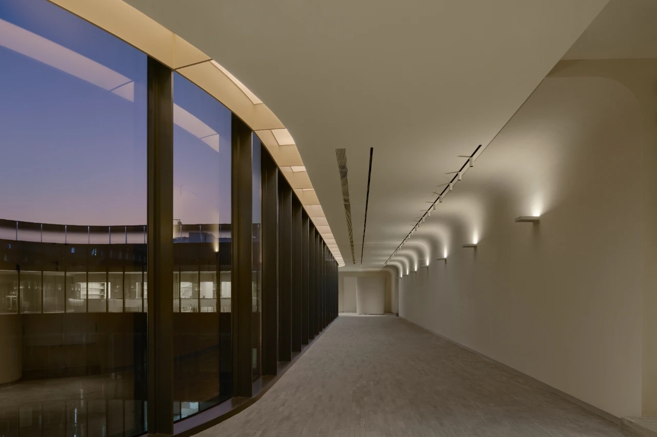 走出电梯厅,即可视作进入了城市的中央广场,对称的路灯引领着人跟着轴线进入到城市中心。墙面灵感来源于旗下的陶陶包,对称且圆润的外形,内折的缝线,暗藏五金件,最大程度消解了人为痕迹,而say将这些包包元素做成了广场中的城市肌理,裁片般的墙体在阴角处平等内收,阳角处圆润打磨,场地生成的逻辑无一不透露着品牌制包的理念。