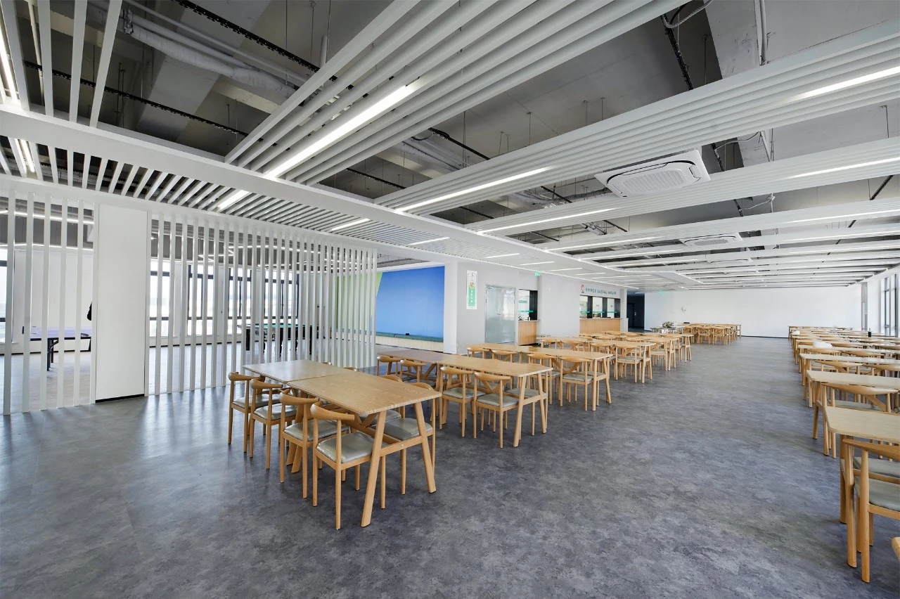 5楼的整层楼面内打造成充满自然氛围的花园式办公场景,以承袭着天然肌理的石为主材,组构单元界面,通过微缩的高度及尺寸,将森林、植被、多肉等室外景观“搬移”至室内,构筑生态的自由和有机情景。