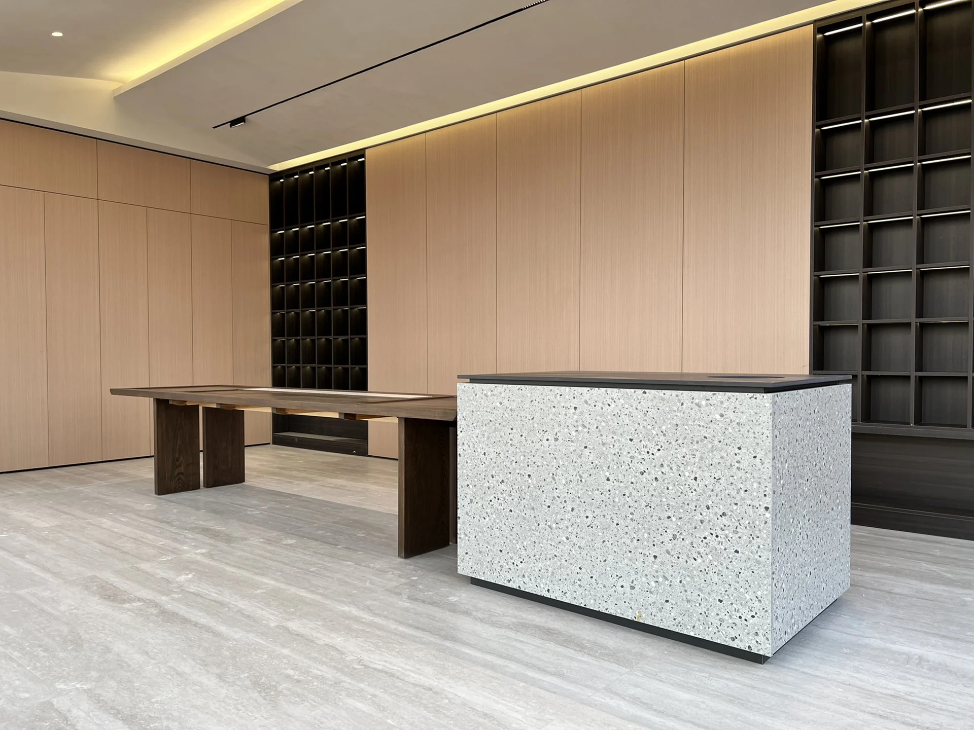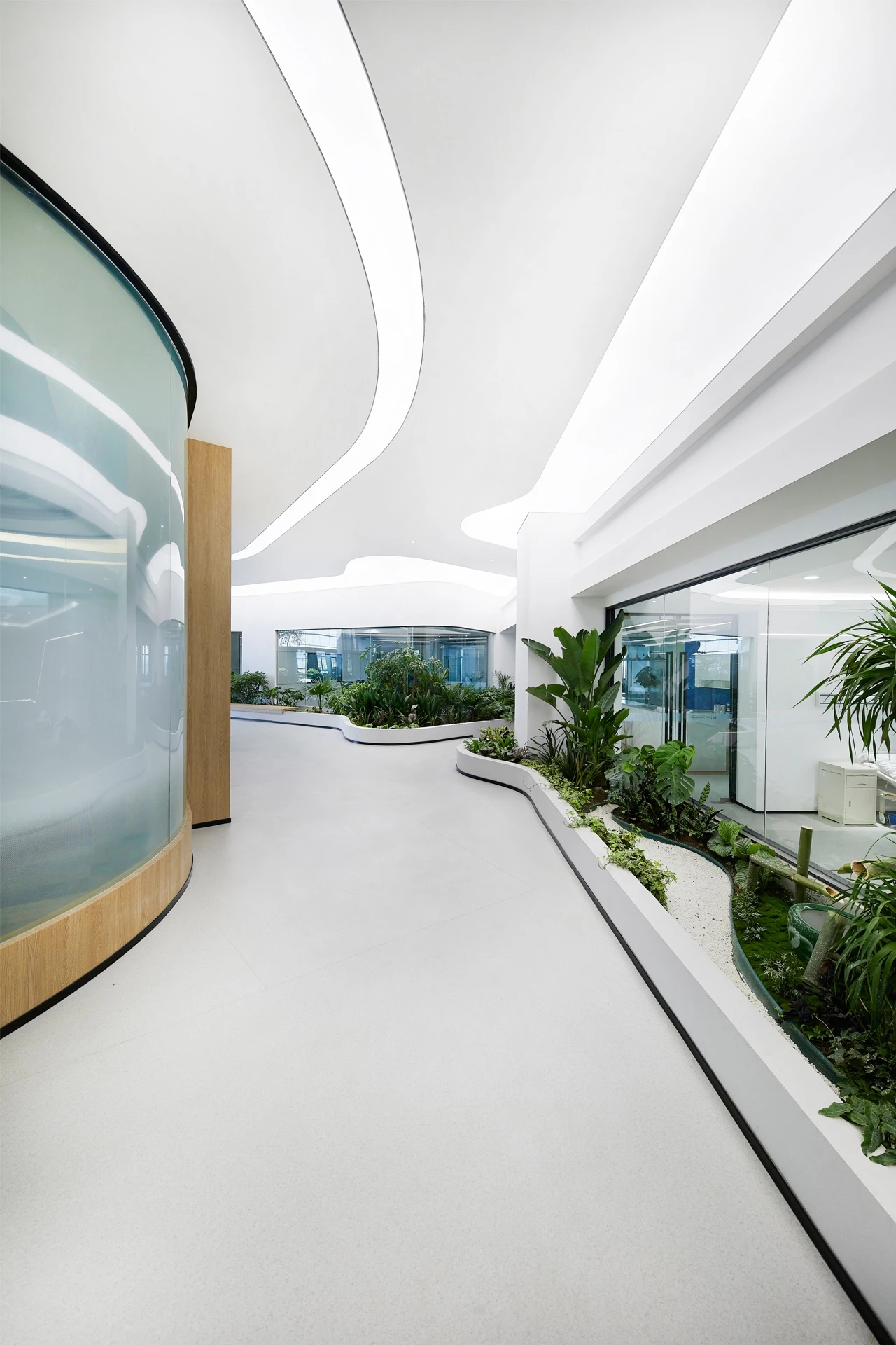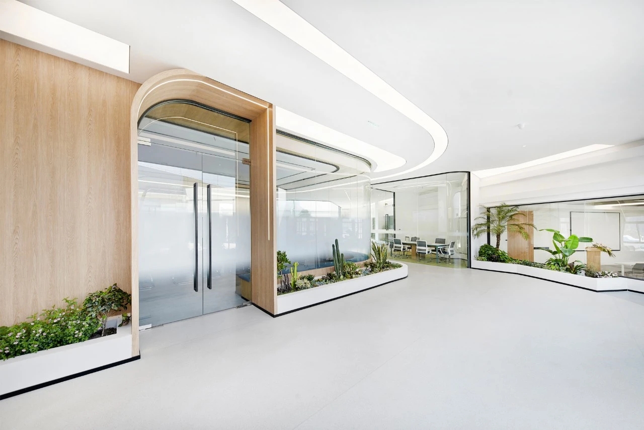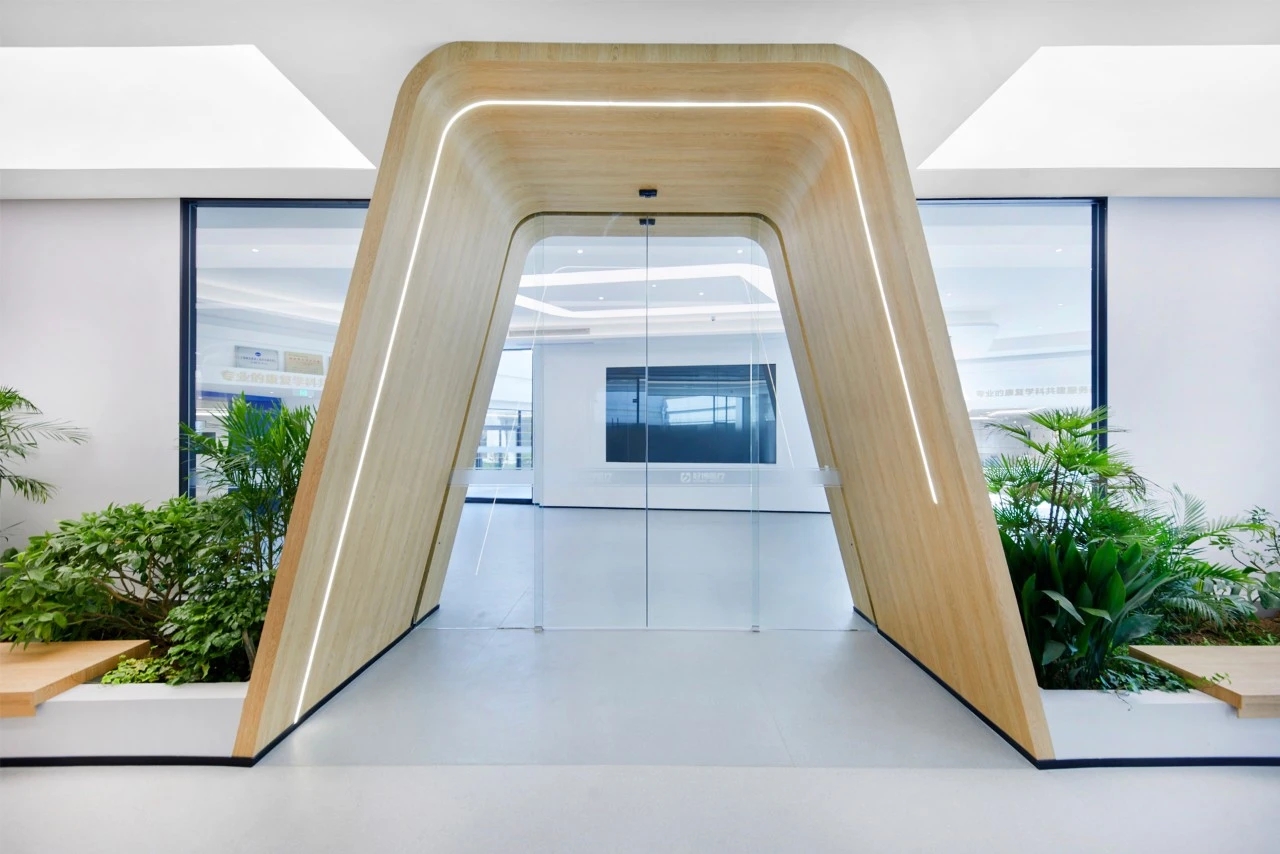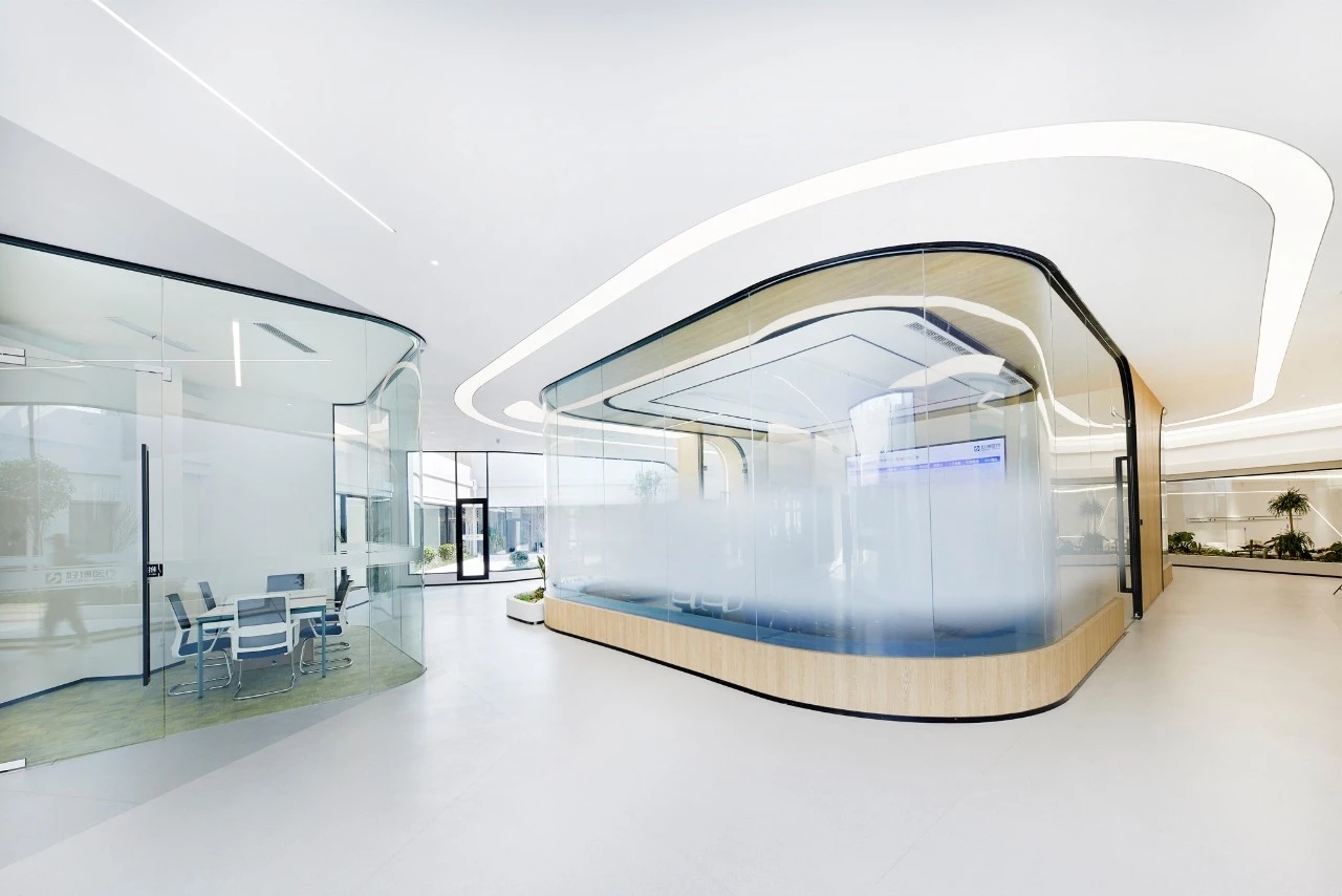 弧线的形态源于自然,往往可以为人们带来更舒适、更柔和的视觉体验。借用弧形与生俱来的艺术美感点亮空间,打造好博独树一帜的风格。作为进入内部空间前奏的一部分,接洽室与前厅自然连接,顺势而为的木纹展现出鲜活的自然生命力,访客们可由此感知空间的情绪传递。