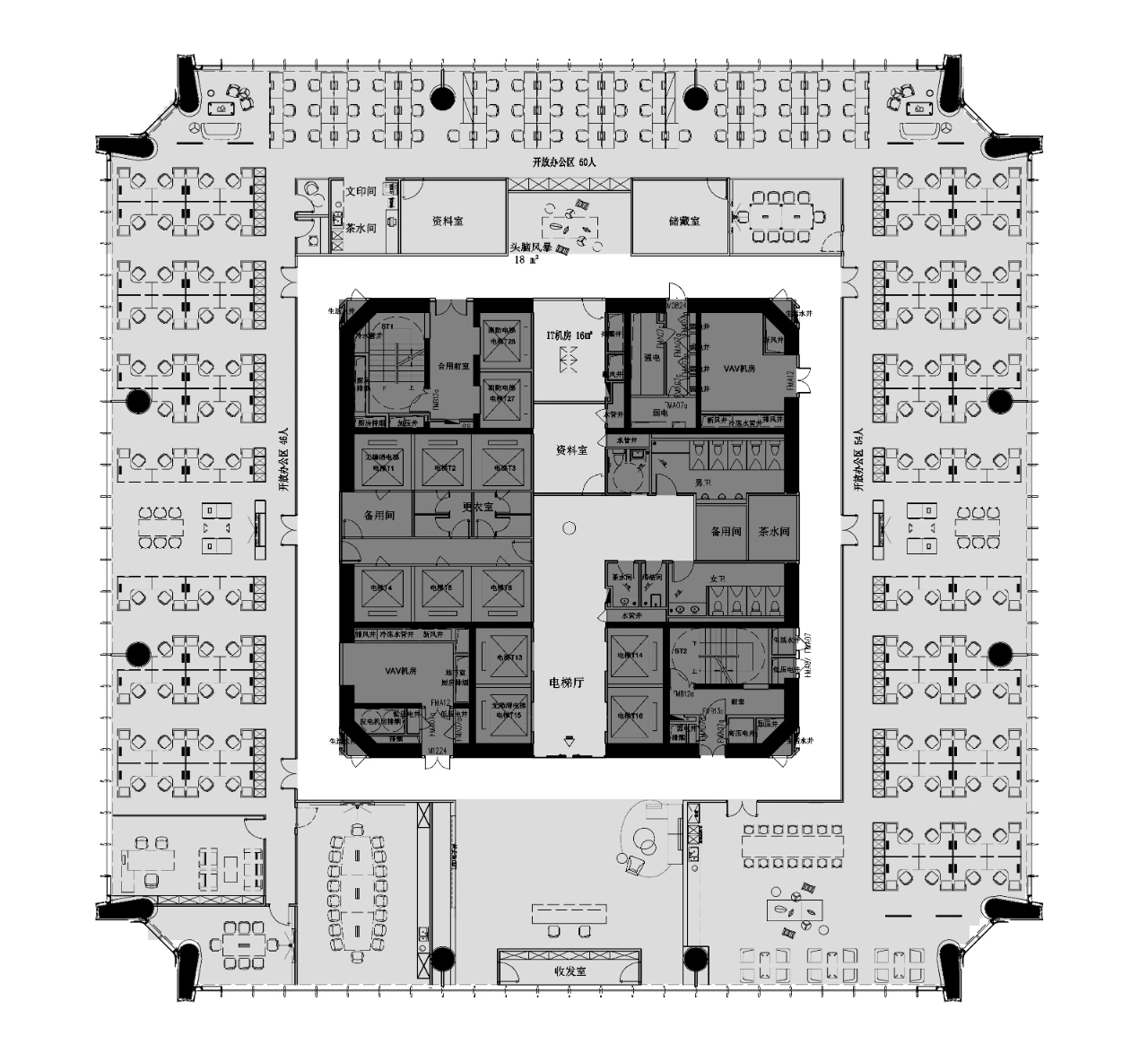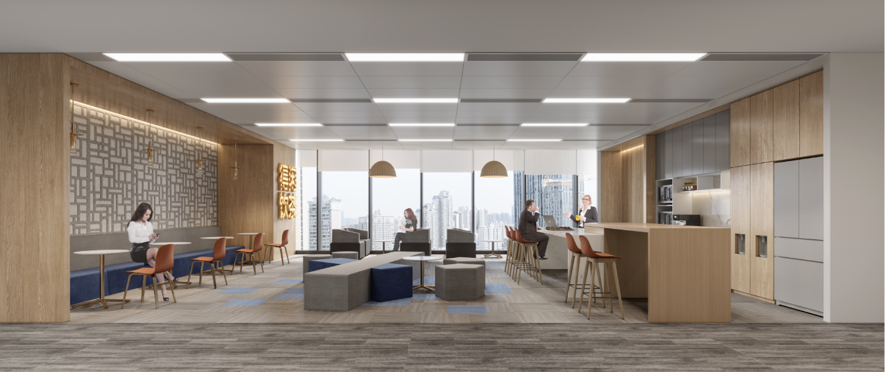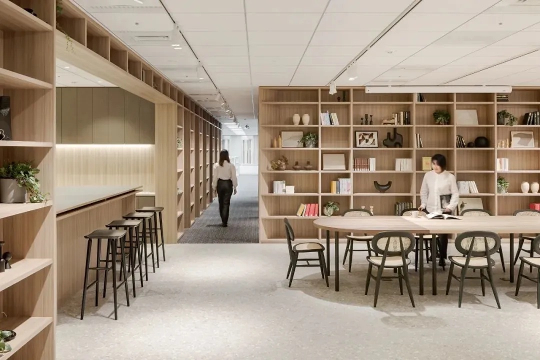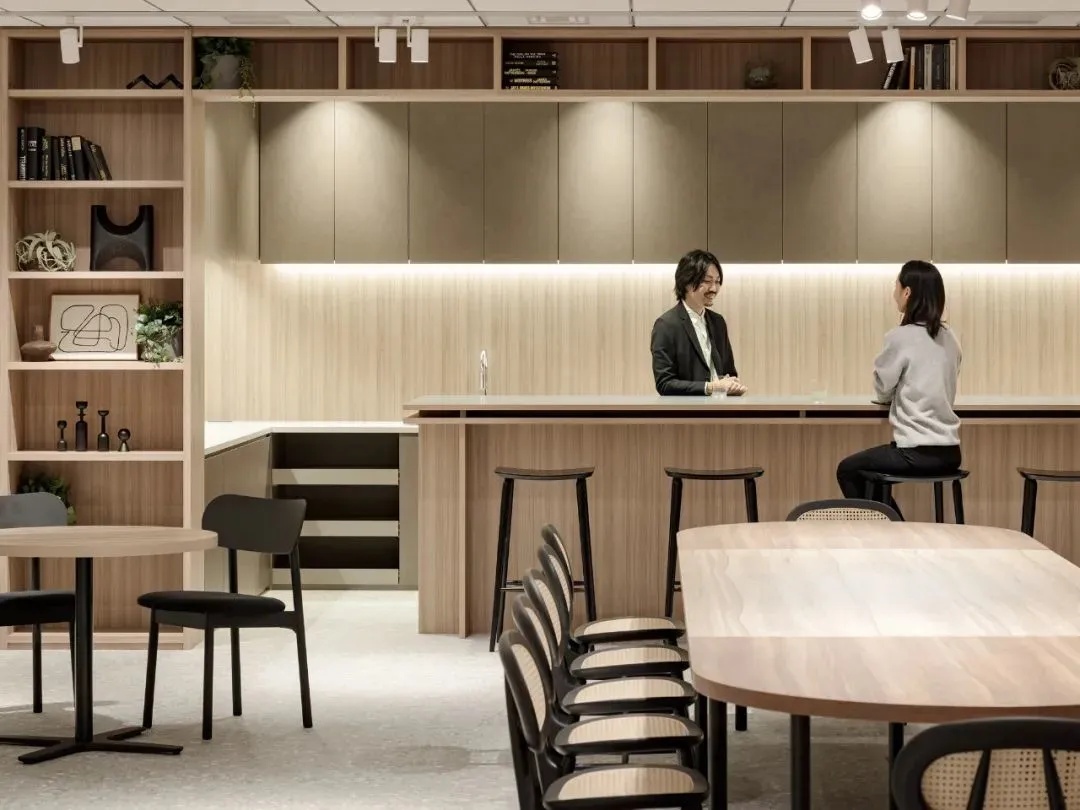 开放水吧以木色与白色为主体。白色主要运用在天花,加上线型灯的设计,显得整个空间更加简洁、流畅。木色的设计主要运用在墙面与柜体,在色彩上有了暖色的加入,让人更能得到心理上的舒适感。卡座沙发背景运用了从人文艺术中提取的西关花窗元素,结合了当地的特色,为员工提供一个自由、满足、互动和开放的休闲空间。