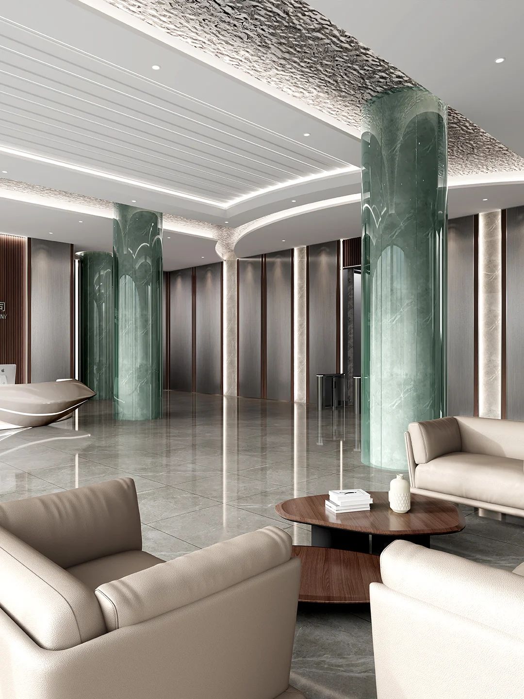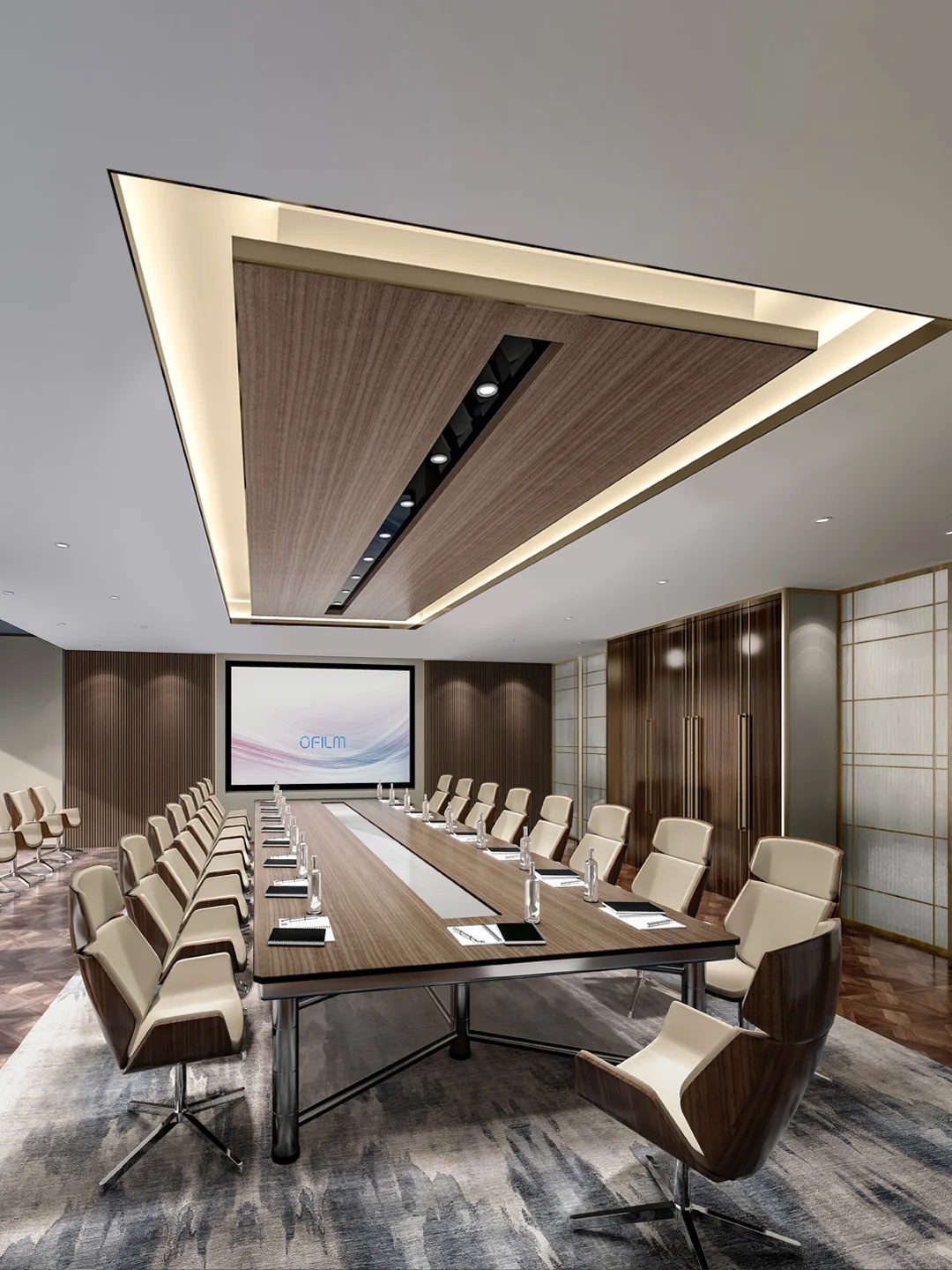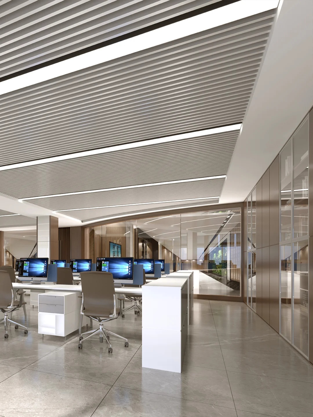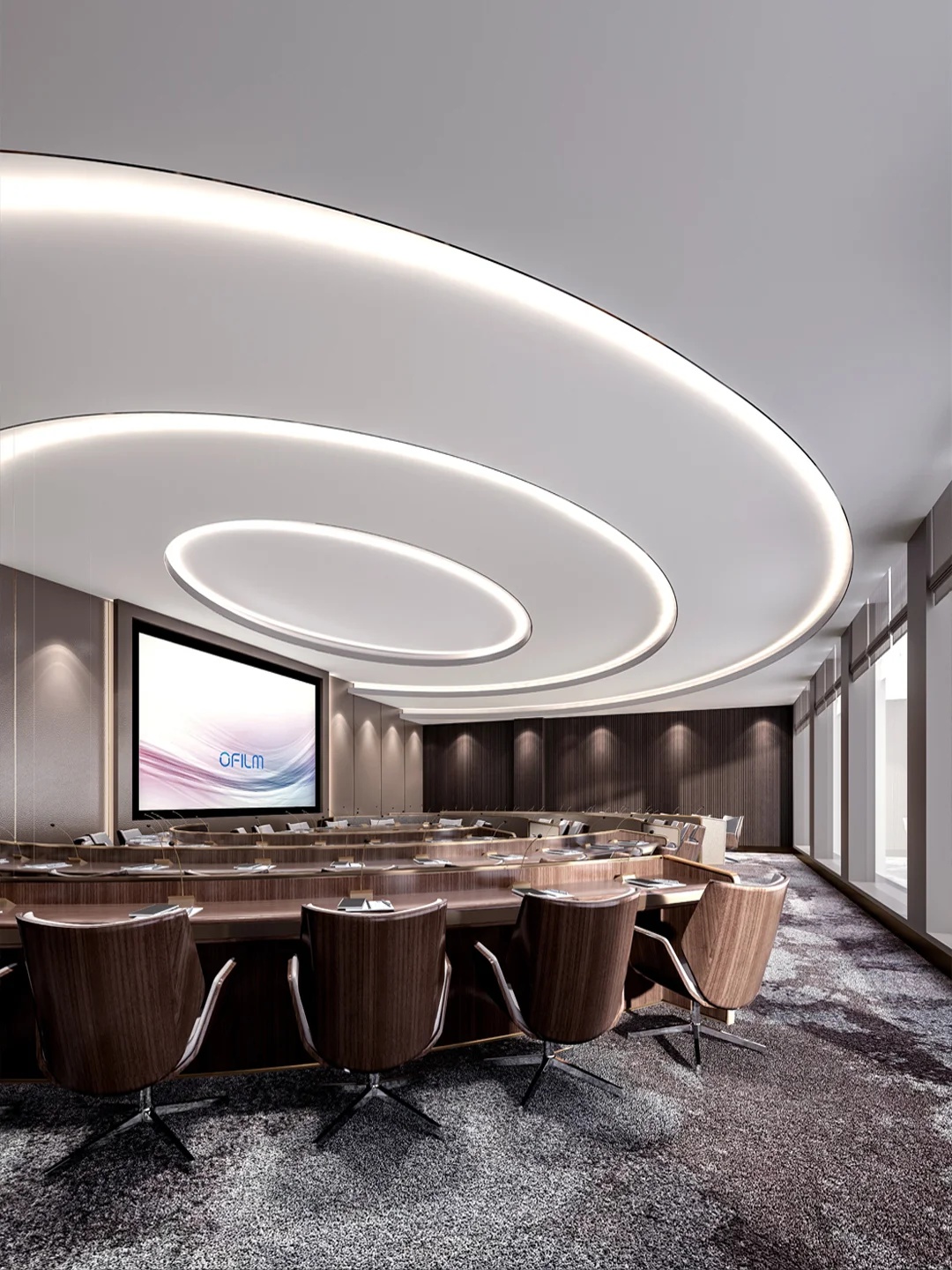 头脑风暴区是一个富有创造力的空间,员工在此可以各抒己见。空间中天花采用的是平顶加线性灯的设计使得更加简洁、干练,墙面上采用的是一个水元素弧线的设计, 当灯光洒下来时就像从天而降的瀑布一样,见光不见灯营造出一种神秘的氛围感。