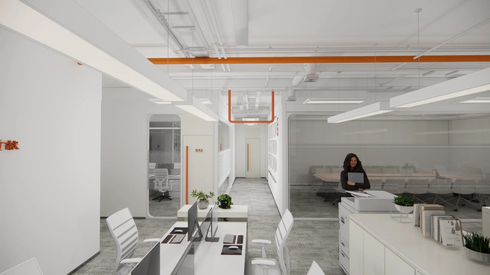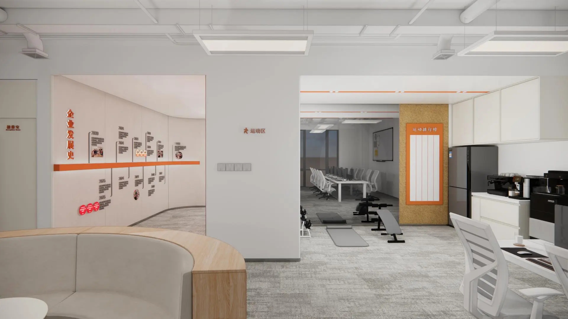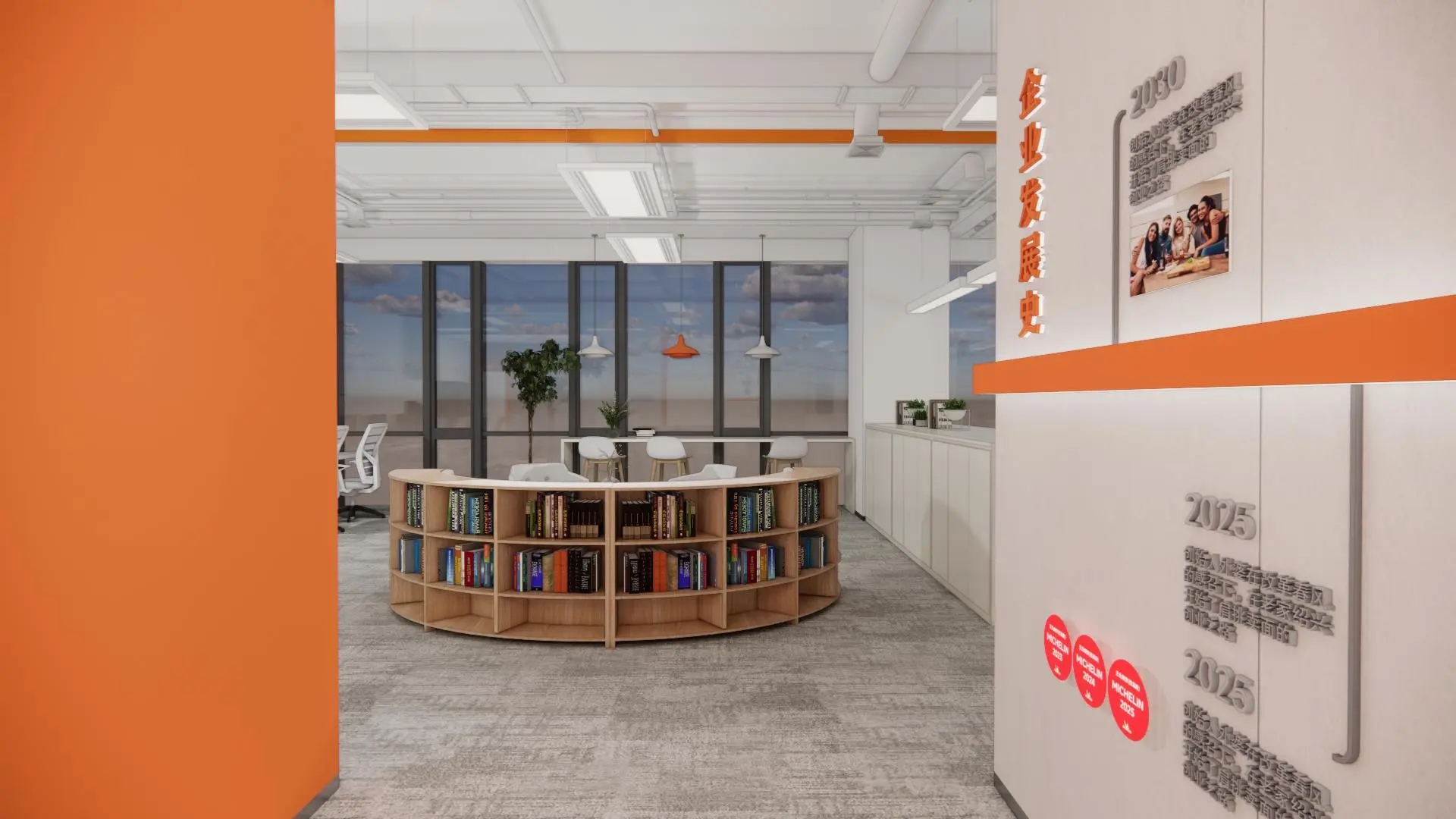前厅作为一个欢迎枢纽,奠定了开放与连接的基调。橙色作为品牌色被点缀于各个角落,为整个空间注入活力,既彰显出积极向上、蓬勃生机的品牌个性,也寓意企业如朝阳般冉冉升起。