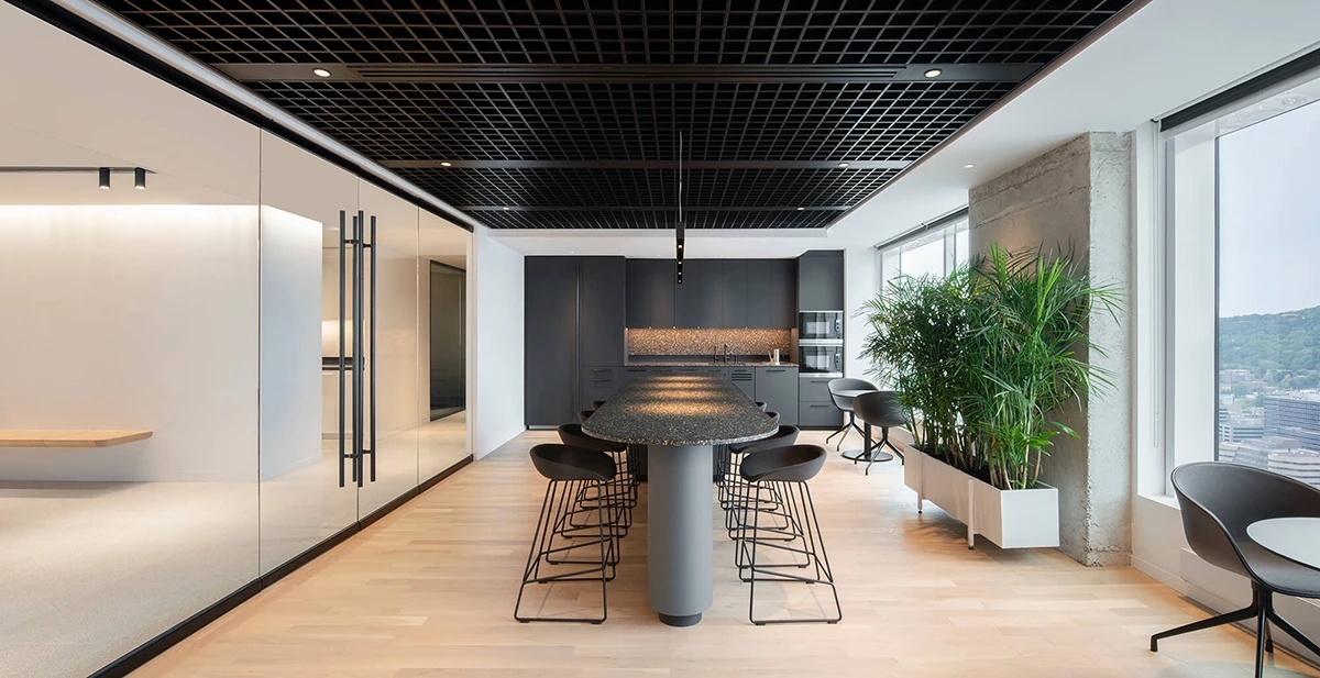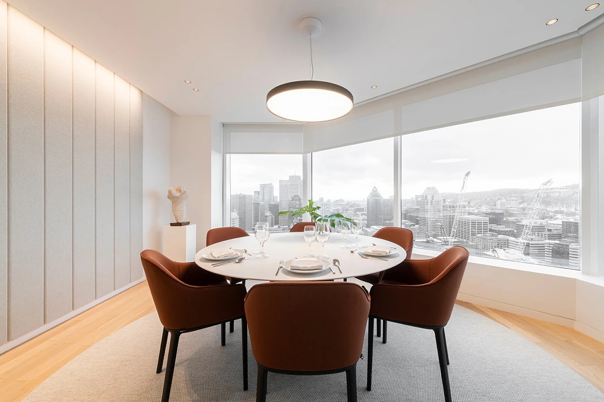 第39层围绕保留的核心区域进行重新规划,化身为采光充沛的迎宾楼层。这里既接待贵宾与德雅尔丹斯高管,还配备行政厨房满足餐饮需求。通过设置多个娱乐空间、休闲厅、分组讨论室以及兼具会议功能的行政餐厅,这个大型金融合作社得以高效顺畅地开展运营。