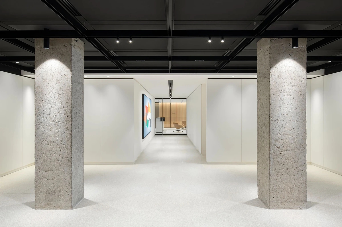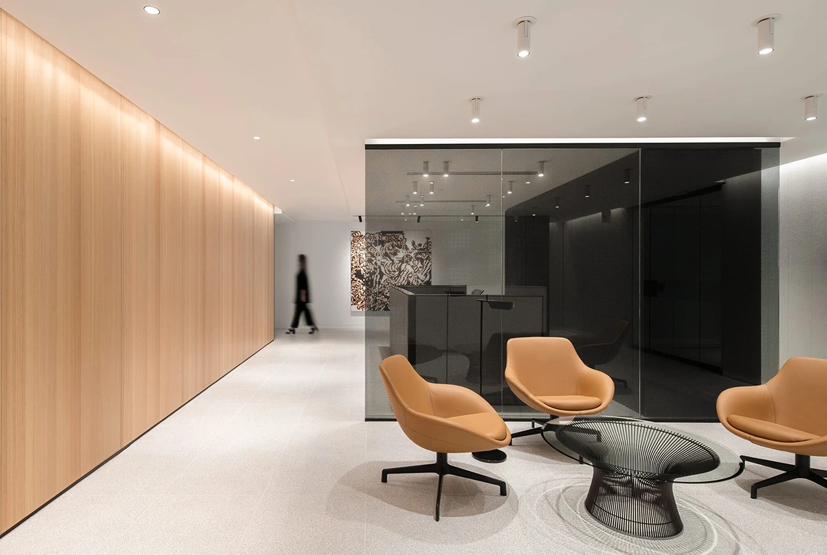 项目面临的挑战在于如何将其谦逊朴素的内核与实力雄厚的金融机构形象相融合。室内设计恰到好处地平衡了这些要素,并为空间注入诗意韵味。为营造温馨宜人的体验,设计师通过舒适惬意的等候区、亲生物元素与艺术陈设,为访客构筑沉浸式空间体验。最终营造出既空灵优雅、富有当代感,又不失沉稳内敛的整体氛围。
