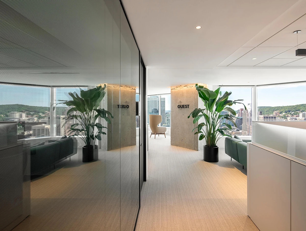 一条精心打造的艺术步道贯穿室内空间,用户的行走路线沿途点缀着Desjardins的艺术藏品中以及绿植景观。高效节能的LED灯光精心打亮了风格各异的艺术品,在展现丰富馆藏艺术魅力的同时,亦强化了高管楼层建筑肌理与内部通道的视觉表现。