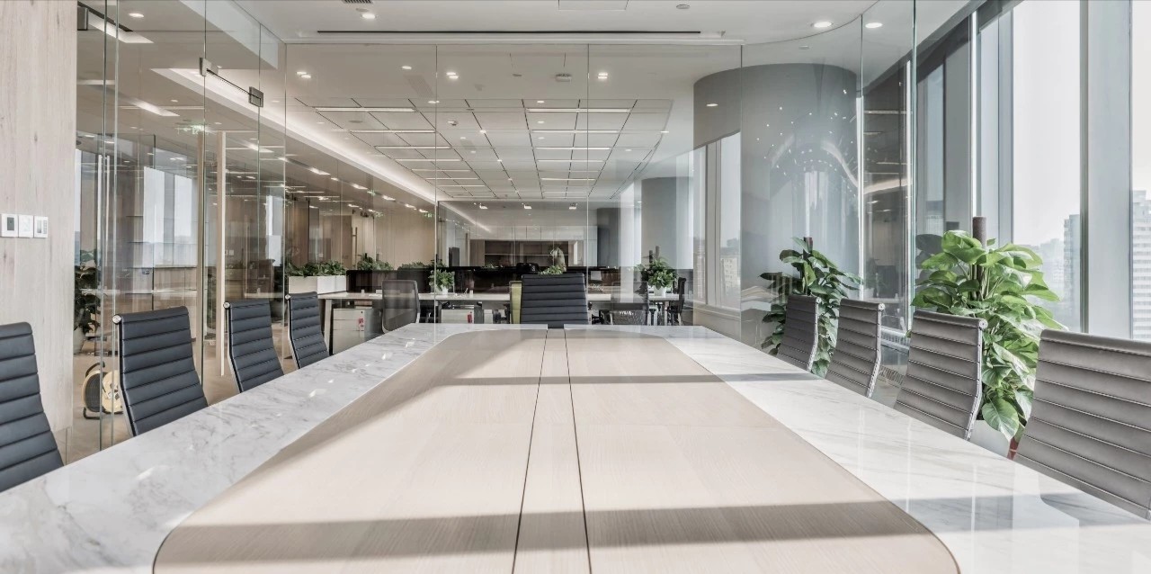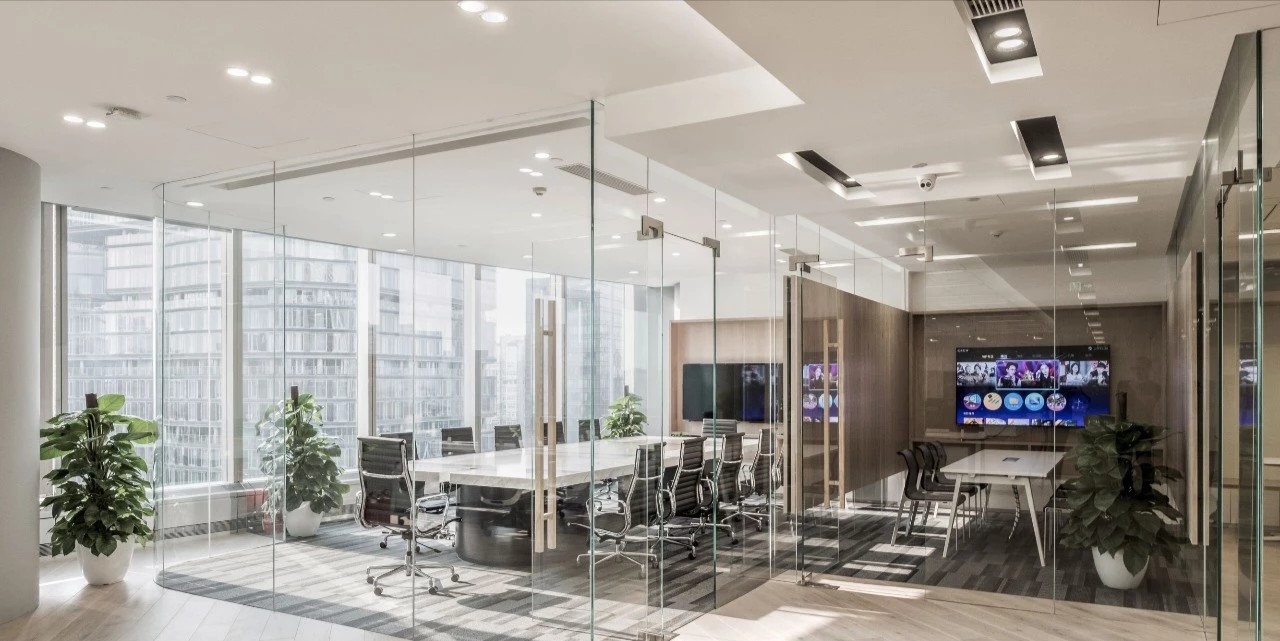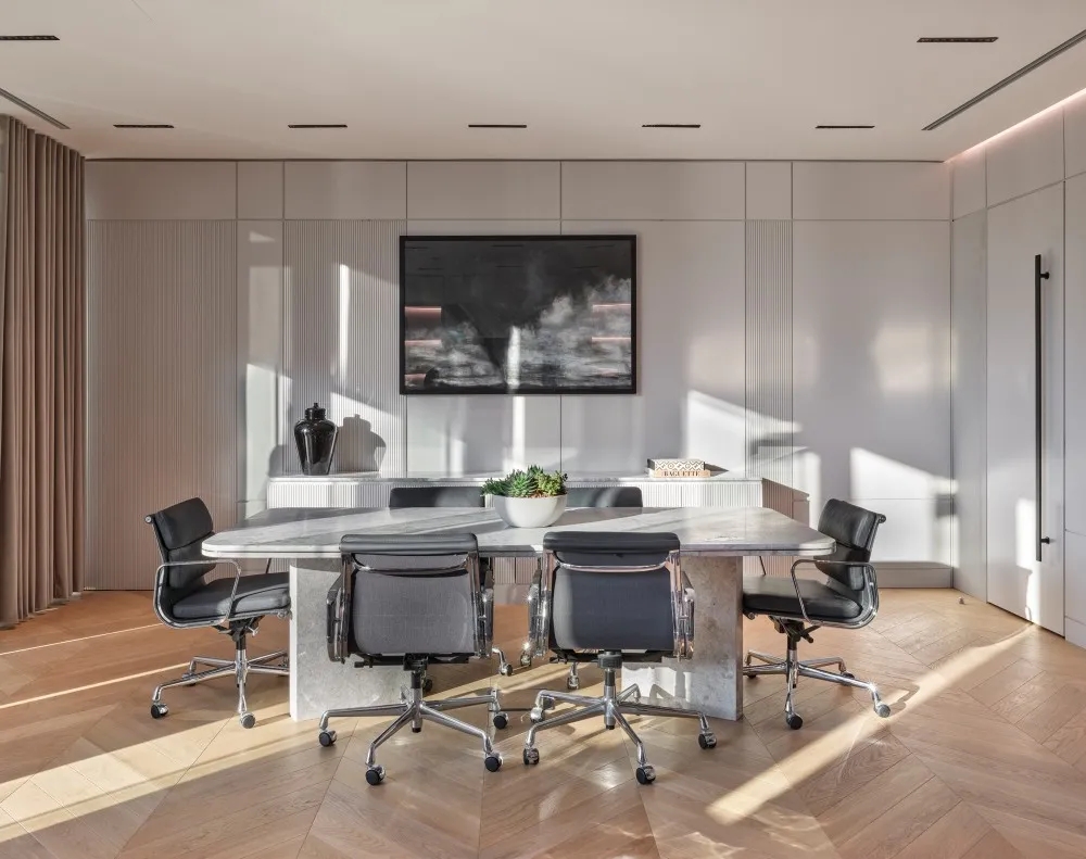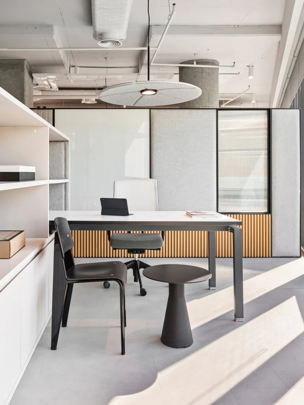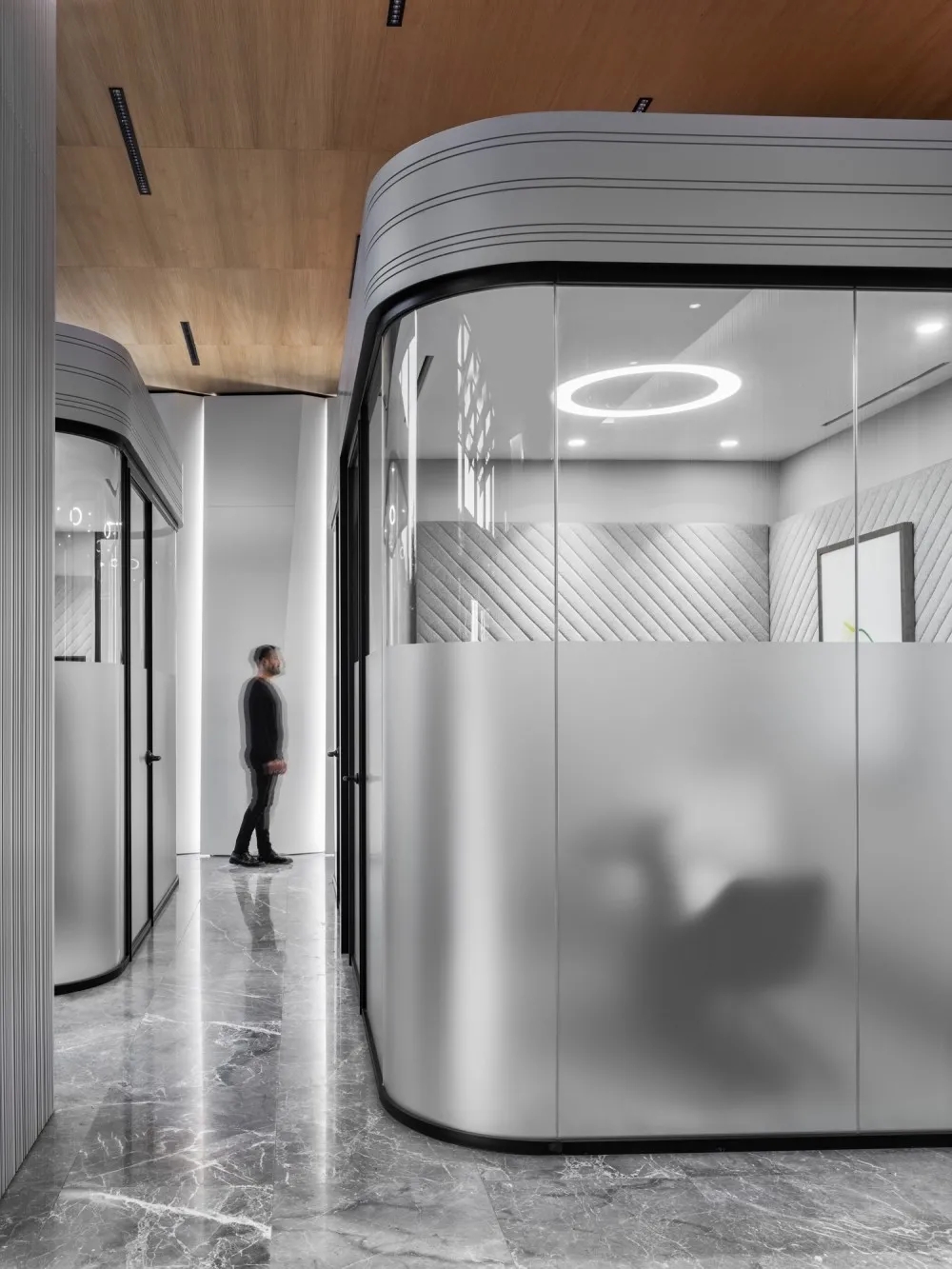 玻璃隔断用于将会议室和私人橱柜与开放式办公室隔开,以利用自然光,创造透明通风的工作场所。白色、灰色和黑色的基本色调,以天然木材和石材表面为重点,为工作场所的创造性工作创造了一个干净舒适的背景。墙壁纺织面板和天花板抛光垫确保共享和封闭空间所需的声学特性。