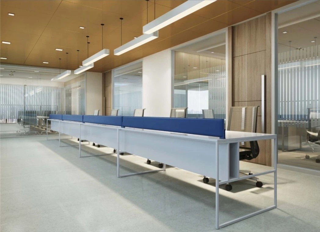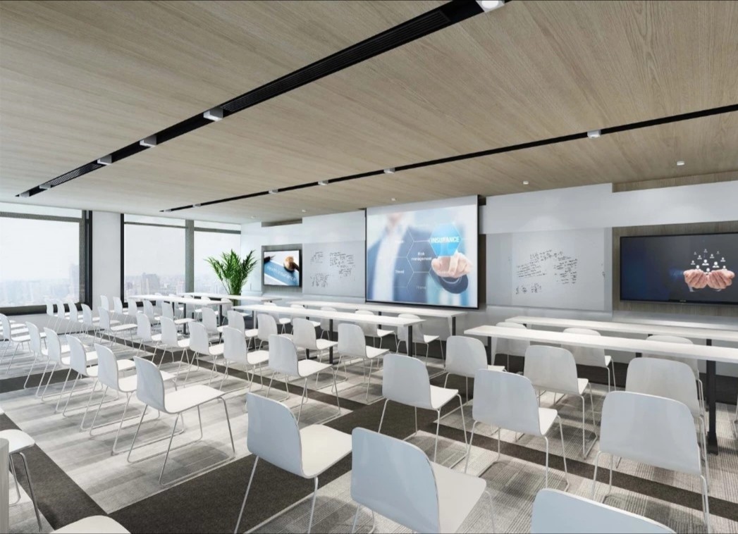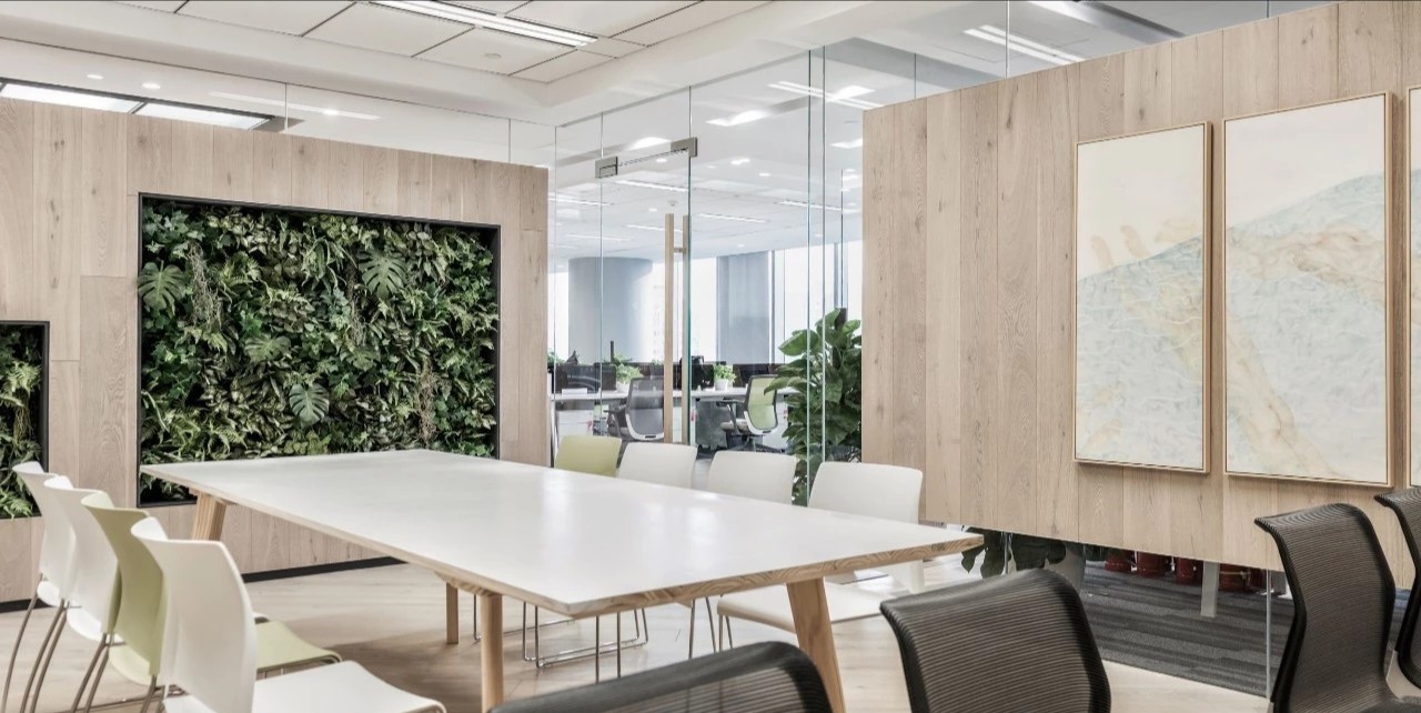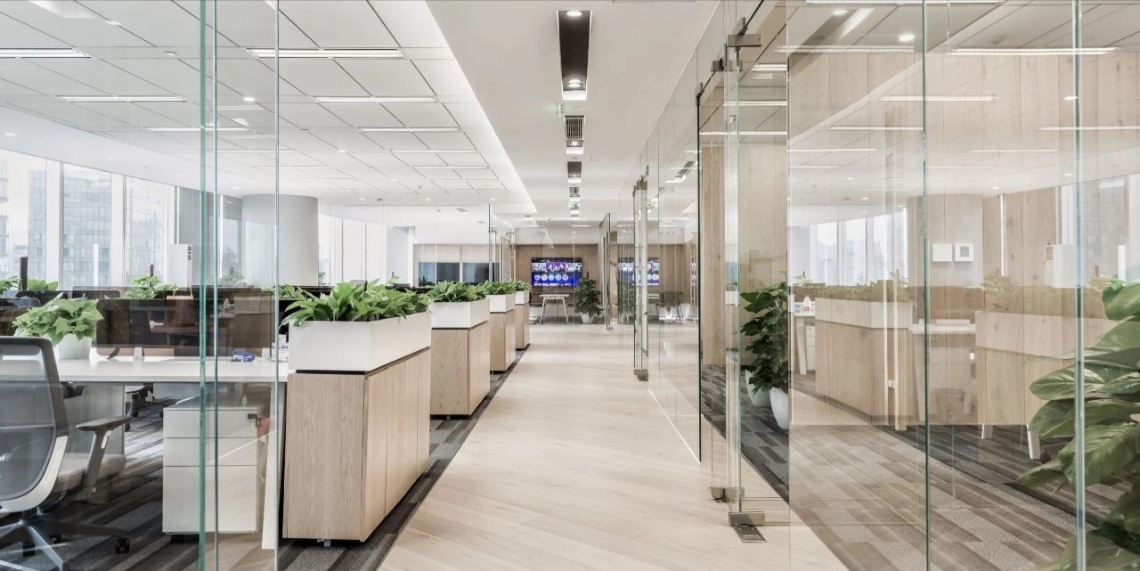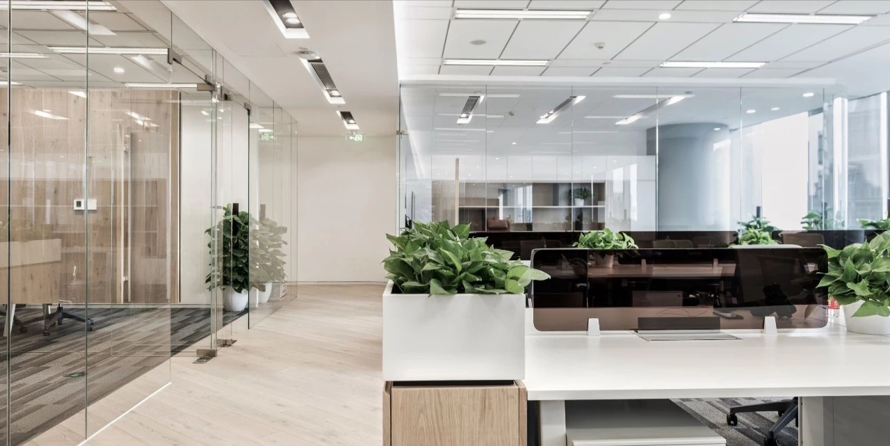 玻璃隔断用于将会议室和私人橱柜与开放式办公室隔开,以利用自然光,创造透明通风的工作场所。白色、灰色和黑色的基本色调,以天然木材和石材表面为重点,为工作场所的创造性工作创造了一个干净舒适的背景。墙壁纺织面板和天花板抛光垫确保共享和封闭空间所需的声学特性。