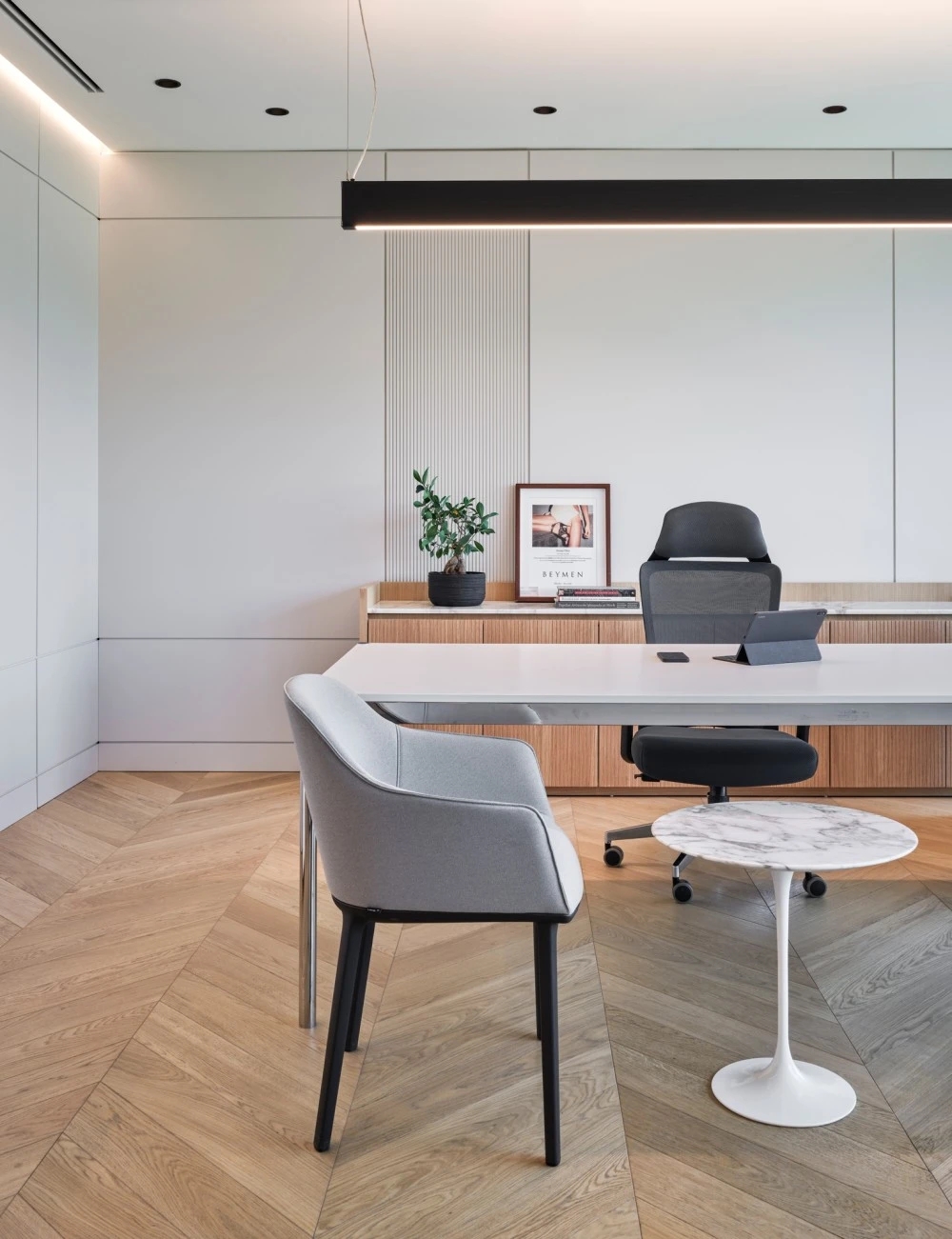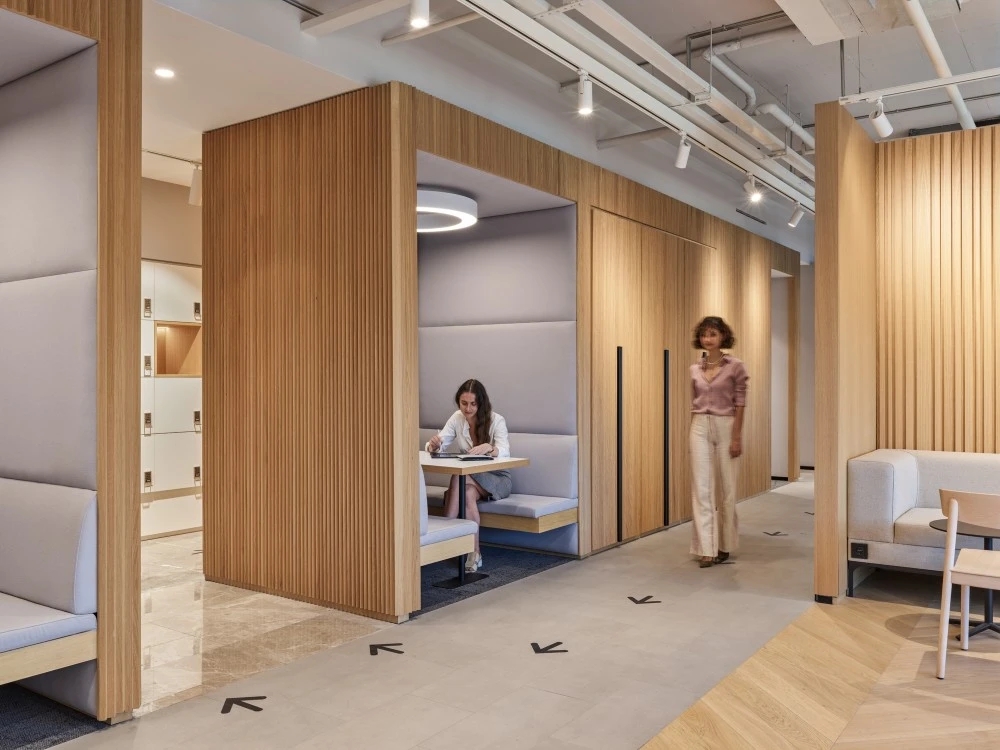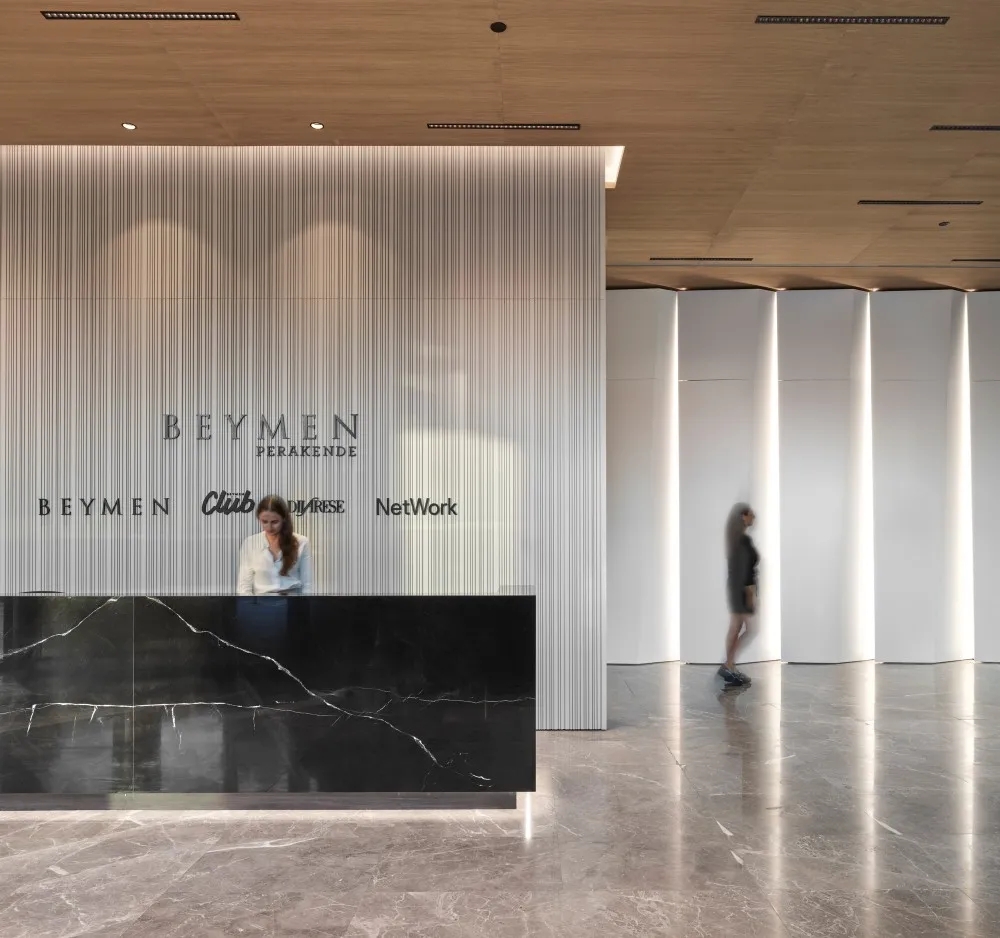 Yalın Tan + Partners 被一家高档时尚零售公司Beymen Group雇佣, 设计位于土耳其伊斯坦布尔的办公室。10层楼的每一层都被一个独立的品牌或部门占据。在一楼的主入口,设有带休息座位和会议空间的接待处,可容纳游客。接待区周围的定制墙板模仿织物的褶皱,支持为零售品牌的工作场所创造的设计叙事。为所有团队成员提供各种团体座位安排的共享自助餐厅位于地下一层。