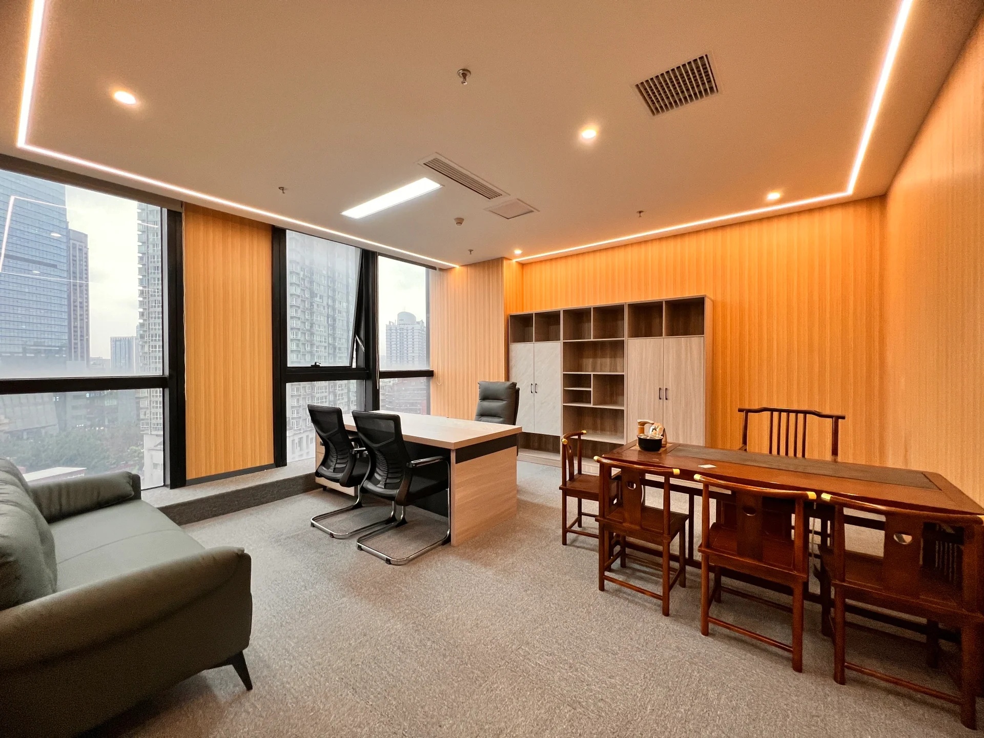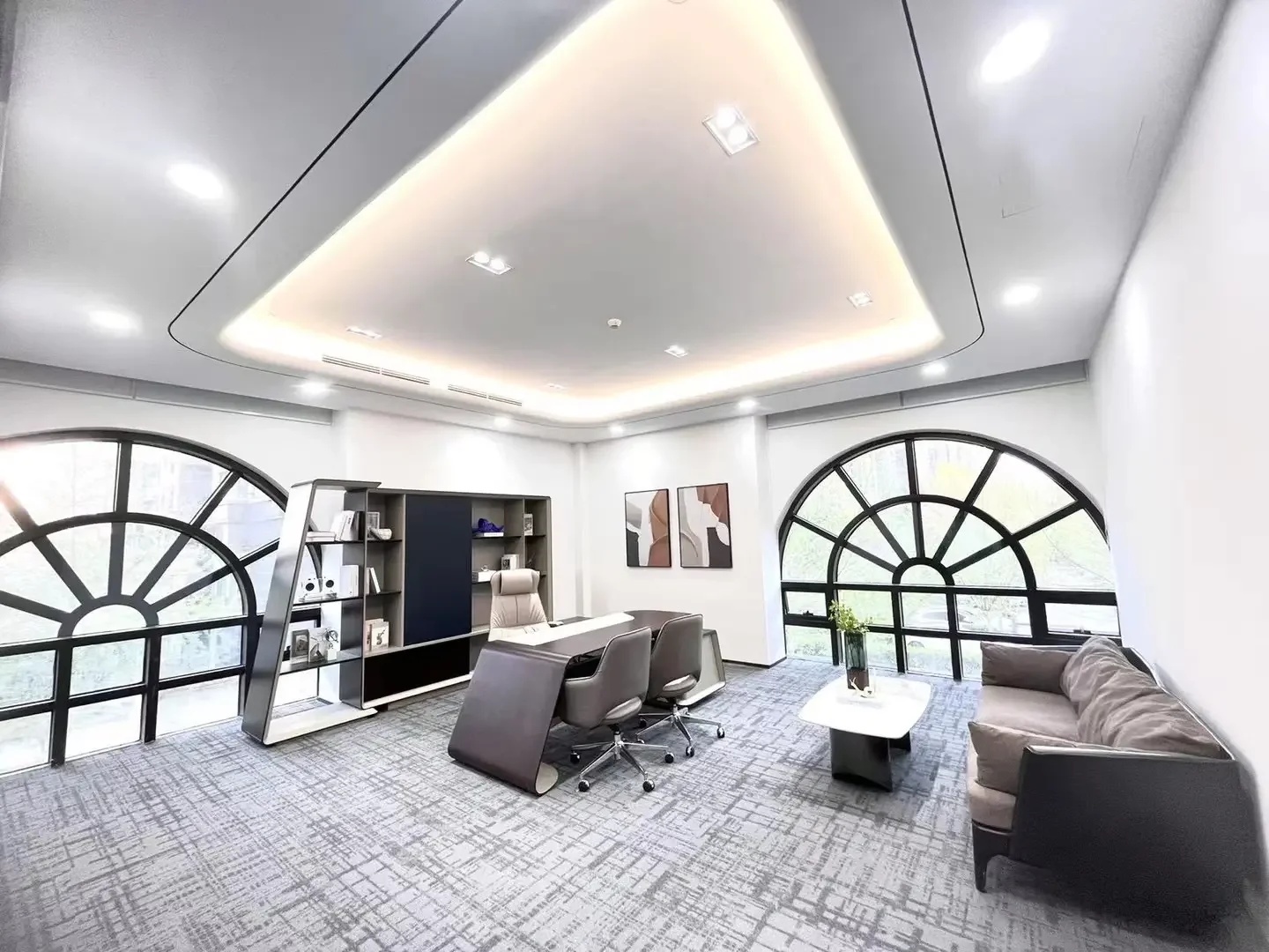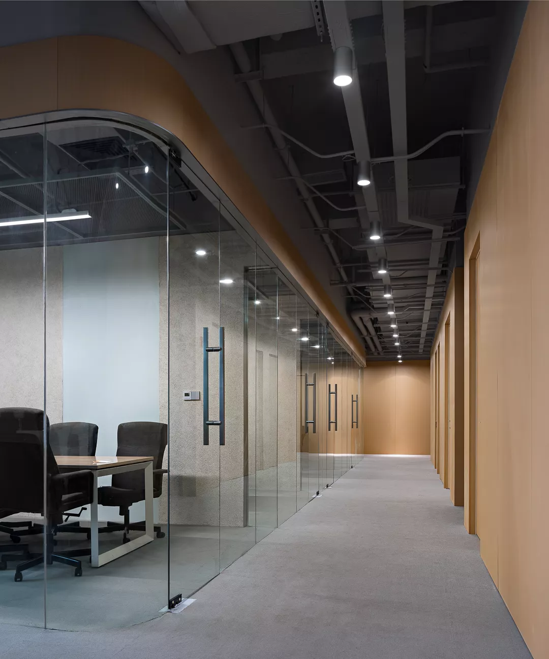 会客展示区是整个空间的视觉和功能中心,抓取宋代书画中书房氛围的神韵,通过一个独立形体的置入将整个办公室自然的划分为接待区和办公区,同时确定了室内的环形交通动线,通过挖除的设计手法来展现“书房”的基本形态,便利的行动轨迹给客人宾至如归之感。