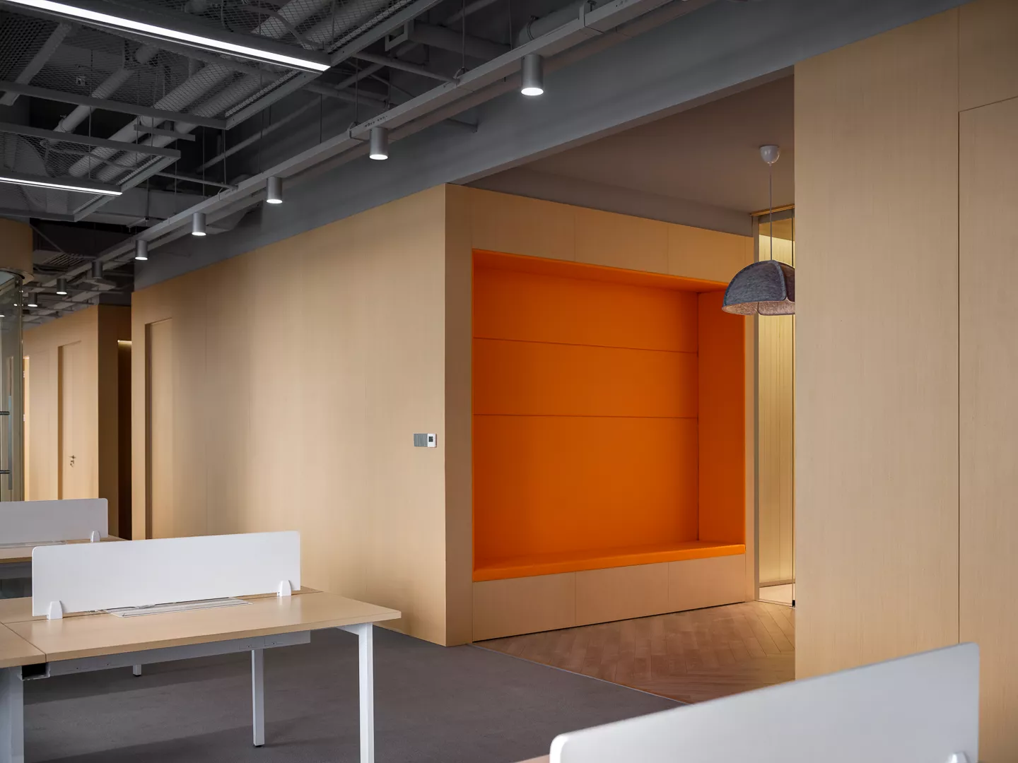 为员工提供一个多元的、健康的、具有幸福感的办公空间是猫王最关注的要素。通过自然光和户外元素的引入,让室内外空间产生交流。我们认识到压力和焦虑是限制创新和生产力的首要因素,在材料选择方面我们更加注重材料本身的性格反馈,选择更加有温度而带有自然属性的材料进行空间的装扮。原木饰面自然富有生命力,具有可被感知的温暖感;干净而又带有工业气息的浅灰色环保涂料与具有温暖和亲切感的织物和柔软材质的加入,为整个空间注入了温暖的人文元素。