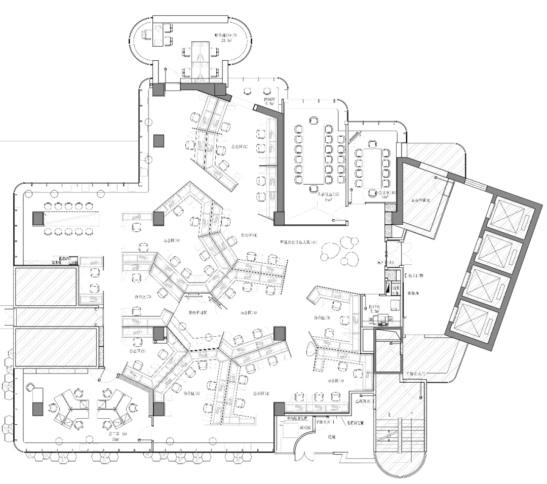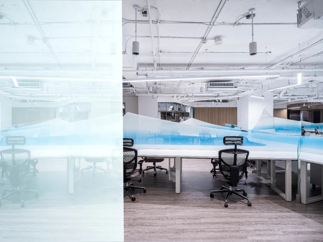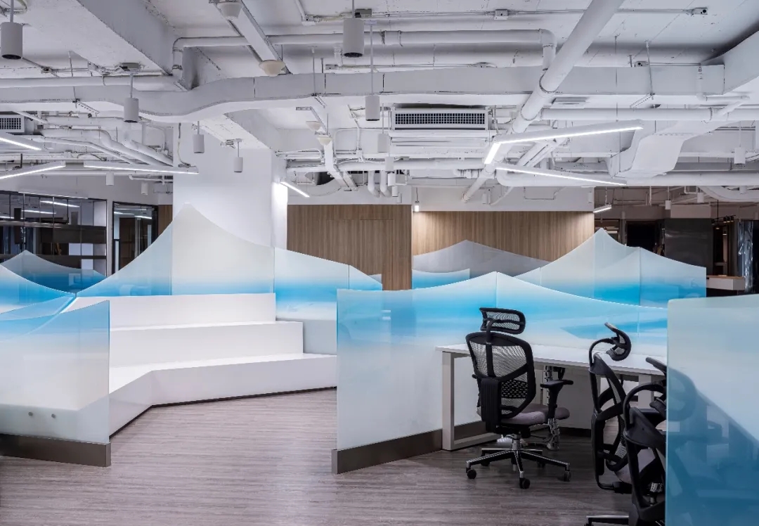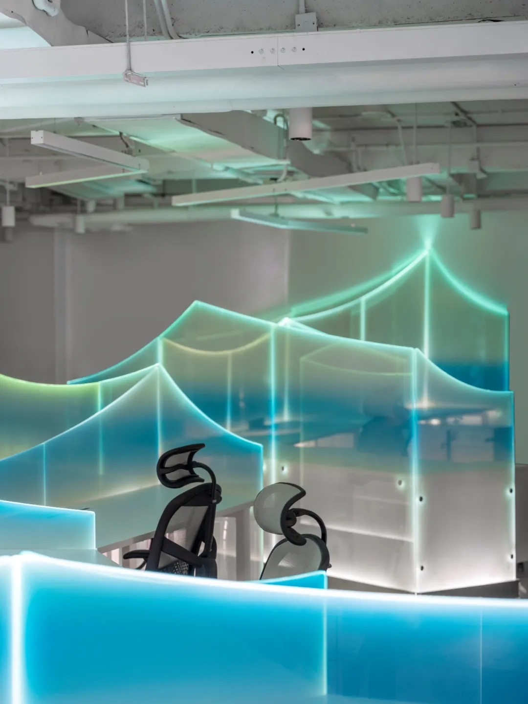 本次项目改造需要对办公空间进行合理的功能和布局规划,呈现开放、有序的办公环境。同时,结合对场地关系的理解,希望通过设计将自然景观的体验引入室内空间。平面区域上生成泰森多边形后,利用泰森多边形结构线垂直拉伸,得到围合隔断的形态。