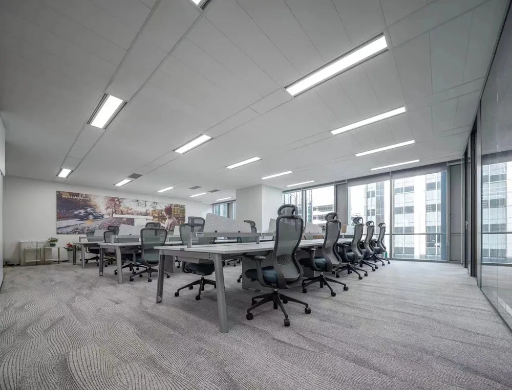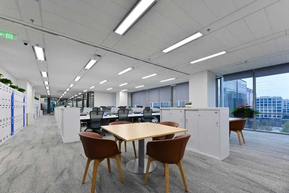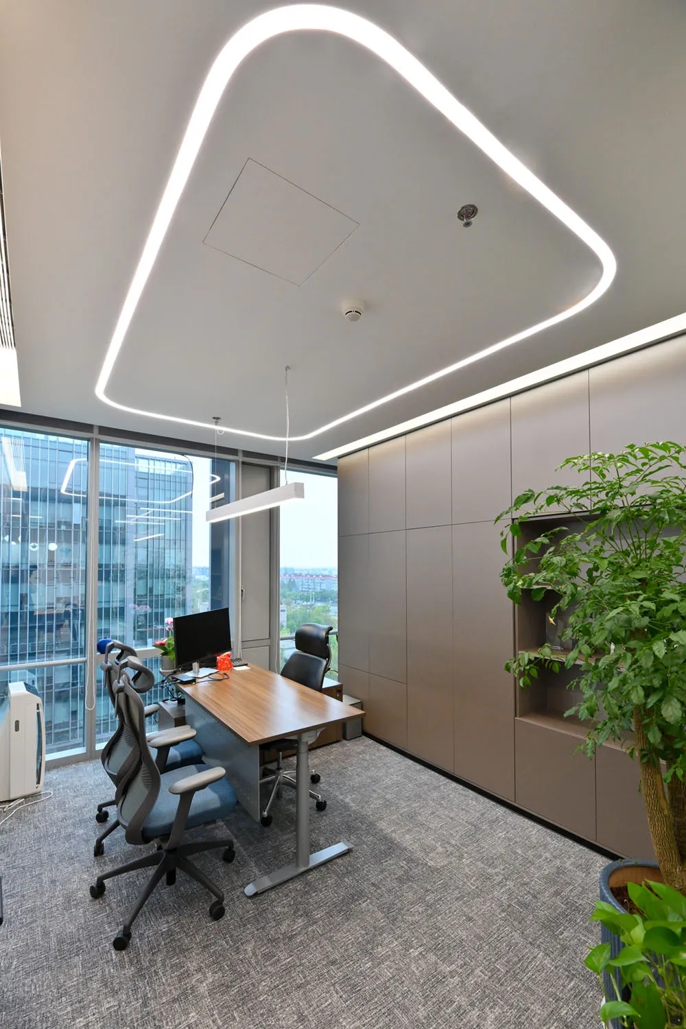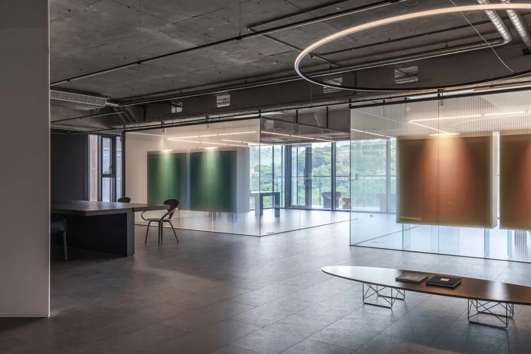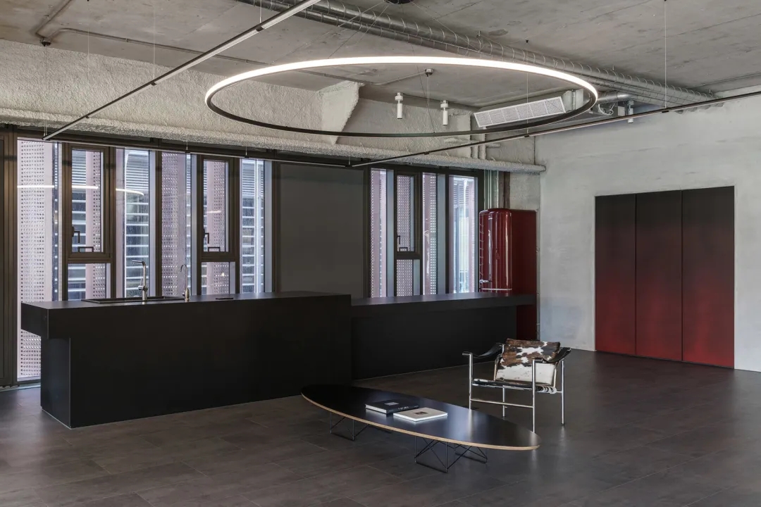 企图消弭办公座位的制式分割,释放空间至坐谈区、走道、轻透层次,将机能元件如工作台面、吧台描绘为几何块面;墙与柜体分割线如画里的隐性线条,衬托作为主体笔触的灯具与色块柜体,立体派多视角的创作符号拼组简净纯粹、宽阔驰放的中性场域。