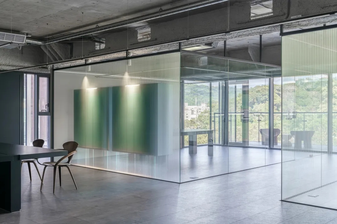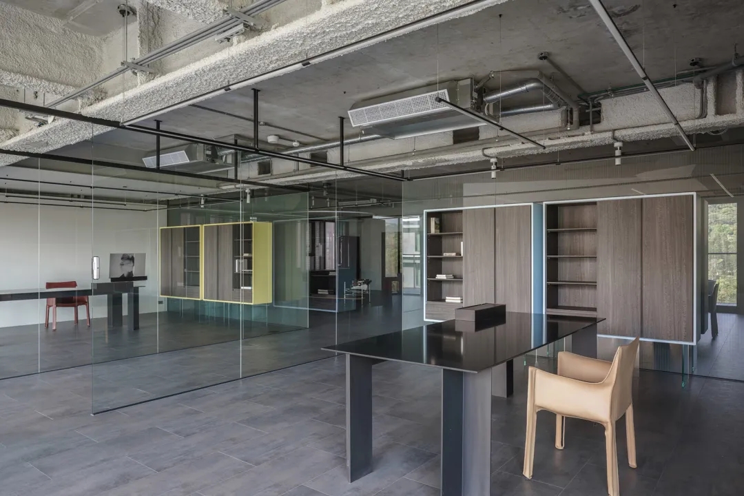 首先擒住目光的是两端俐落对称的结构画面。我们将两位合伙人的办公室视为对望的主题展间,以雕刻玻璃和清玻璃的不同透度建构朦胧迷幻的光透层次,隔间内各有两座储物柜模拟现代主义单色画作。