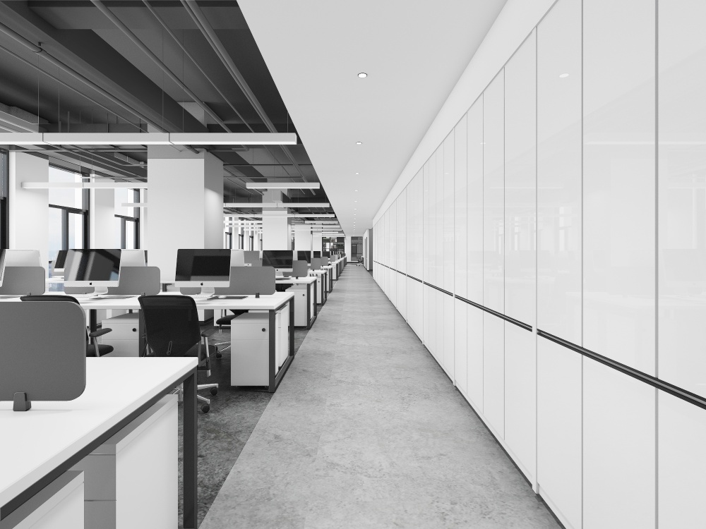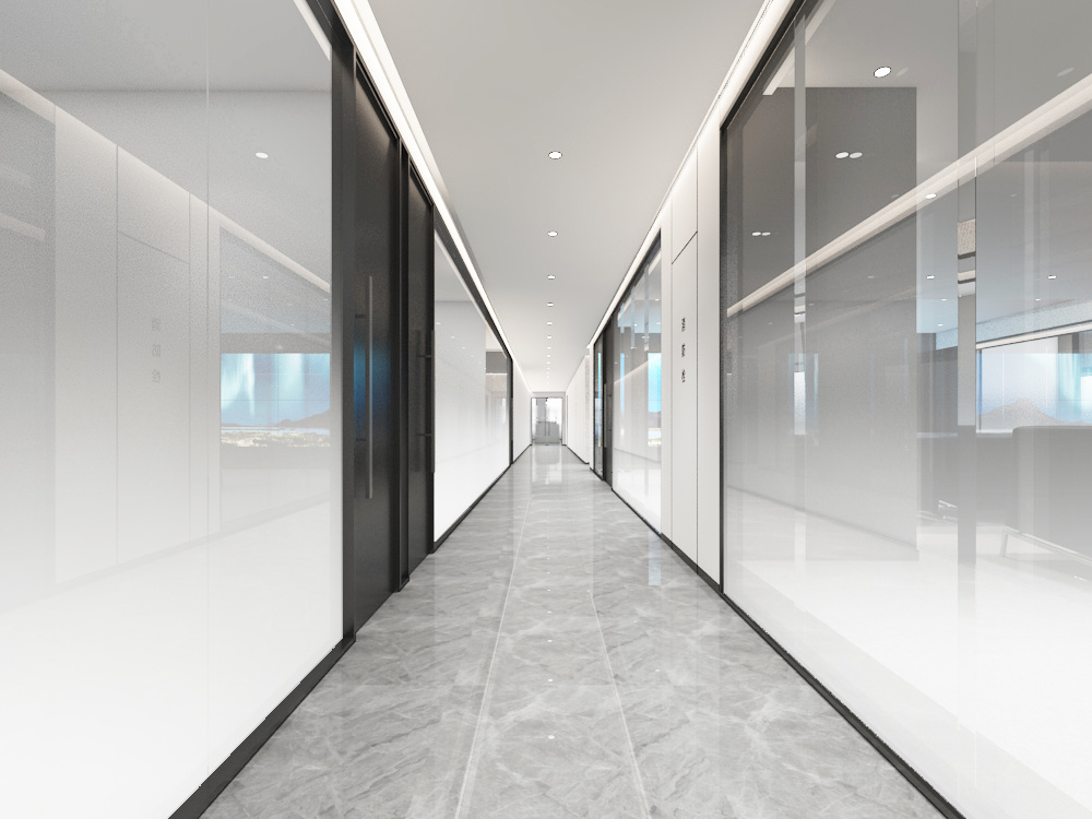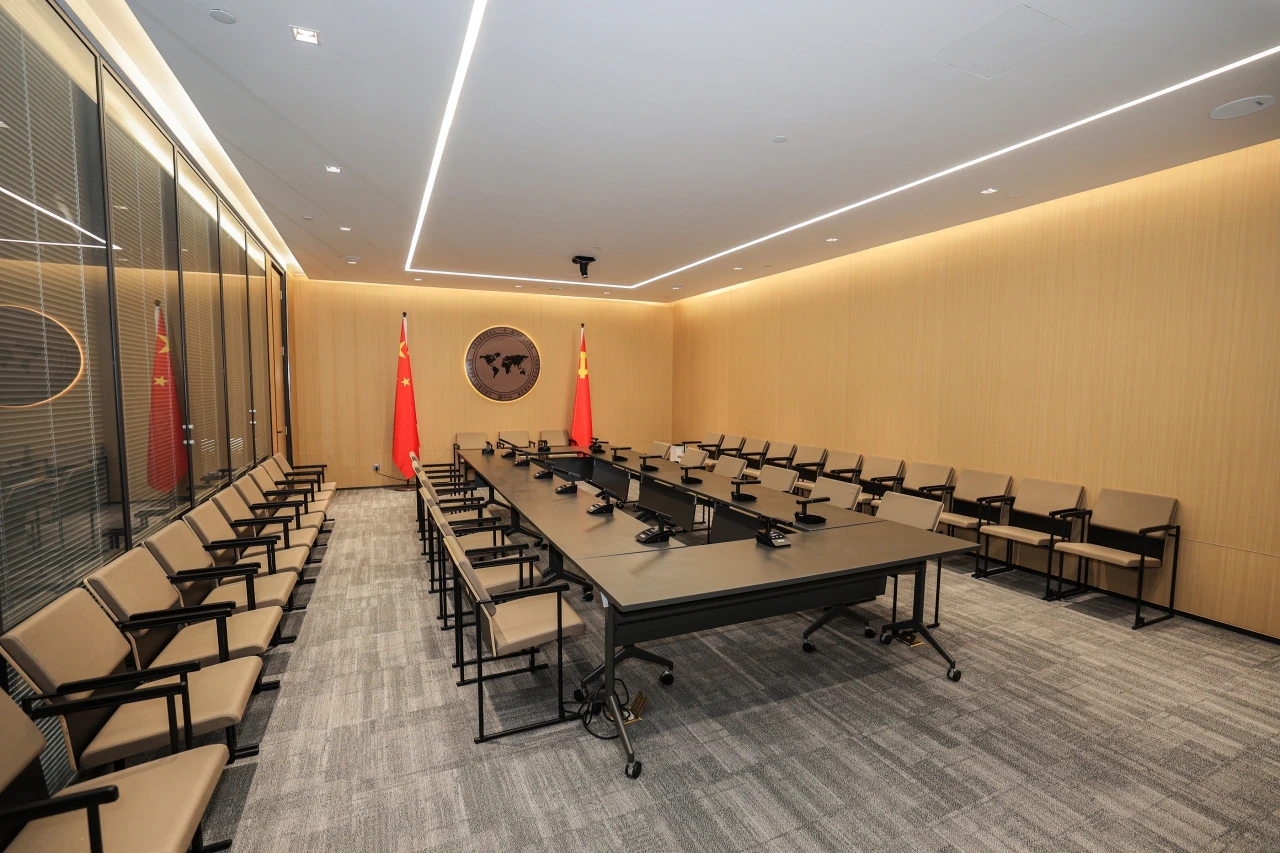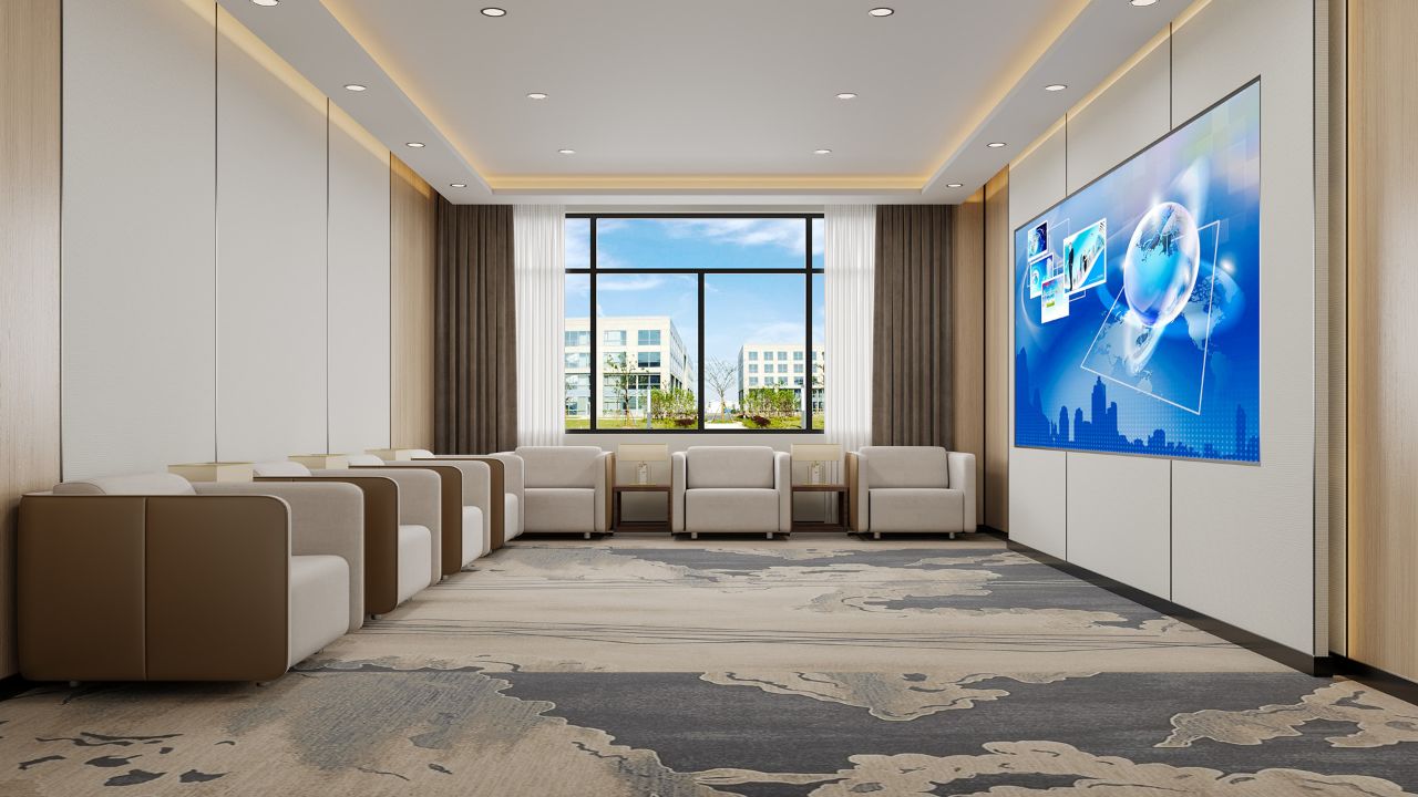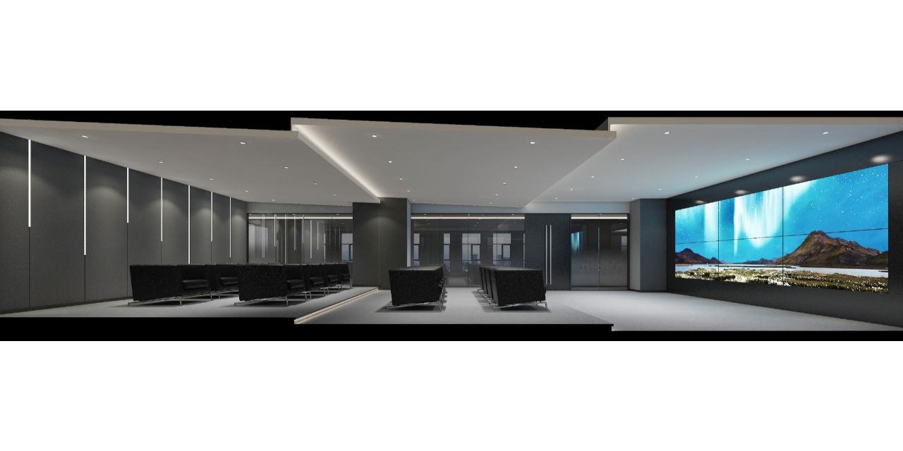 前厅结合了项目电子信息产业链的科技特点,筑构起未来、时尚的空间底色,天花吊顶造型与沙盘模型在宽阔的空间中上下承接,水波纹不锈钢压花板的镜面映像似天井一般瞩目,交织出神秘而科幻的视觉体验,让招商中心拥有科技与商务相结合的品牌调性。