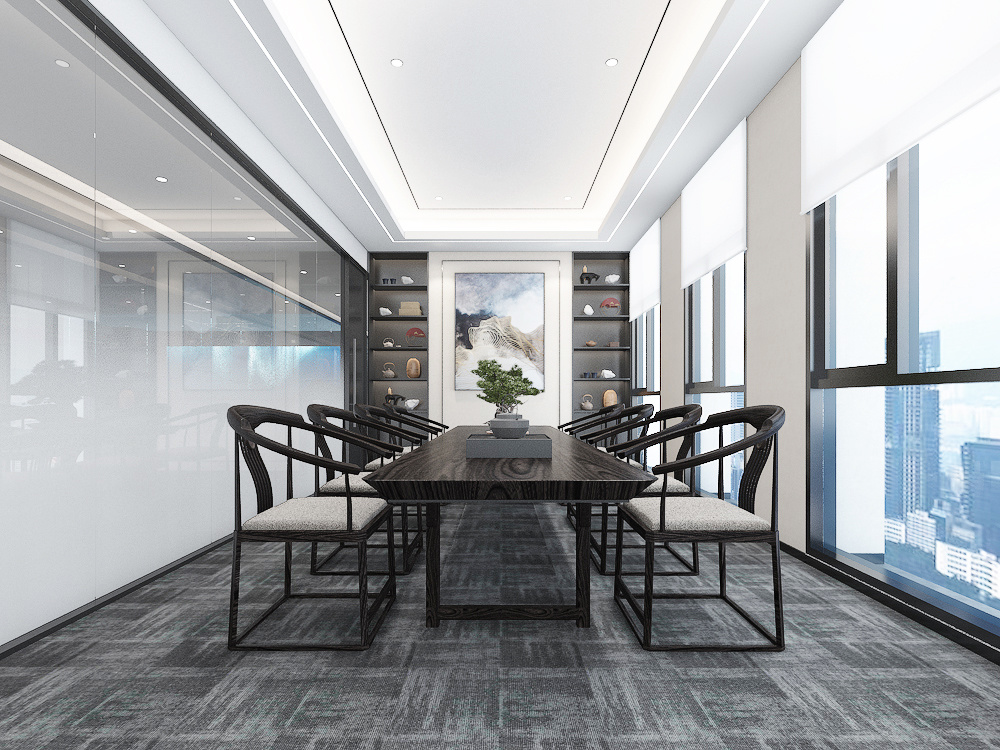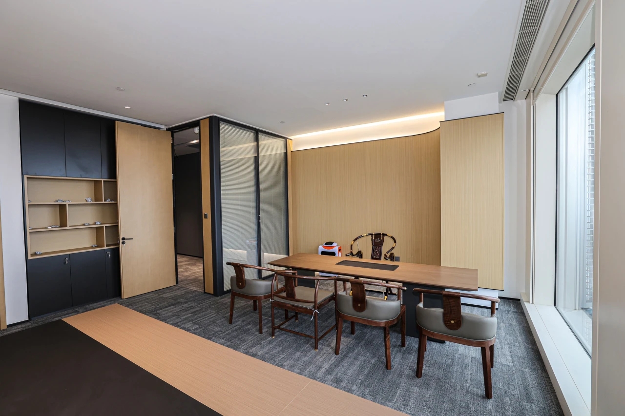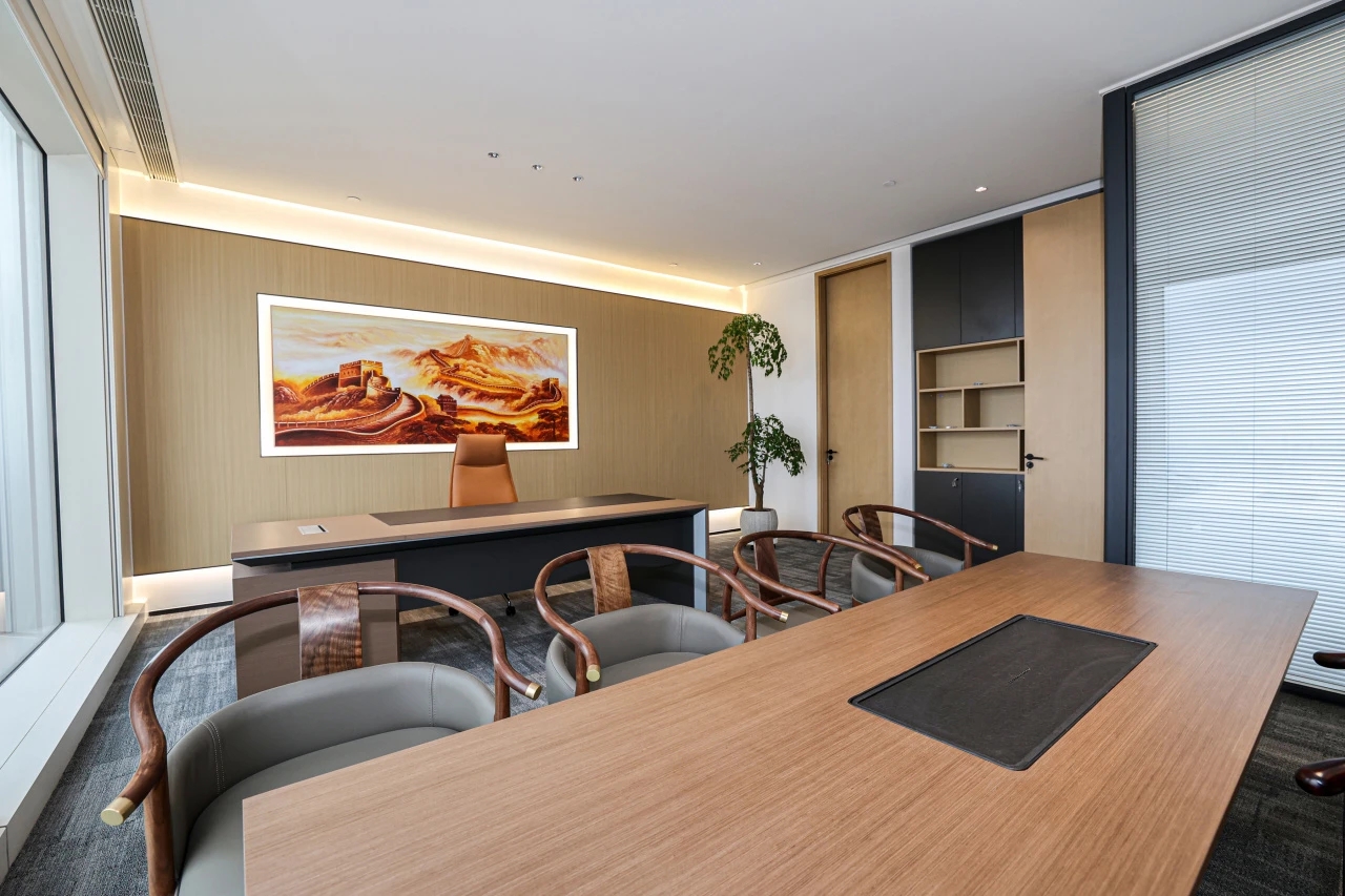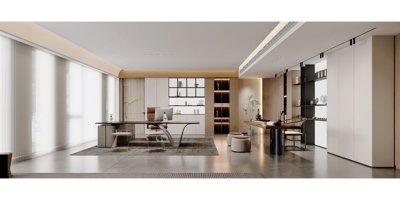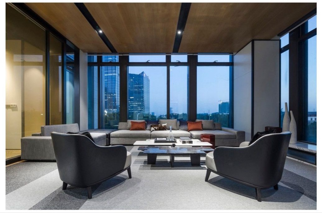 拐口入内,曲径通幽,便豁然袒露出一间宽敞明亮、动线布局流畅合理的接待场所。室内中轴备置简约木质平头长案,为其增添古人书写作画的雅致精调,实现现代与古韵相结合的空间特色;卧于窗边的软装配置舒适而敞亮,安全感满满的包围圈搭配大厦高层尊享的城市景观,令人时时喟叹于生活的忙碌和充实。