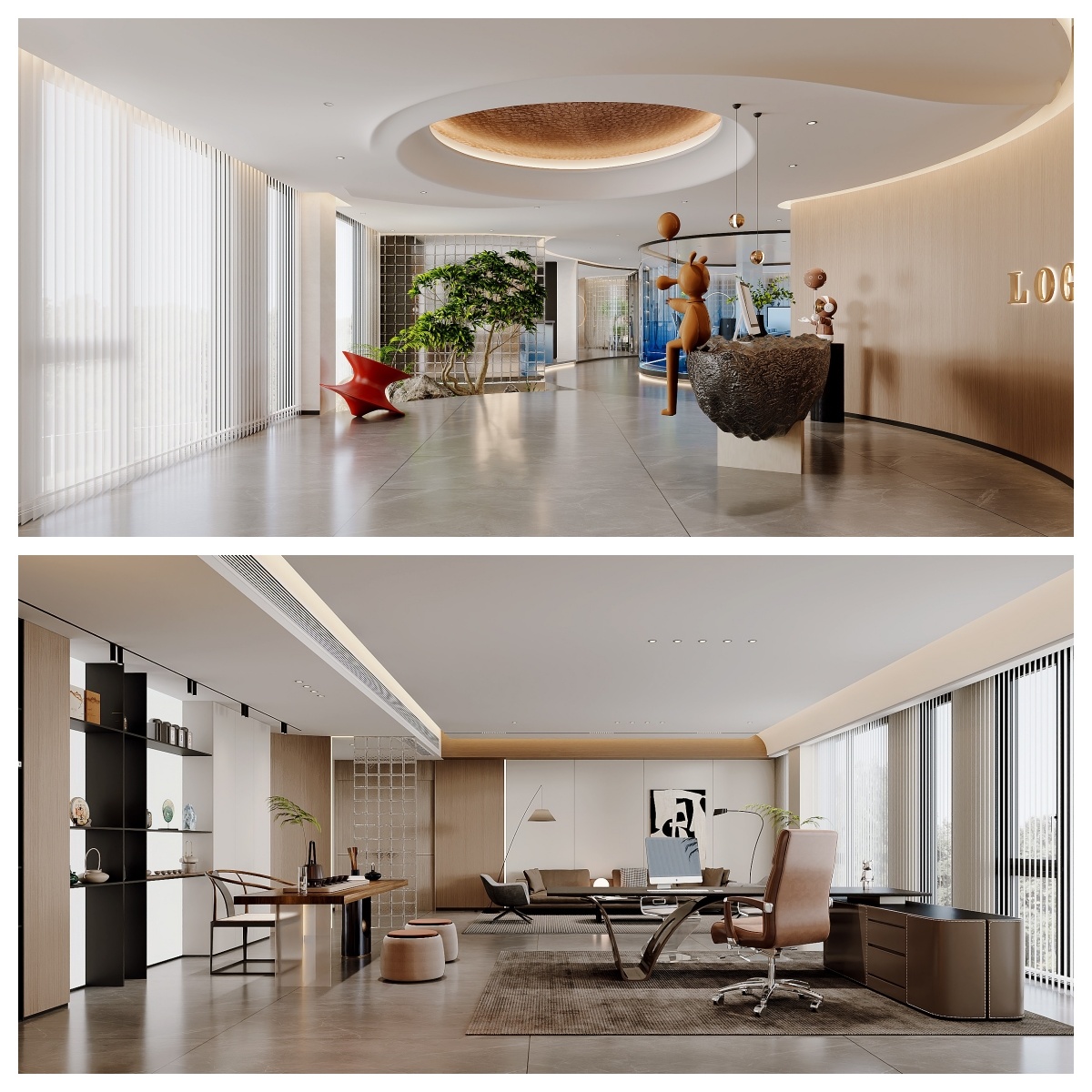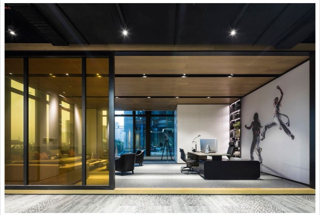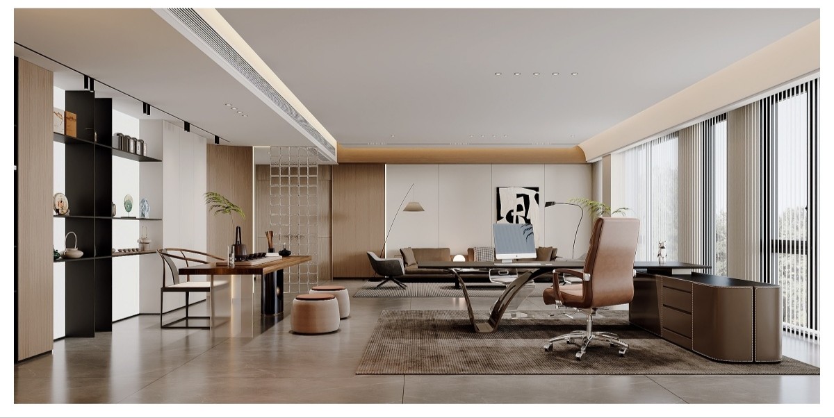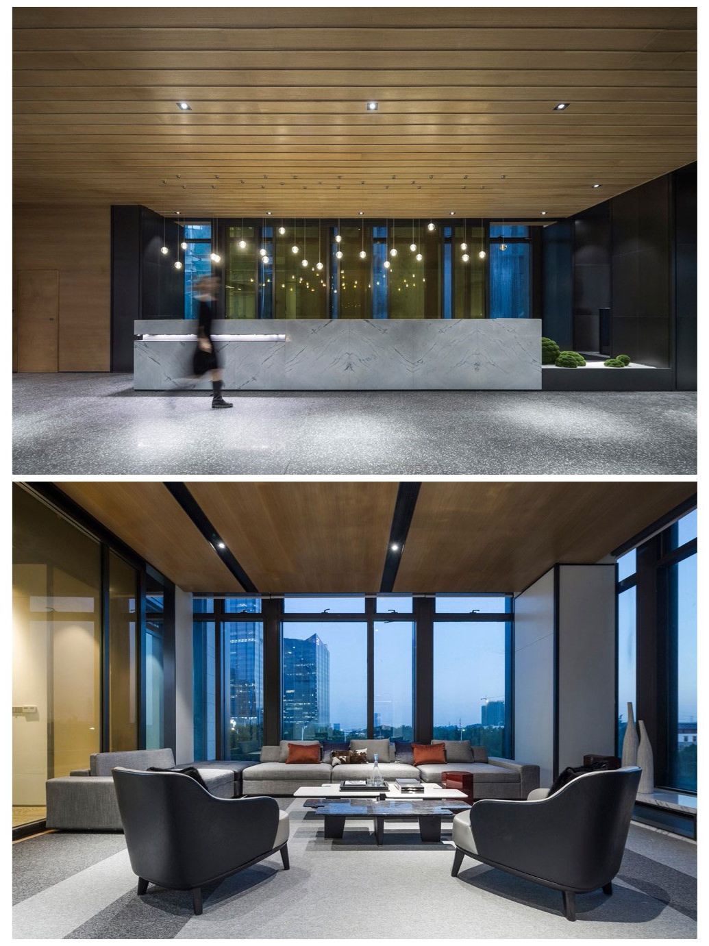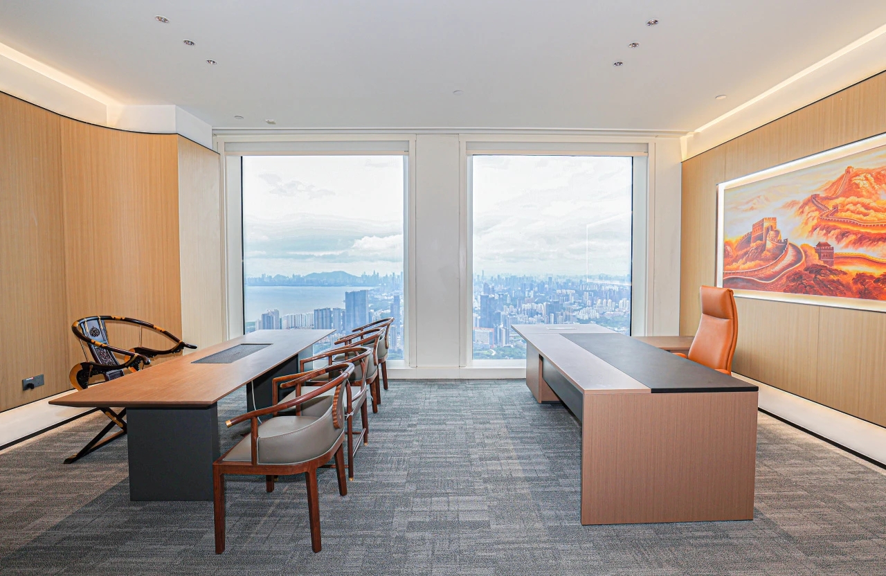 拐口入内,曲径通幽,便豁然袒露出一间宽敞明亮、动线布局流畅合理的接待场所。室内中轴备置简约木质平头长案,为其增添古人书写作画的雅致精调,实现现代与古韵相结合的空间特色;卧于窗边的软装配置舒适而敞亮,安全感满满的包围圈搭配大厦高层尊享的城市景观,令人时时喟叹于生活的忙碌和充实。